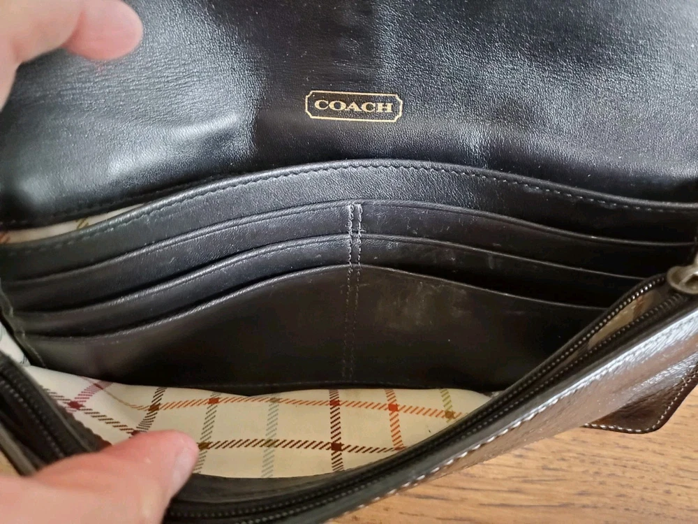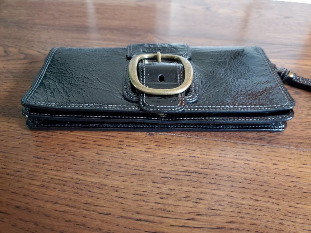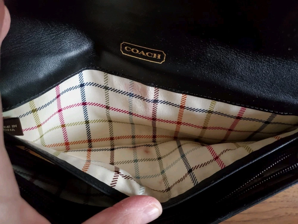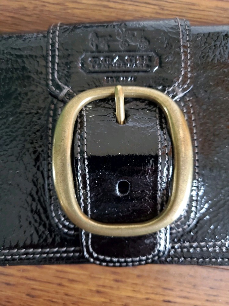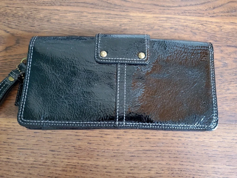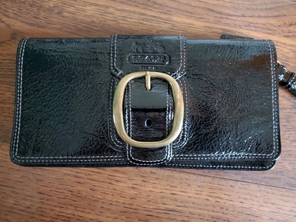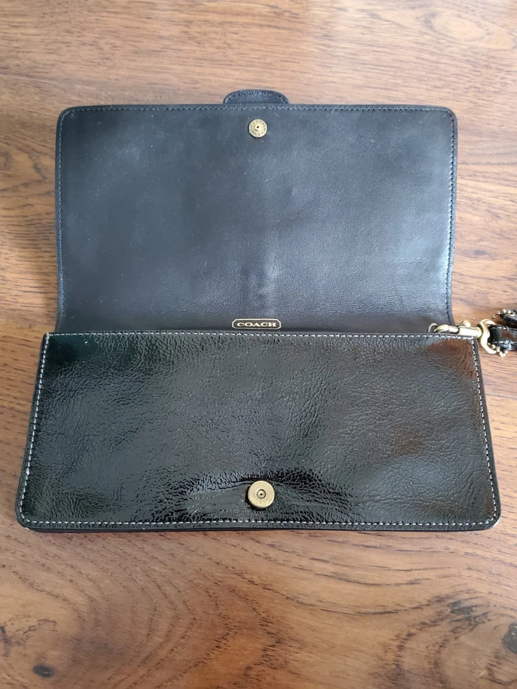 Large Shiny black leather Coach Wallet, Large 9" × 4.5", stain on the inside pictured, 6 card slot, zipper compartment, couple spots are discolored/worn (see last 3 pics), as pictured, no returns. Shipped USPS