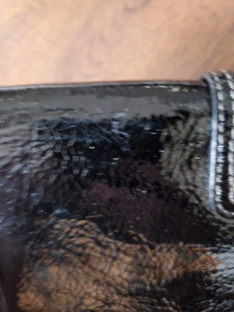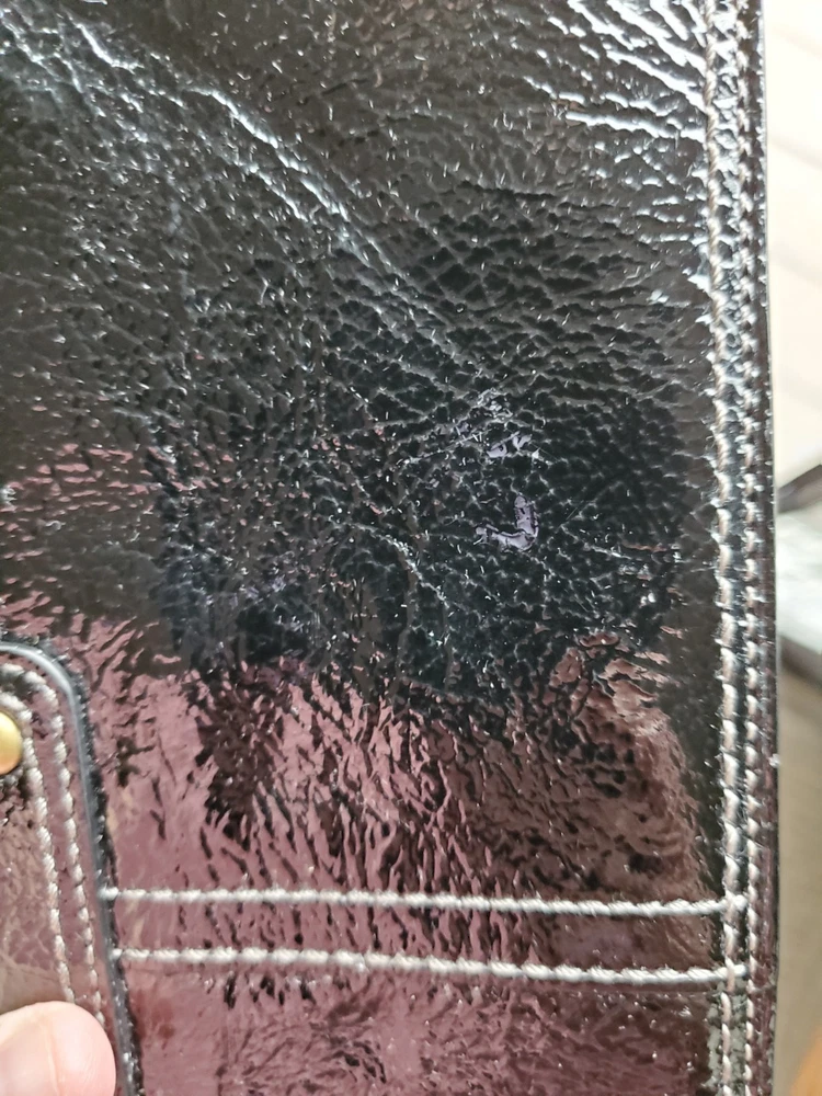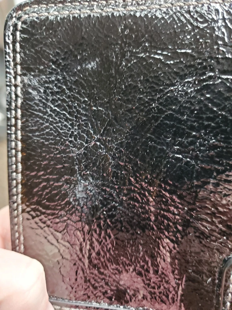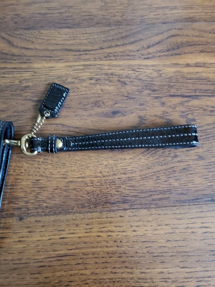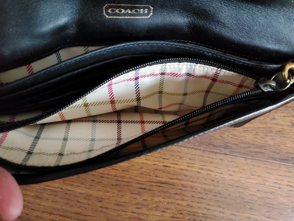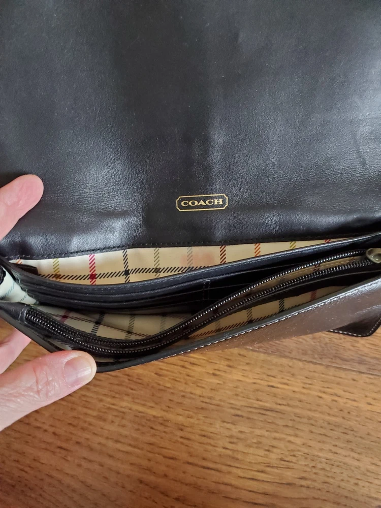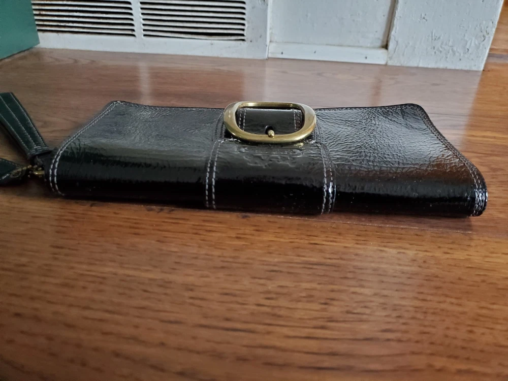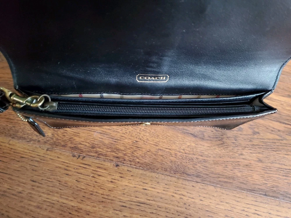 Large Shiny black leather Coach Wallet, Large 9" × 4.5", stain on the inside pictured, 6 card slot, zipper compartment, couple spots are discolored/worn (see last 3 pics), as pictured, no returns. Shipped USPS