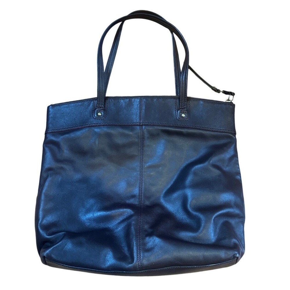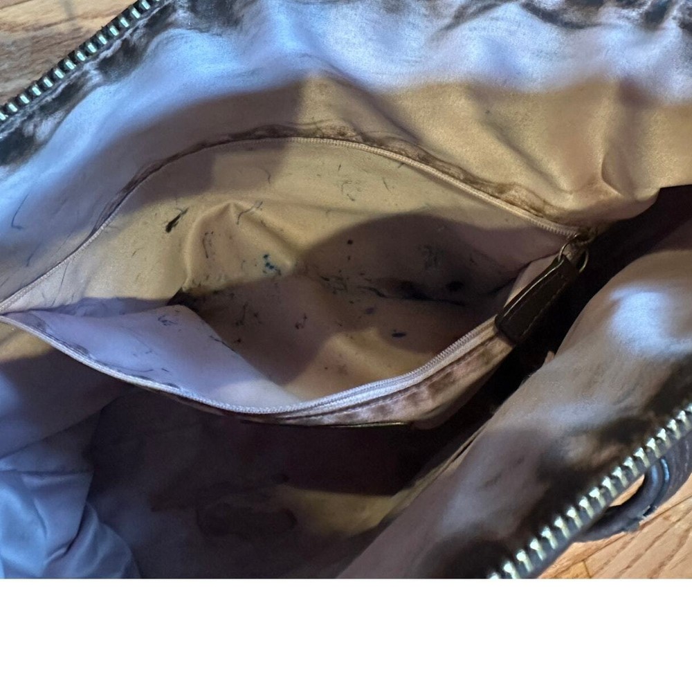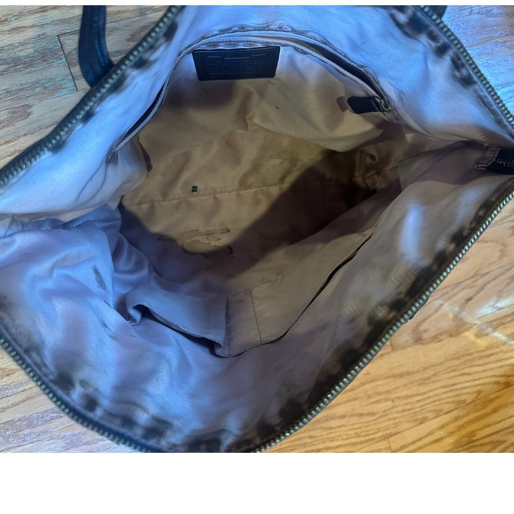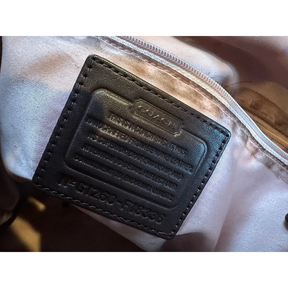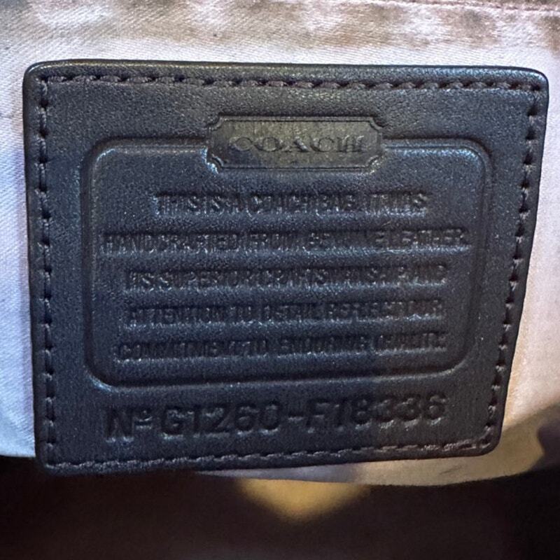 Classic Coach leather tote in brown featuring an embossed signature C logo medallion on the front. Two sturdy shoulder straps and top zip closure. Interior has light beige lining with multiple organizational pockets. The leather shows natural wear consistent with age and use, giving it a lovely vintage patina. Spacious main compartment perfect for everyday essentials. Model number F18336. Made of genuine leather with hardware. Interior has some marks and wear but remains fully functional. Straps are sturdy with no cracking or damage. A timeless Coach style that works well for both casual and professional settings. Keywords: Coach, black leather, tote bag, signature logo, embossed, shoulder bag, vintage Coach, F18336, silver hardware, zip closure