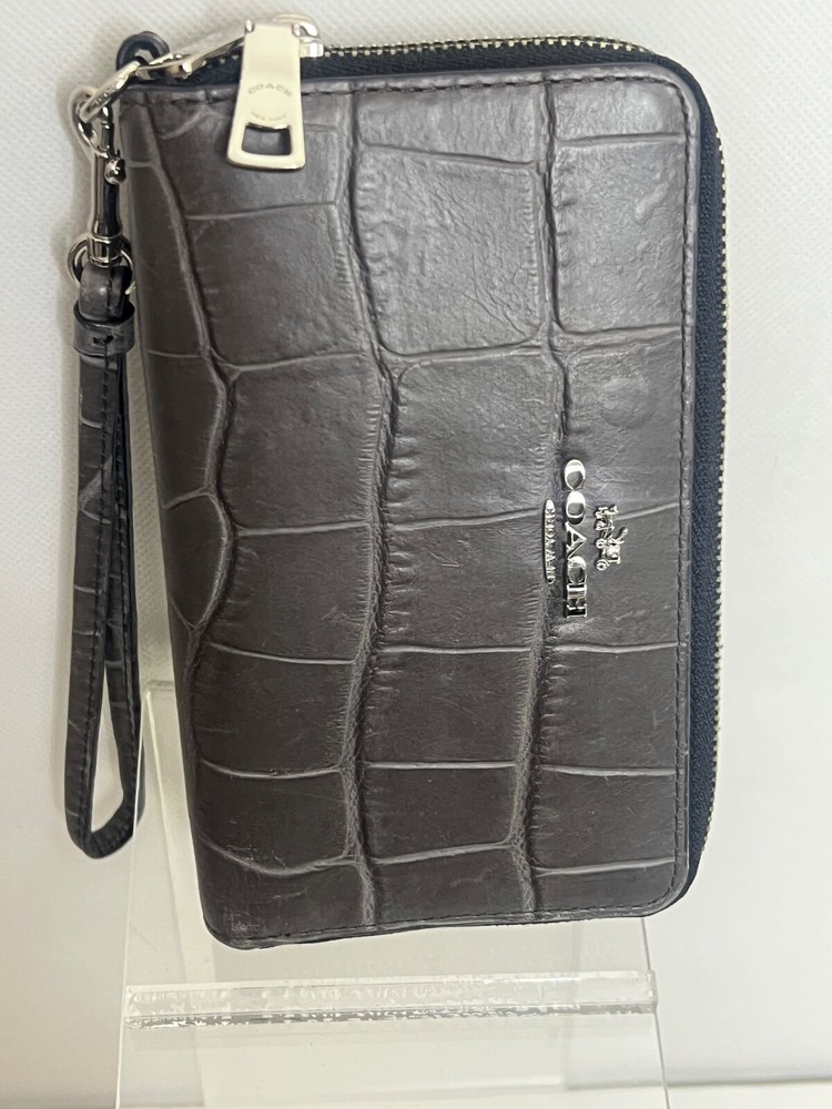 Coach Textured Leather Accordion Zip Wallet With Wristlet Strap Brown With Black Interior Silver Hardware 6 inches in length 3 3/4 inches width Good condition Proceeds from the sale of this item benefits Floyd Felines Animal Rescue in Rome GA a 501c3 non profit organization.