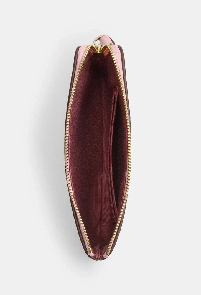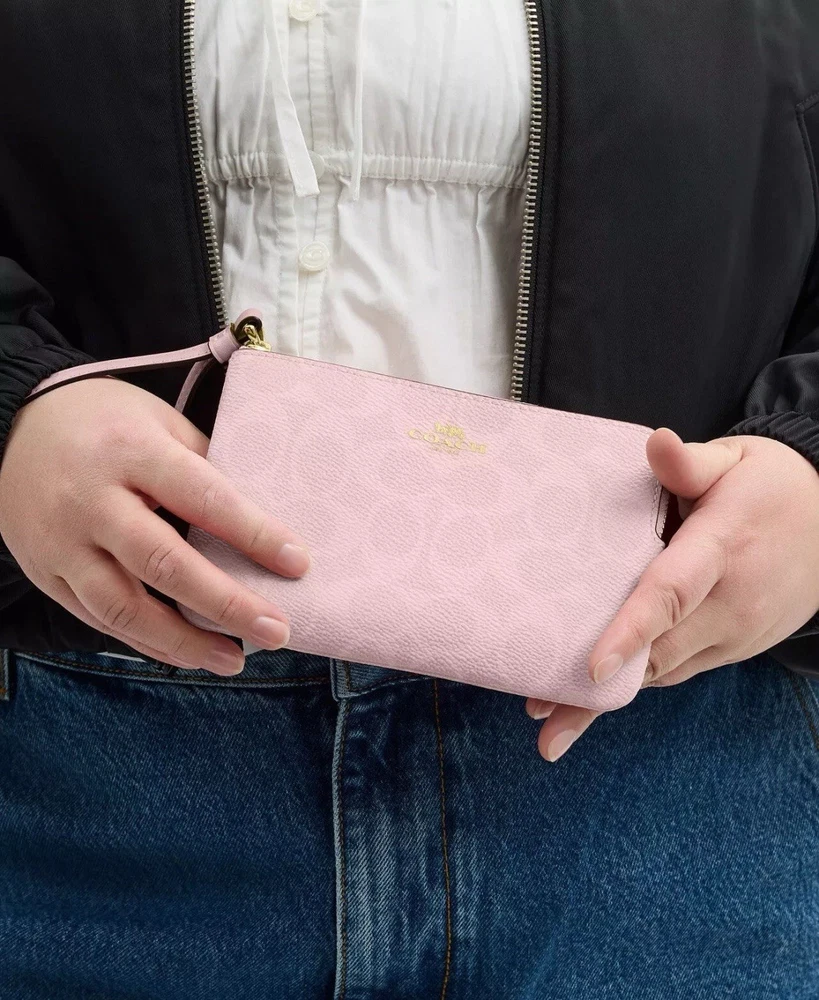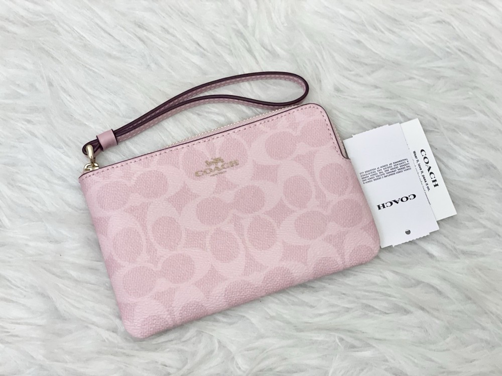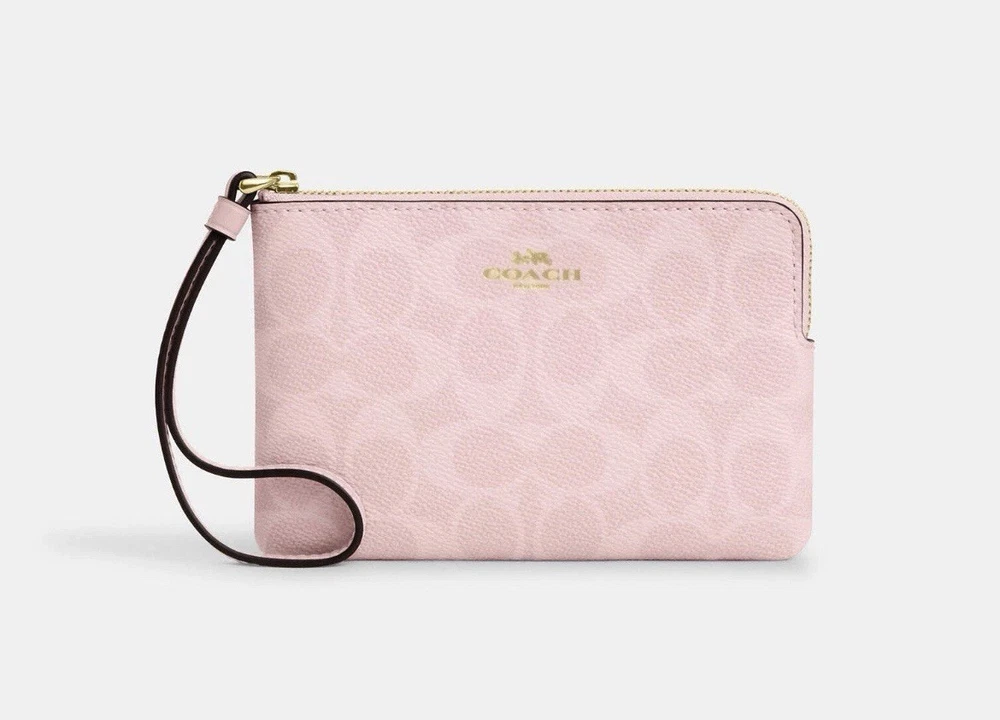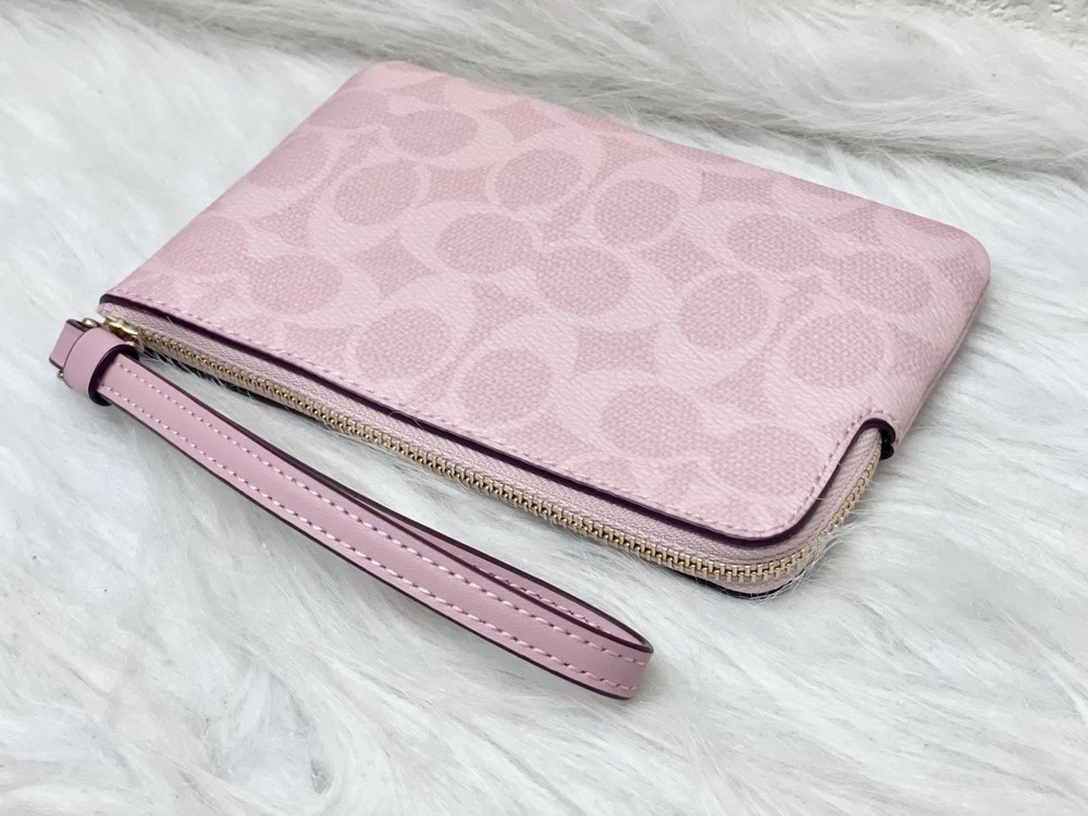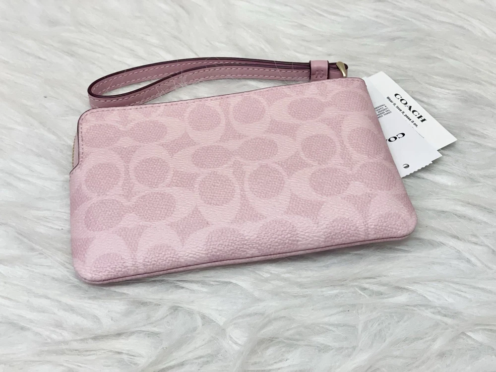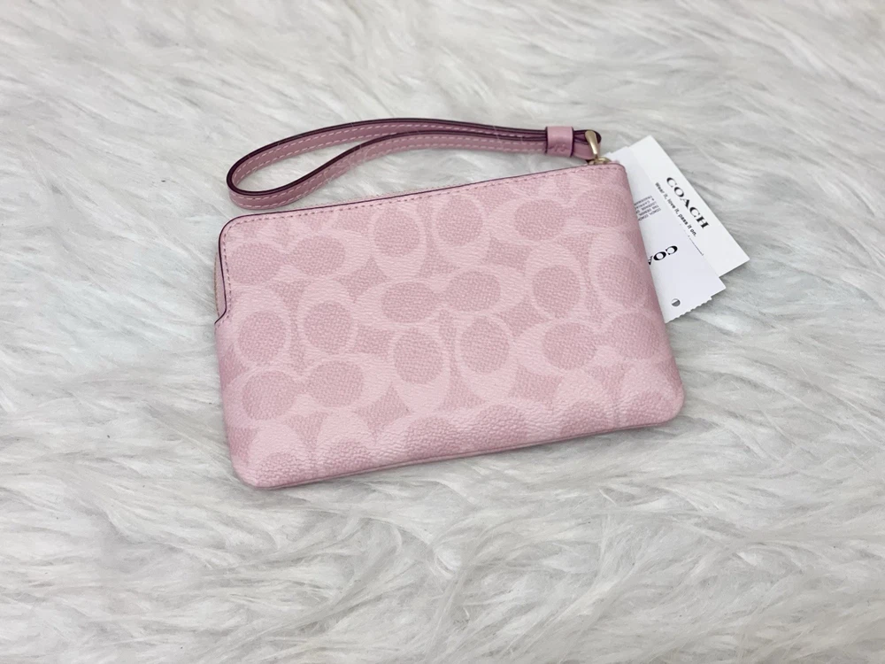 Coach Corner Zip Wristlet In Signature Canvas in Powder pink Color: powder pink 100% Authentic Style Number: CAQ75 Measurements Length: 6.25" Height: 4.5" Width: 0.5" Materials Signature coated canvas Fabric lining Features Two credit card slots Zip-top closure Price is firm