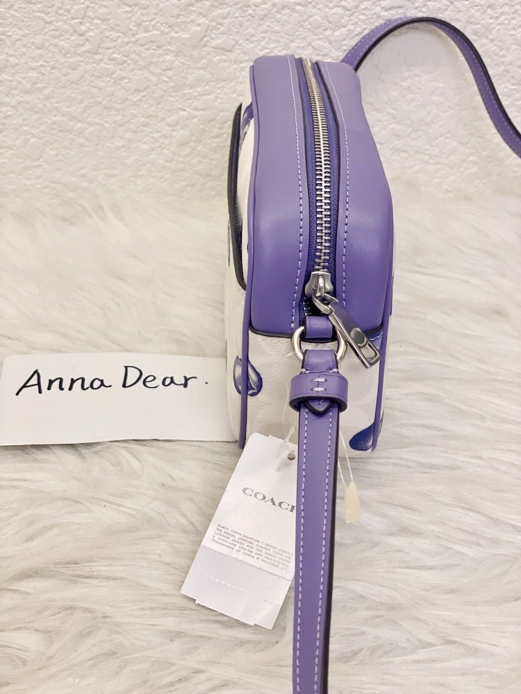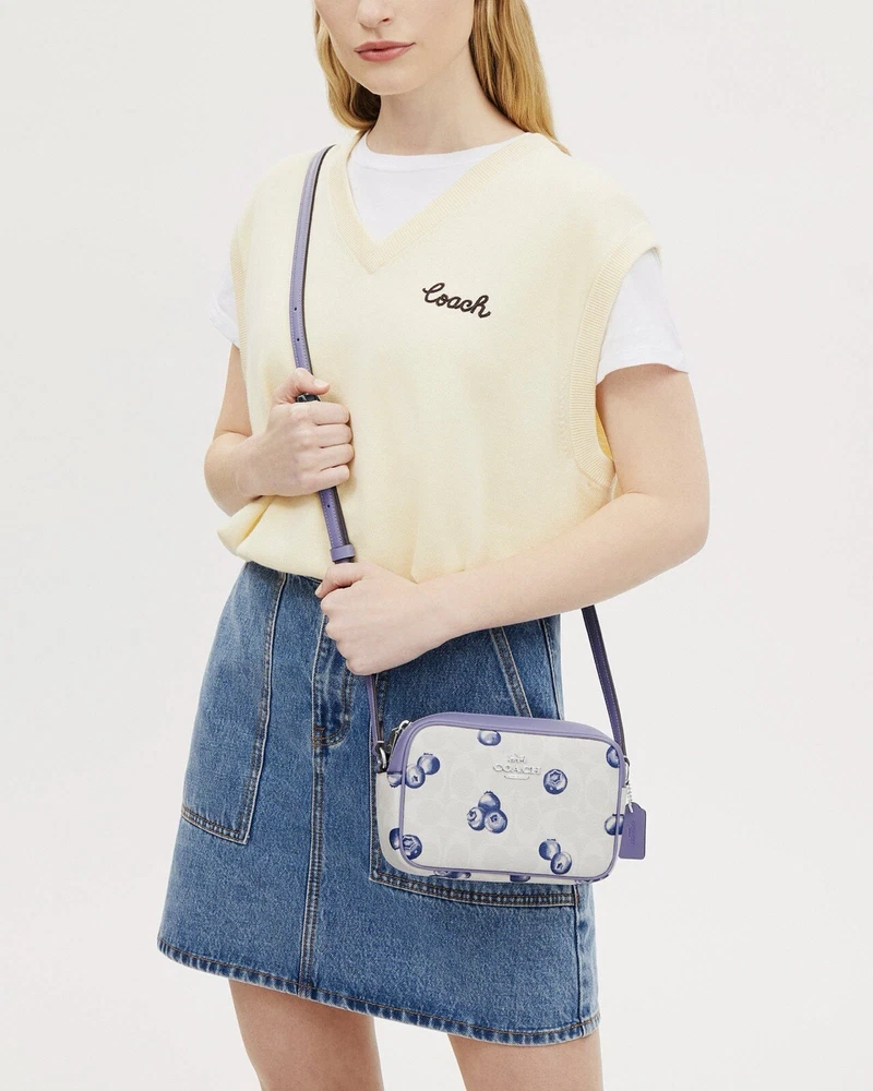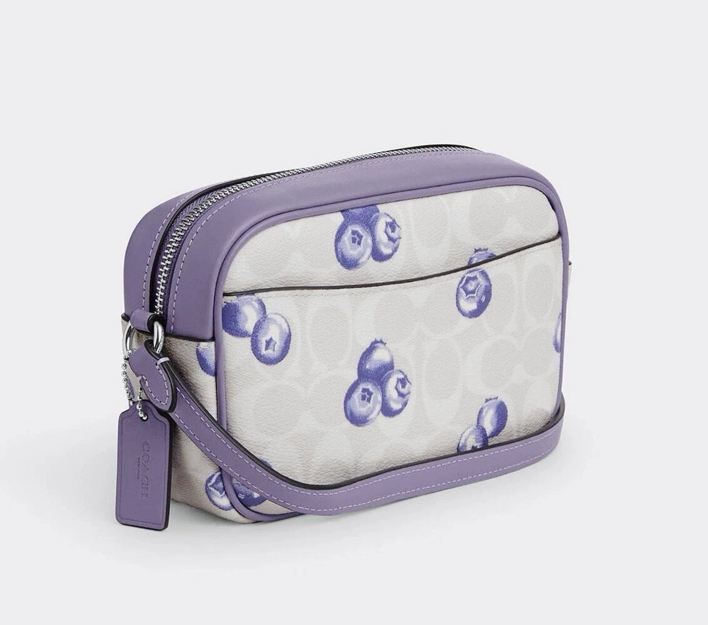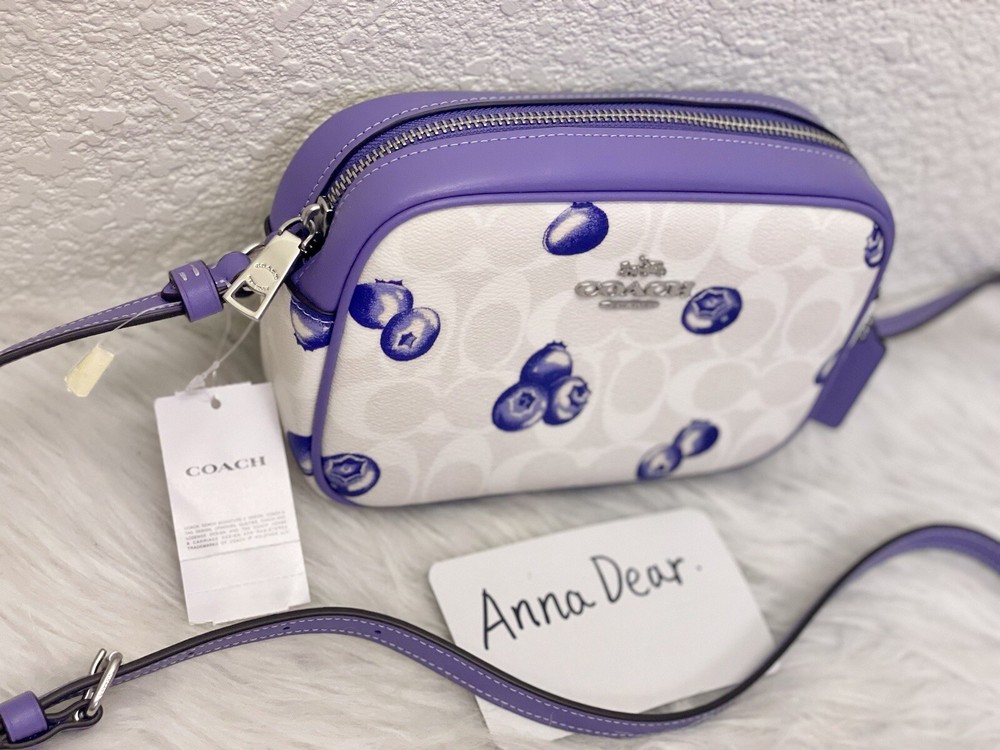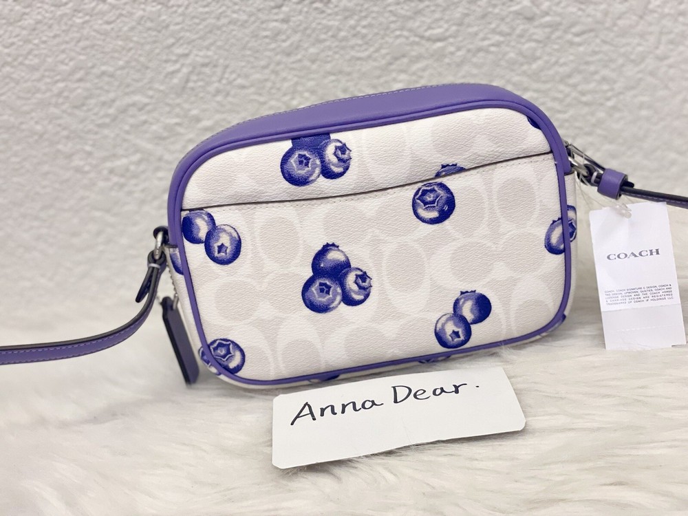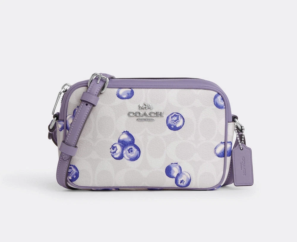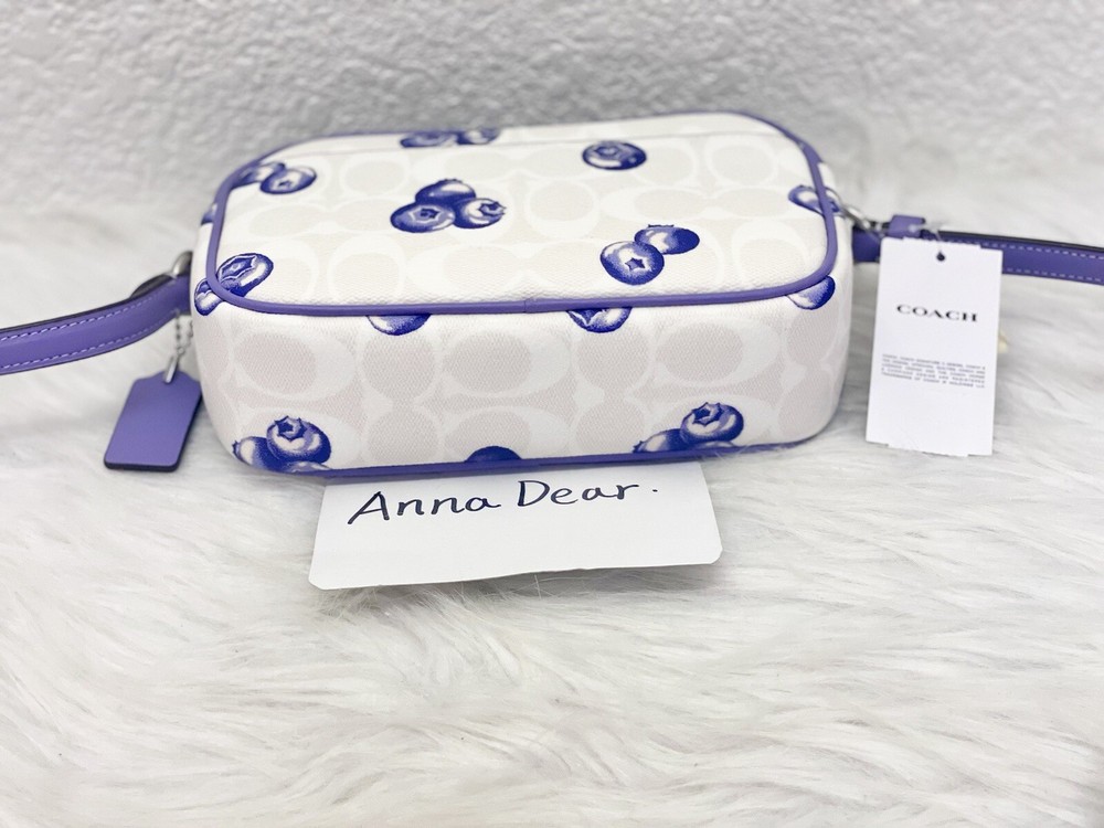 Coach Mini Jamie Camera Bag In Signature Canvas With Blueberry Print Brand new with tags 100% Authentic Limited Edition Product Details Color: Signature Canvas/Silver/Chalk/Light Violet Style Number CR176 Measurements Length: 7.75" Height: 5.0" Width: 2.5" Materials Signature coated canvas and smooth leather Fabric lining Strap Adjustable strap with 22.5" drop Features Outside open pocket Inside multifunction pocket Two credit card slots Zip closure