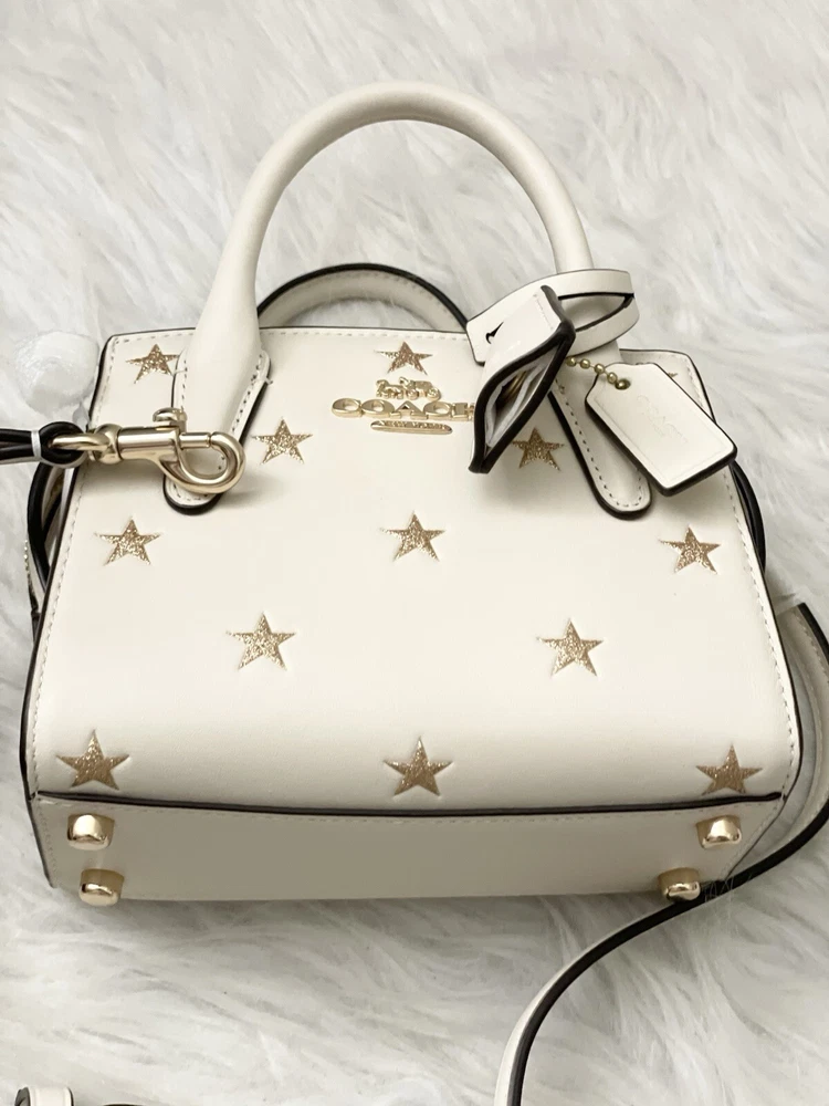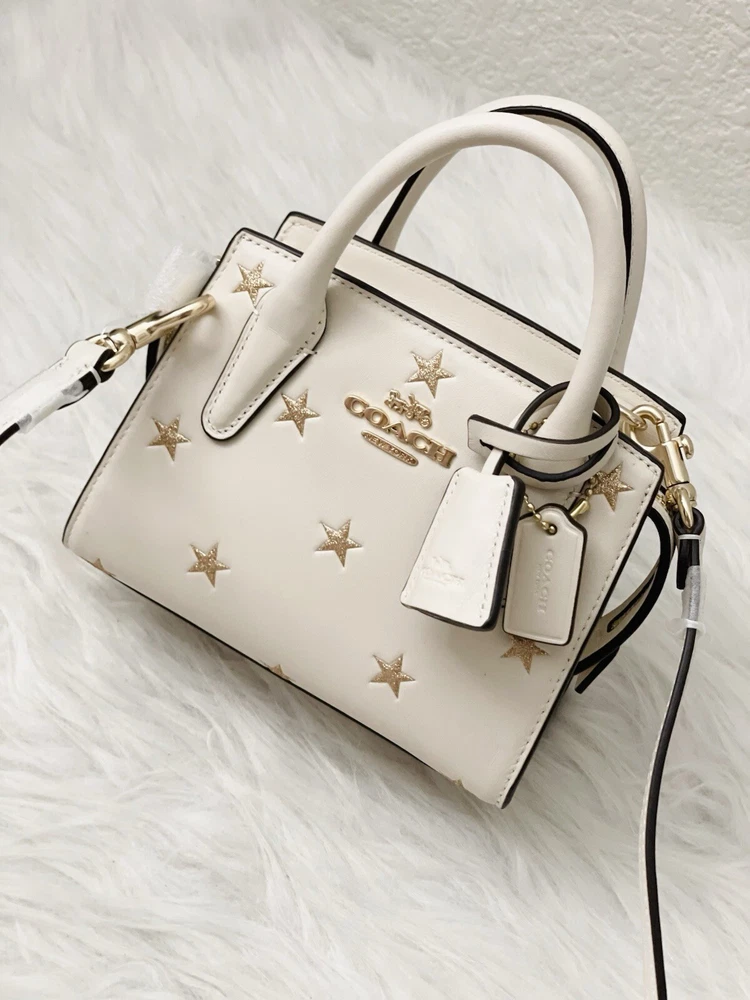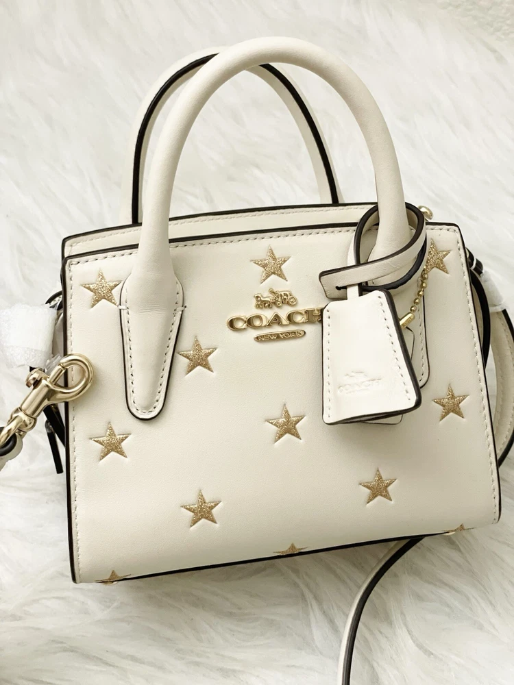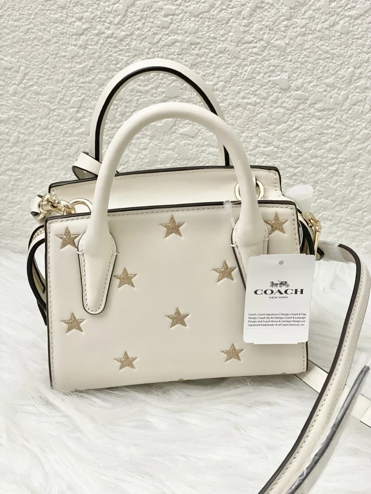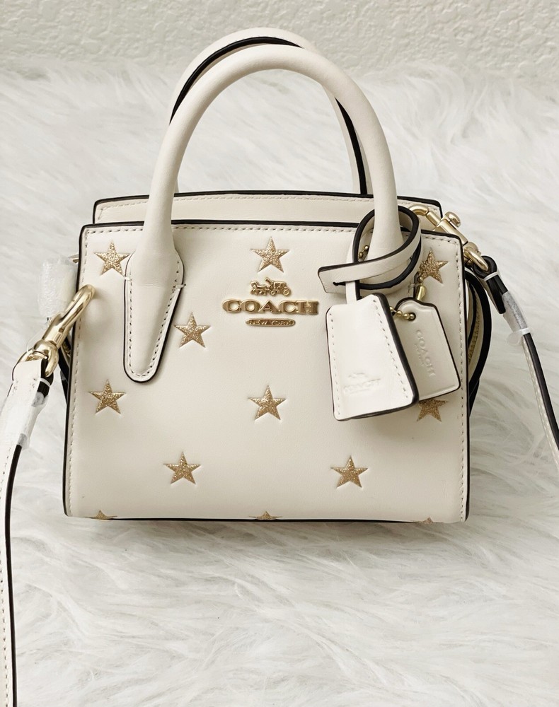 Coach Andrea Mini Carryall Bag With Star Print Brand New with tags 100% Authentic Style Number CW306 Measurements Length: 6.0" Height: 4.5" Width: 3.25" Materials Refined calf leather Fabric lining Handle Handles with 2" drop Strap Detachable strap with 22.75" drop for shoulder or crossbody wear Features Inside multifunction pocket Zip closure Four protective feet at base