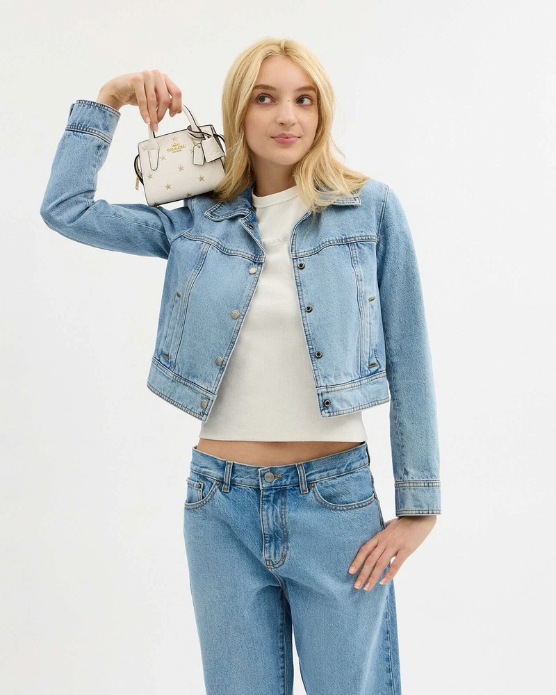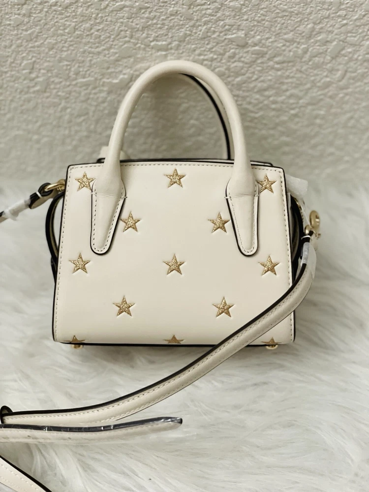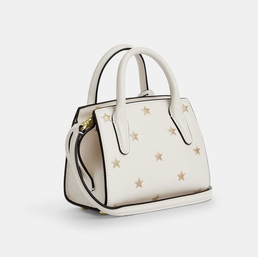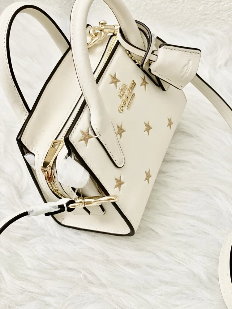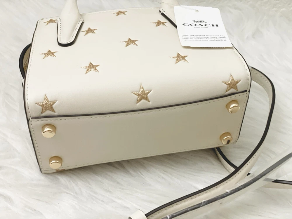 Coach Andrea Mini Carryall Bag With Star Print Brand New with tags 100% Authentic Style Number CW306 Measurements Length: 6.0" Height: 4.5" Width: 3.25" Materials Refined calf leather Fabric lining Handle Handles with 2" drop Strap Detachable strap with 22.75" drop for shoulder or crossbody wear Features Inside multifunction pocket Zip closure Four protective feet at base