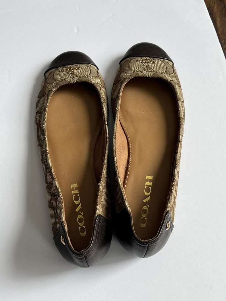 These Coach Chelsea flats for women are a size 7 and feature a tan fabric with brown leather detailing. They are slip-on ballet-style shoes with a solid pattern. The upper material is leather with a fabric lining and leather insole for comfort. The outsole is made of leather, and they have a B width. The design includes the Coach logo accents, making them suitable for travel, casual, and business occasions. Small scuffle on the front as it show on picture