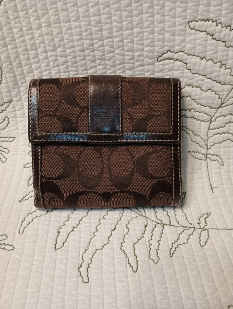 Experience the seamless blend of sophistication and functionality with this Coach women's trifold wallet. Crafted from a rich blend of leather and cotton, it promises durability and a touch of luxury to your everyday essentials. The classic brown hue offers versatility, ensuring it complements any ensemble.This wallet features a well-organized design, perfect for those who appreciate both style and practicality. Handmade with attention to detail, it embodies the quality and craftsmanship synonymous with the Coach brand. Keep your cards, cash, and coins neatly tucked away in this elegant accessory.