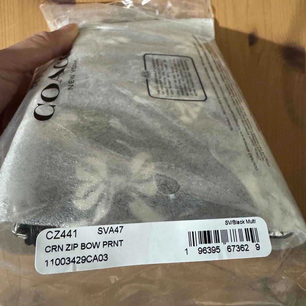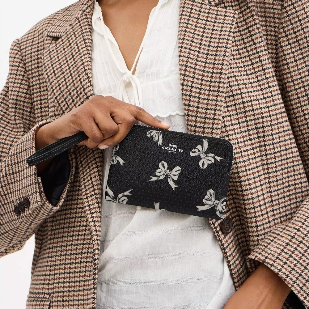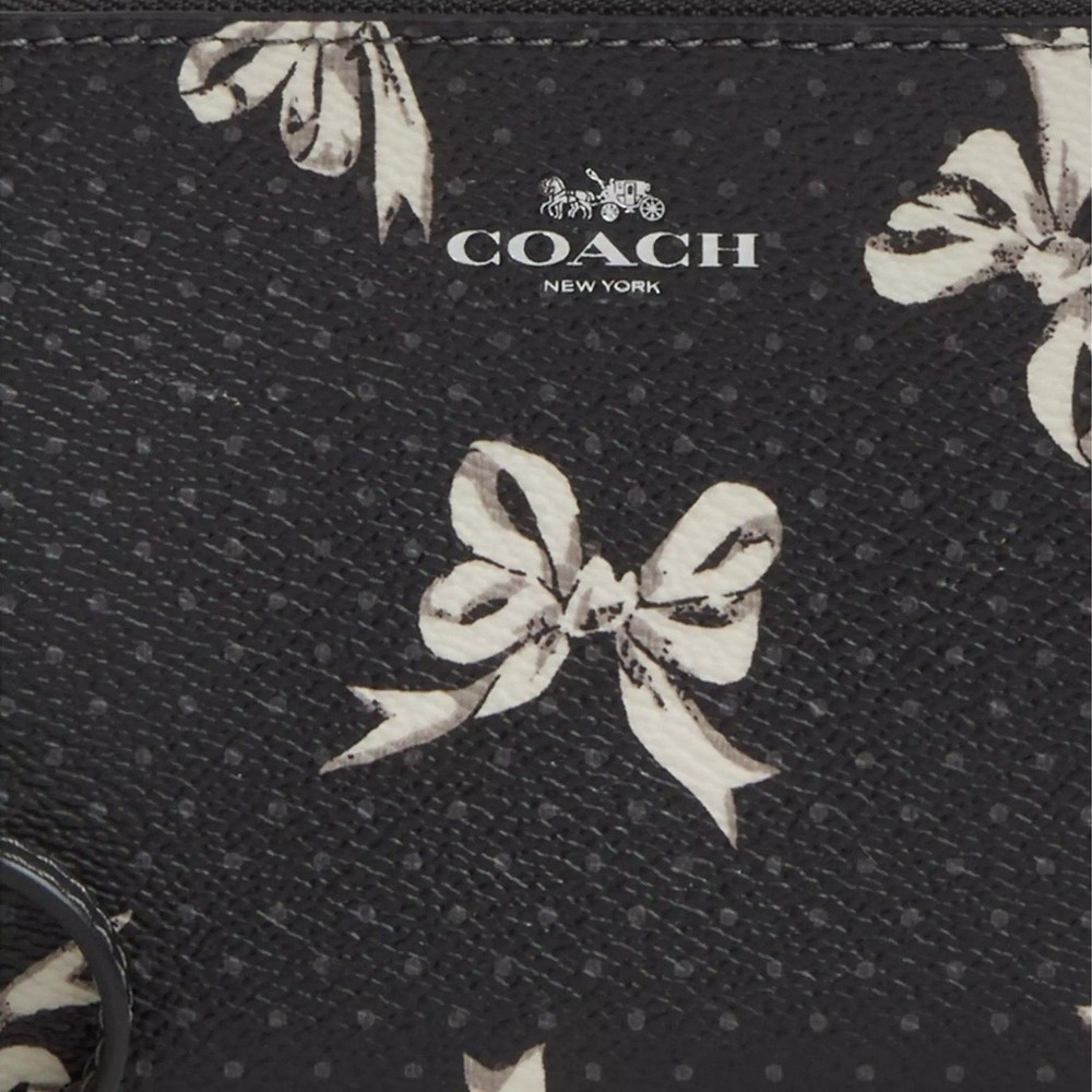 Product Details Style Number CZ441 Measurements Length: 6.25" Height: 4.0" Width: 0.5" Materials Printed coated canvas Fabric lining Strap Wrist strap attached Features Two credit card slots Zip-top closure Placement of the bow print may vary