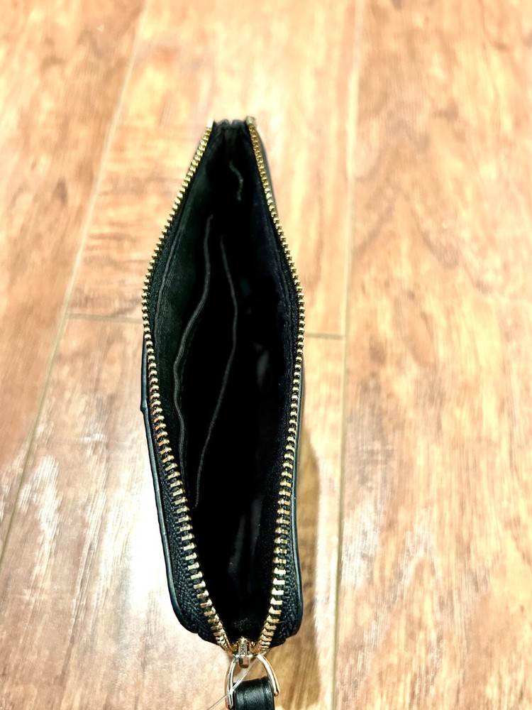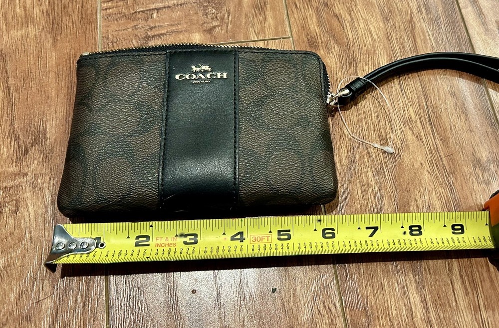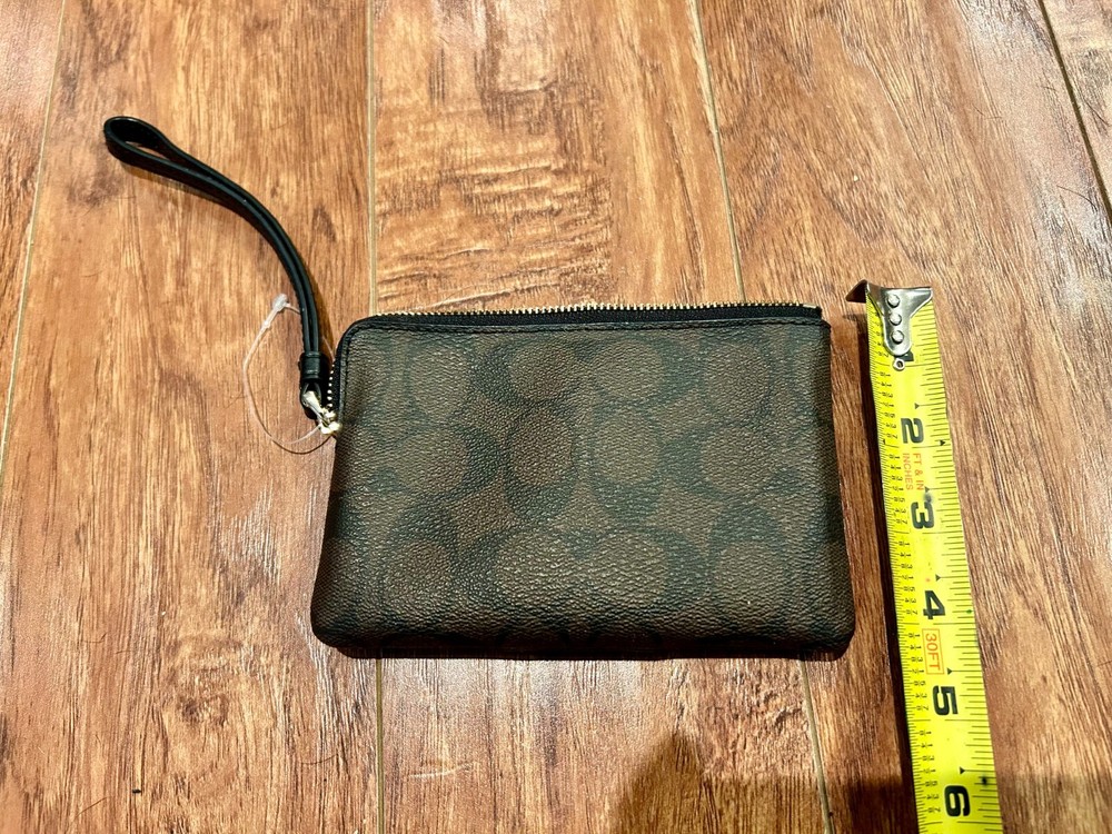 Selling an unused Coach Corner Zip Wristlet in Signature Canvas with Stripe (model # CW854). It is a medium-sized wallet for women, featuring a silver/sand/taupe striped pattern in canvas and leather material. The zip-around style wallet includes credit card slots and is a genuine Coach product.