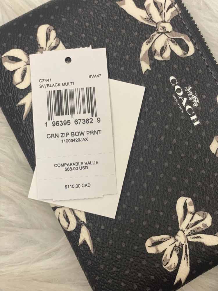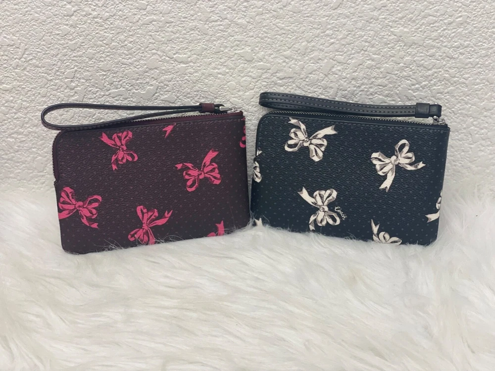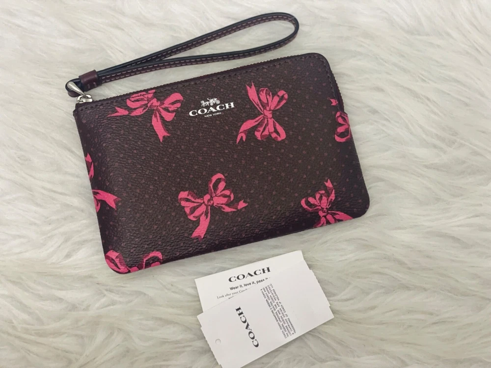 Coach Corner Zip Wristlet With Bow Print Color: Silver/ Merlot Multi Color: Silver/ Black Multi Limited Edition Comparable Value $88 Buy with confidence! 100% Authentic Style Number CZ441 Measurements Length: 6.25" Height: 4.0" Width: 0.5" Materials Printed coated canvas Fabric lining Strap Wrist strap attached Features Two credit card slots Zip-top closure