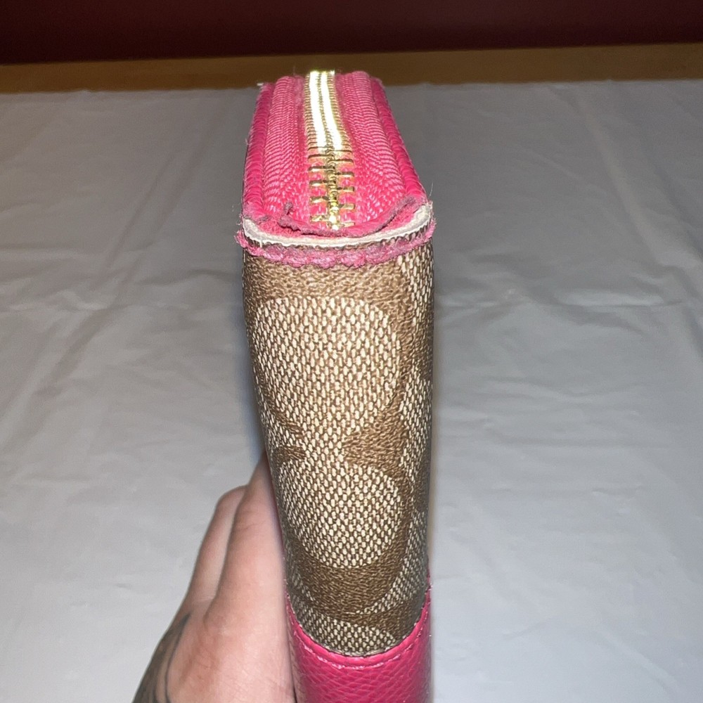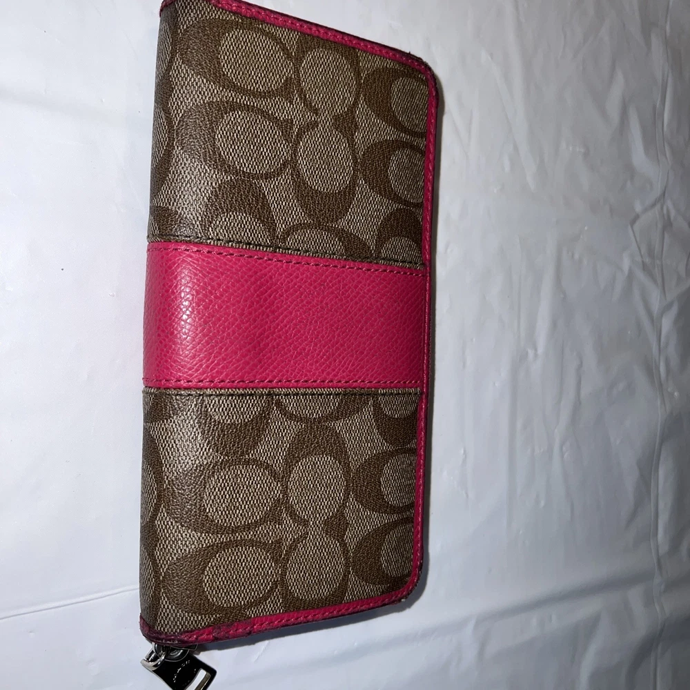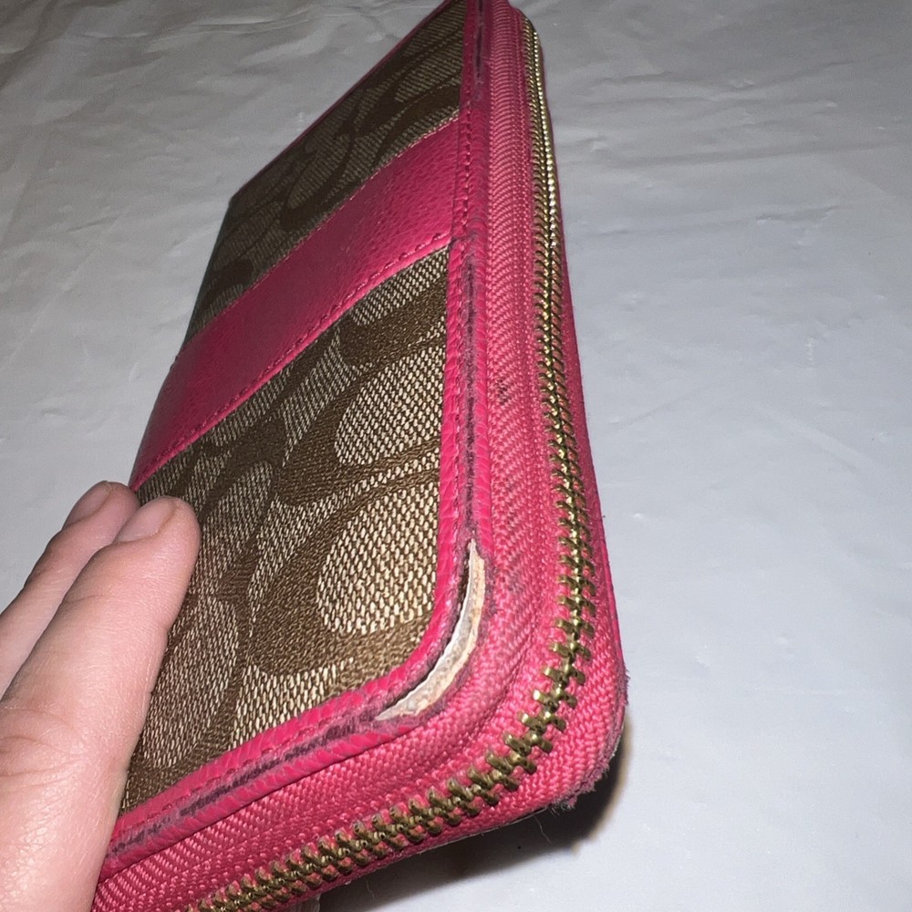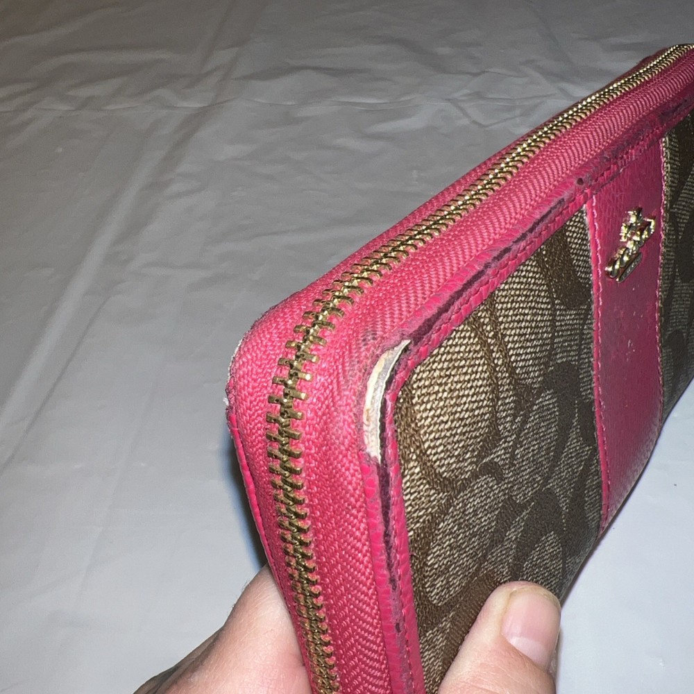 Style: Zip-Around Features: Credit Card UPC: NA Department: Women Theme: Logo Size: L Pattern: Striped Material: Leather Accents: Logo, Zipper Brand: Coach Type: Wallet gtin13: NA Color: Pink