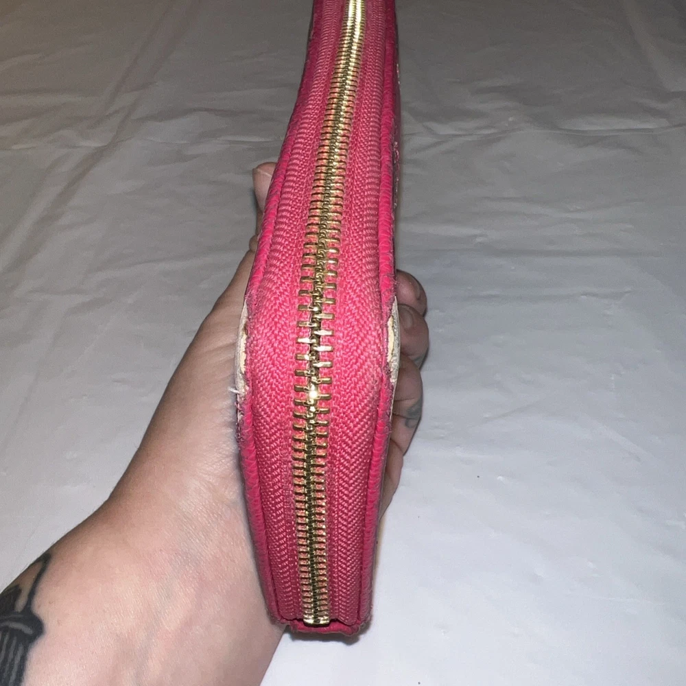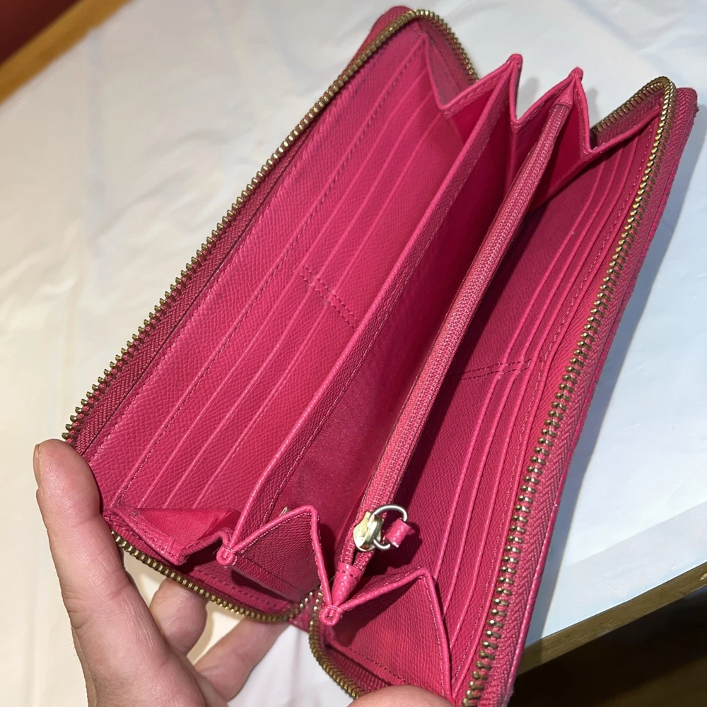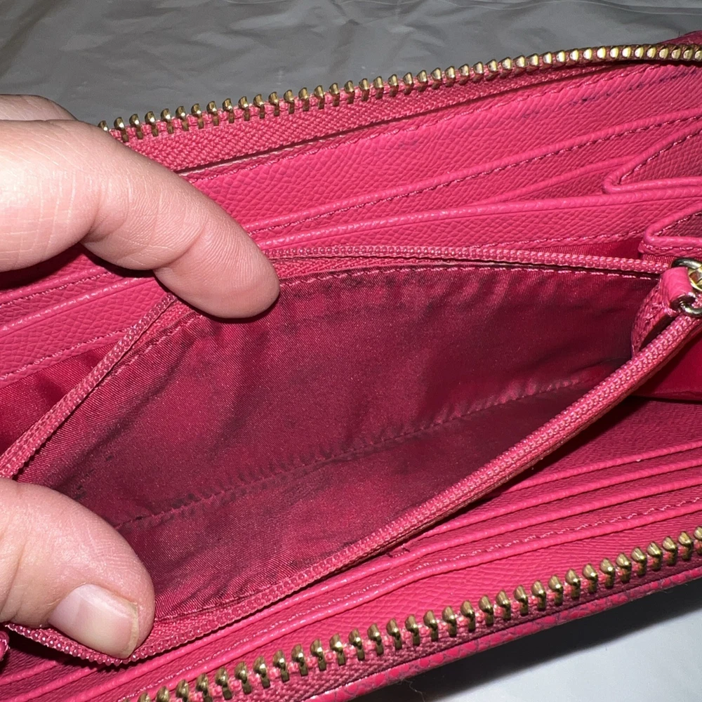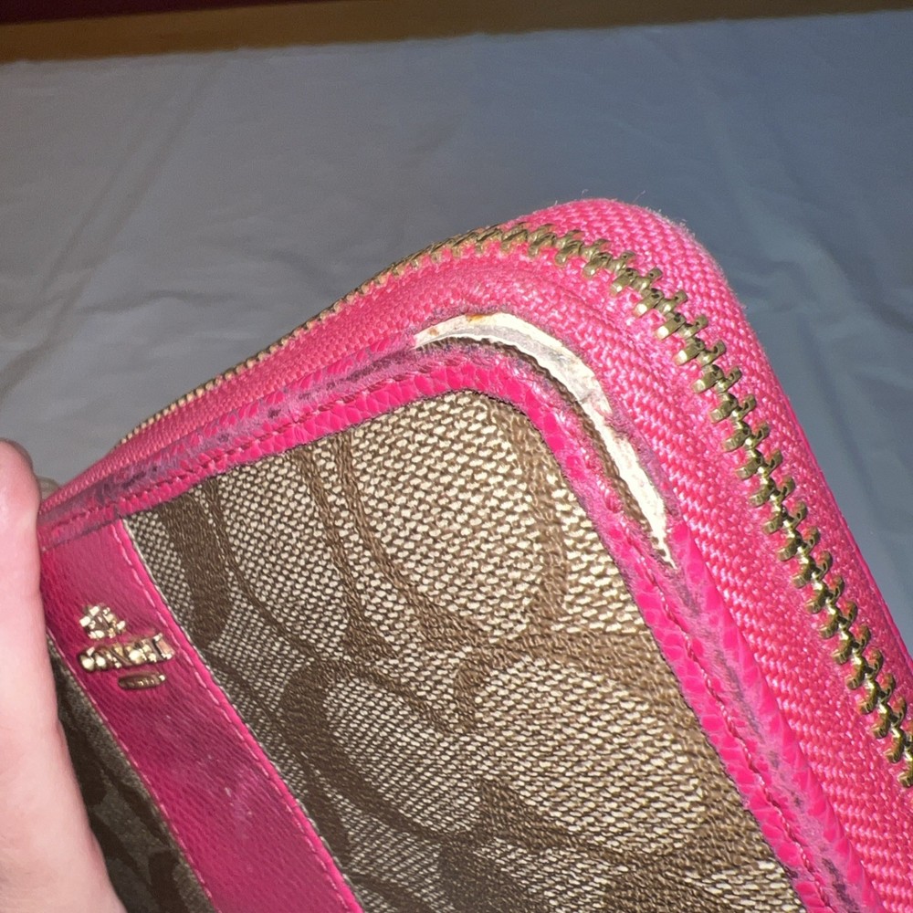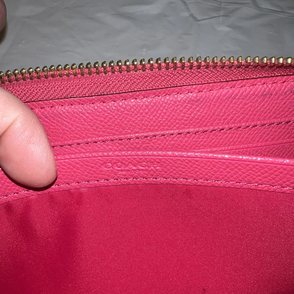 Style: Zip-Around Features: Credit Card UPC: NA Department: Women Theme: Logo Size: L Pattern: Striped Material: Leather Accents: Logo, Zipper Brand: Coach Type: Wallet gtin13: NA Color: Pink