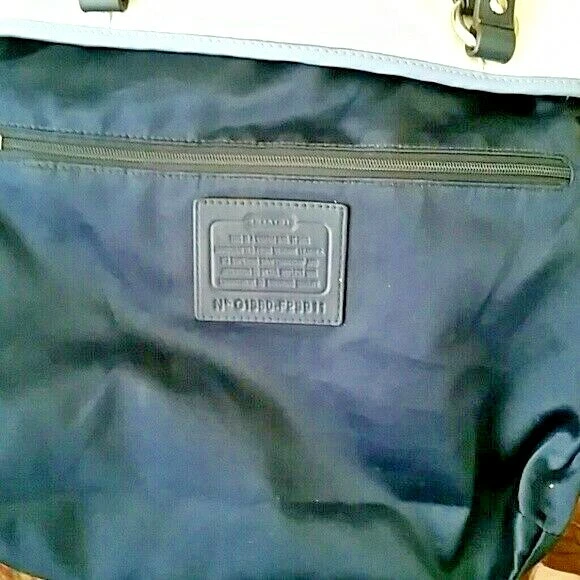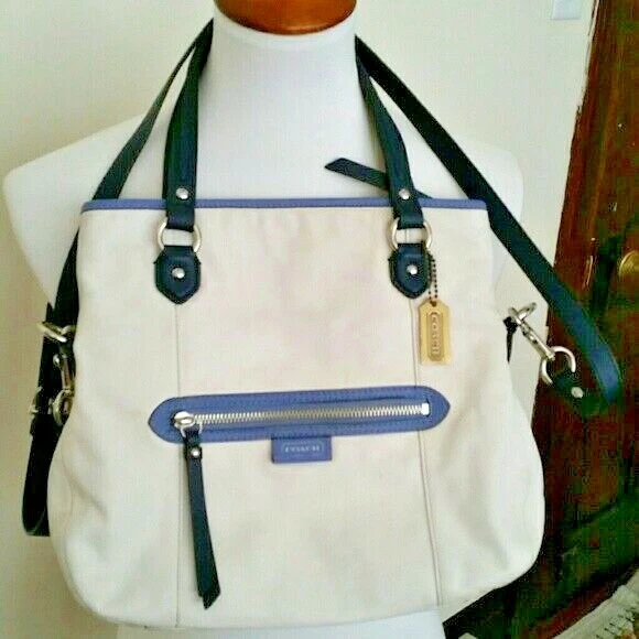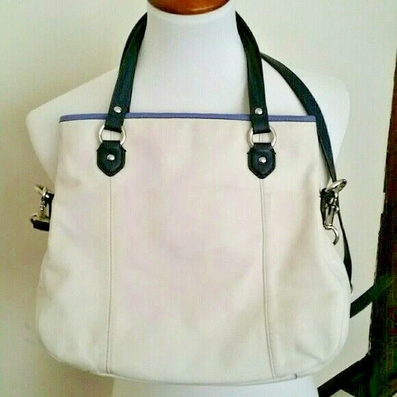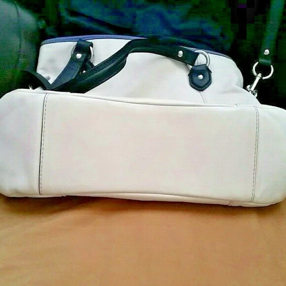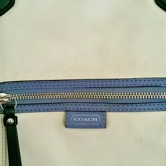 Off white & blue Colorblock Leather Convertible tote. Inside zip pocket, cell phone, and multifunction pockets Zip-top closure, fabric lining Outside zip pocket Handles with 9" drop Longer strap for shoulder or crossbody wear Pre-owned with minor wear & tear. Missing original hang tags. Payment due within 72 hours.