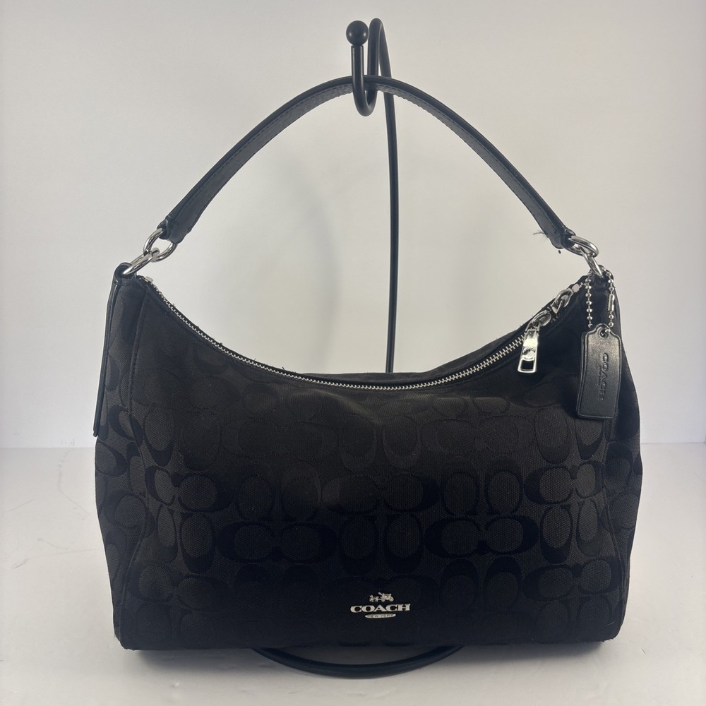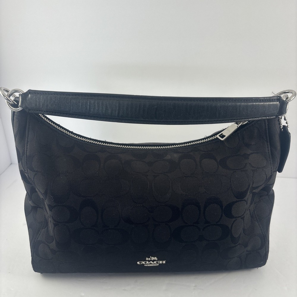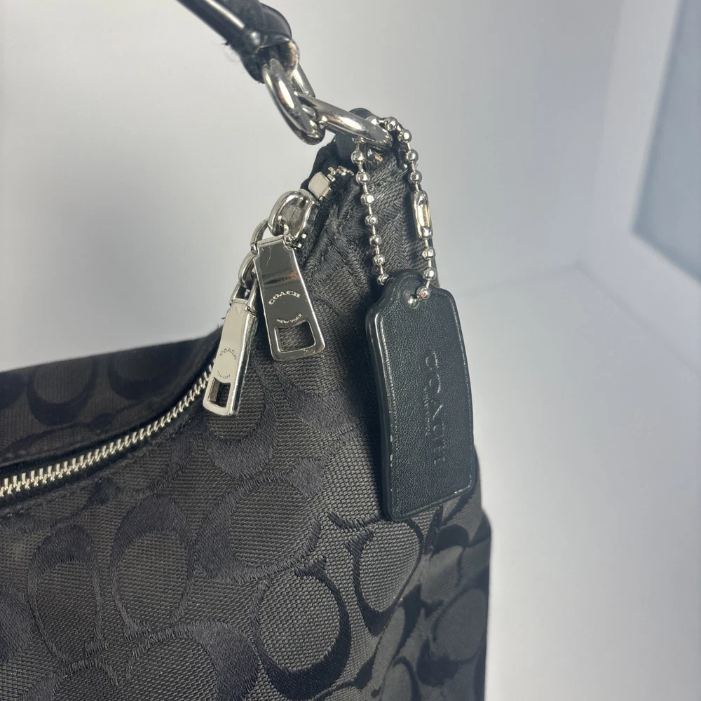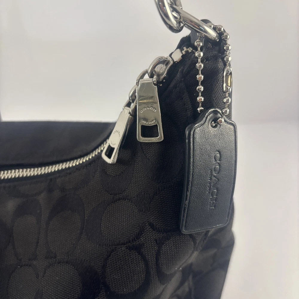 Hardware Color: Silver Handle/Strap Color: Black Lining Material: Leather Exterior Material: Leather, Canvas Closure: Zip Handle/Strap Material: Leather Size: Medium Brand: Coach Theme: Designer Exterior Color: Black Style: Shoulder Bag Model: Coach East Celeste Accents: Zipper Country of Origin: United States Department: Women Pattern: Logo Accessories: Bag Charm Lining Color: Black