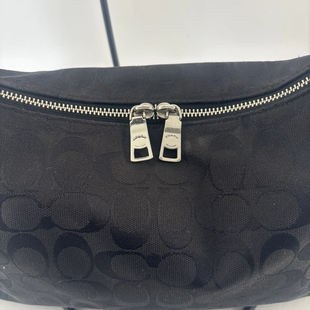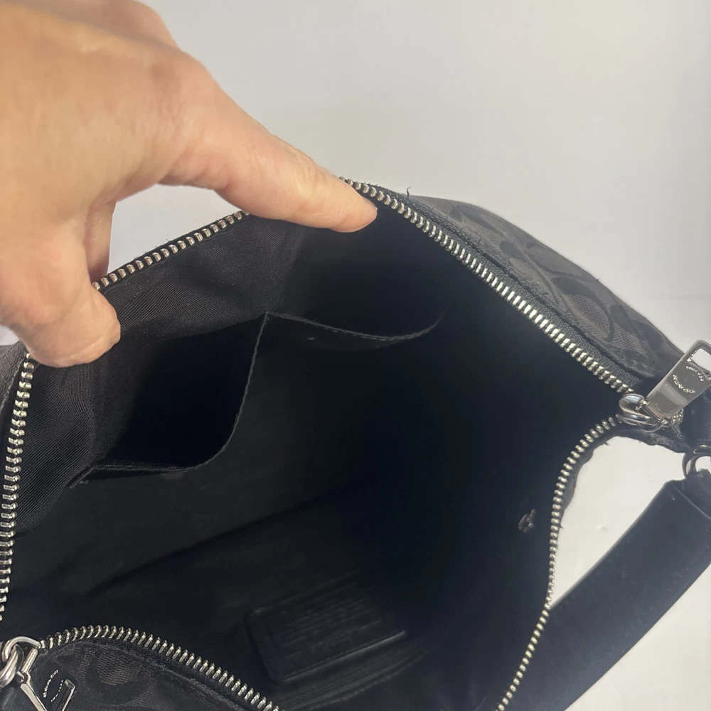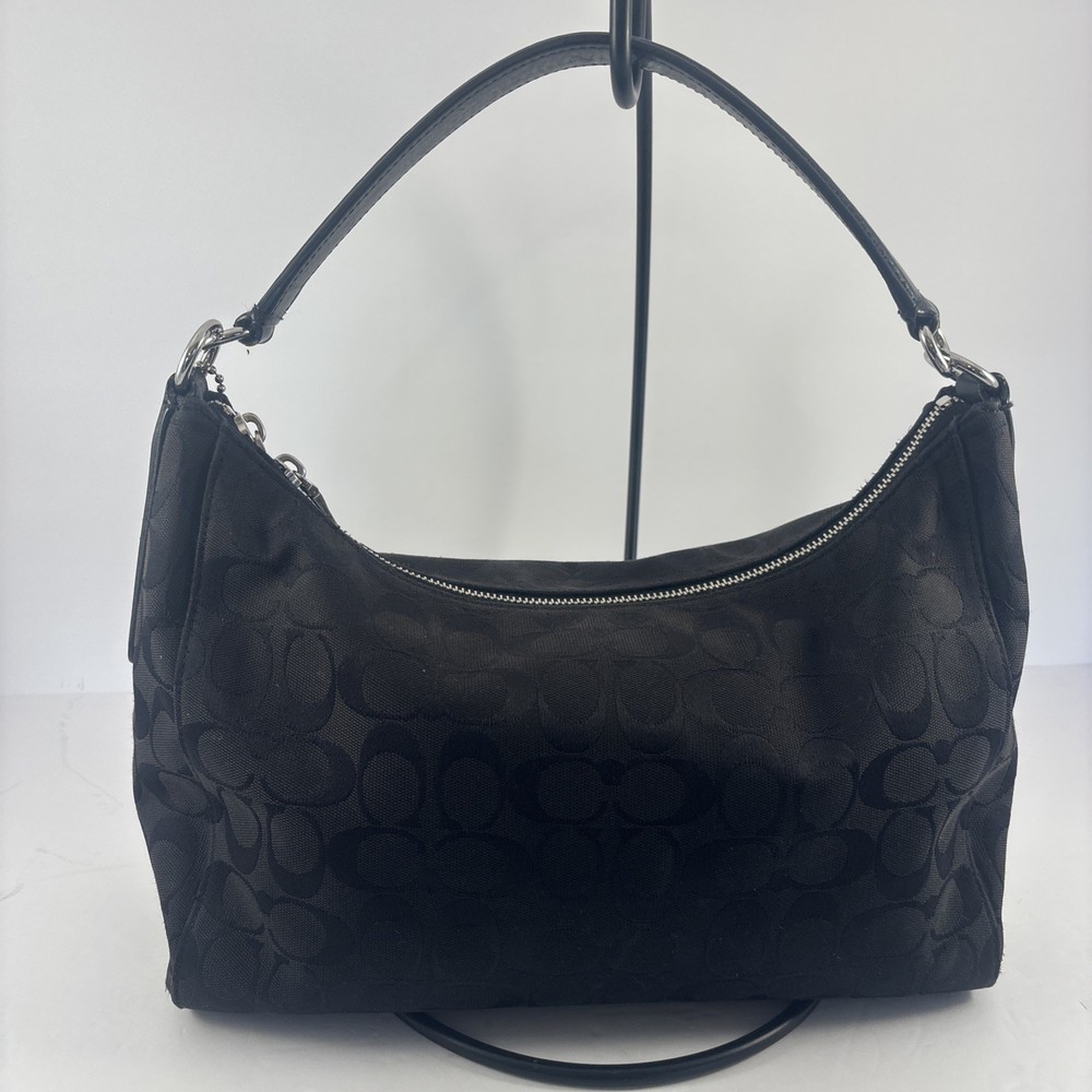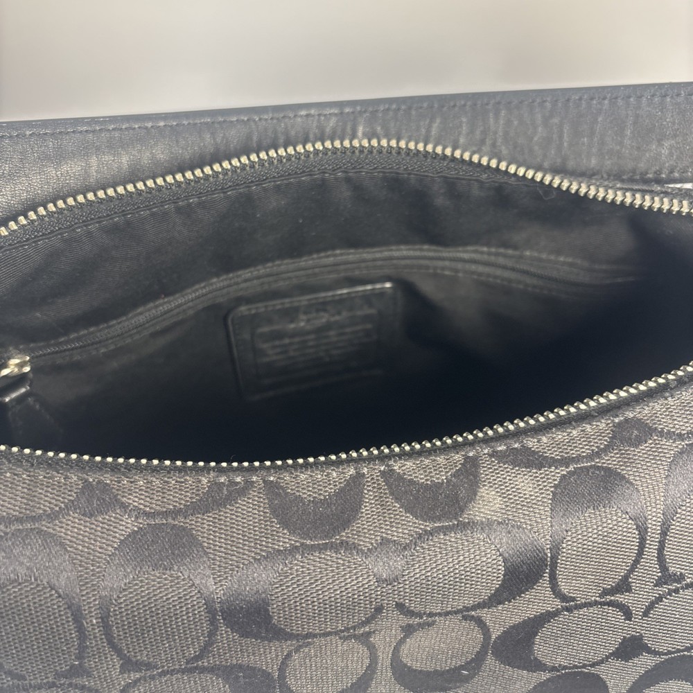 Hardware Color: Silver Handle/Strap Color: Black Lining Material: Leather Exterior Material: Leather, Canvas Closure: Zip Handle/Strap Material: Leather Size: Medium Brand: Coach Theme: Designer Exterior Color: Black Style: Shoulder Bag Model: Coach East Celeste Accents: Zipper Country of Origin: United States Department: Women Pattern: Logo Accessories: Bag Charm Lining Color: Black