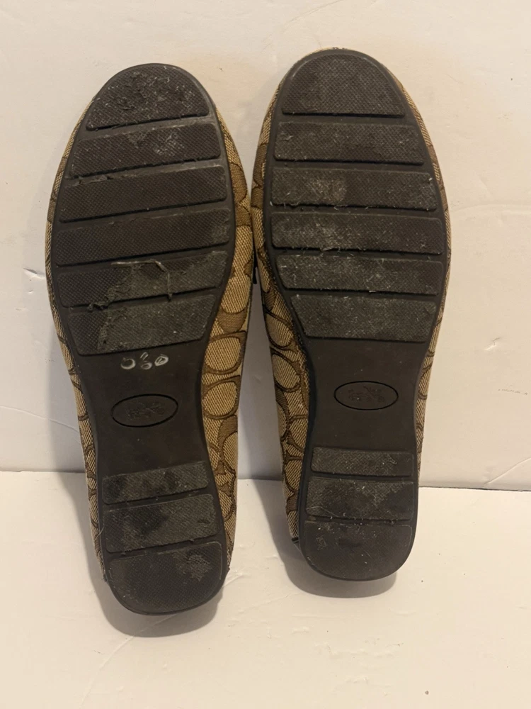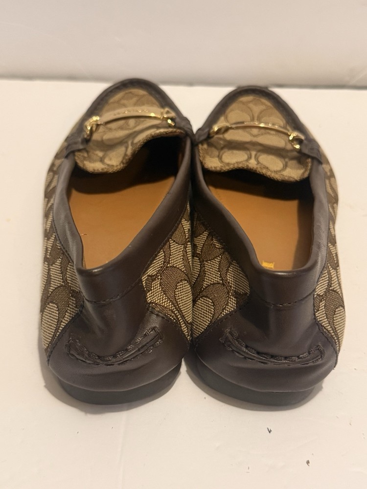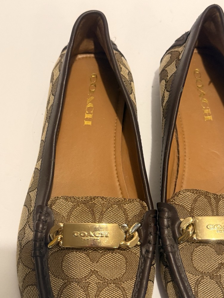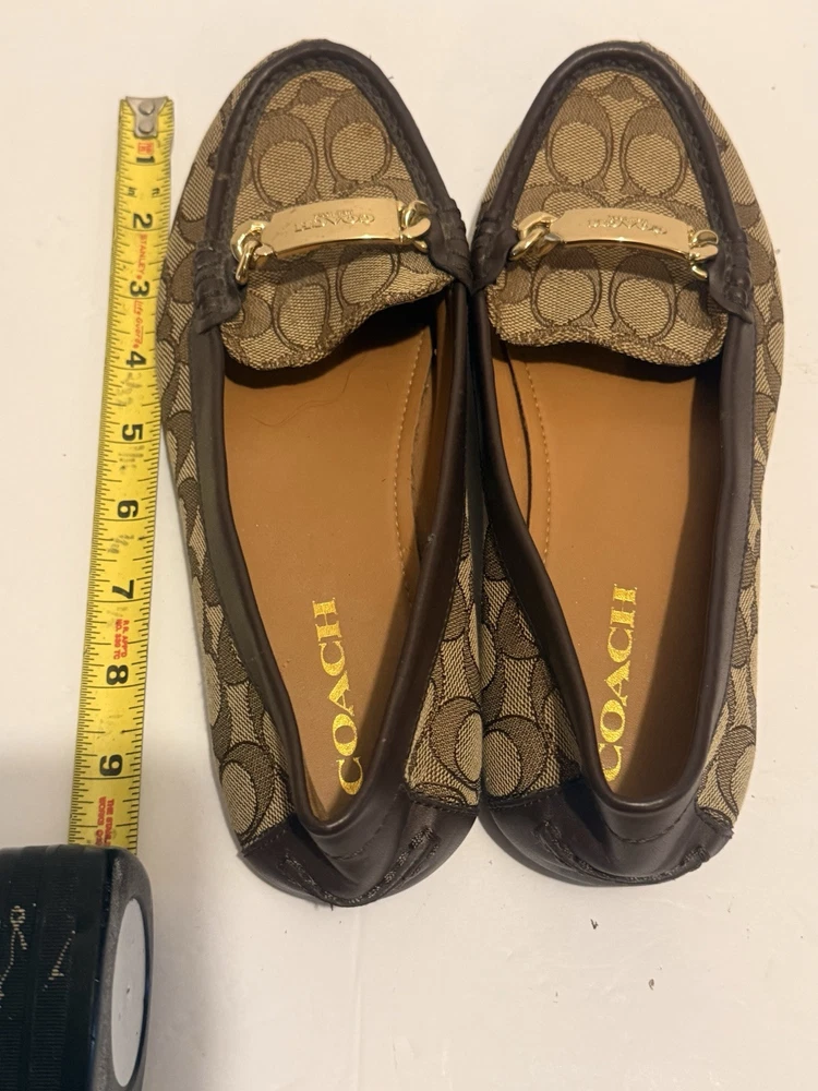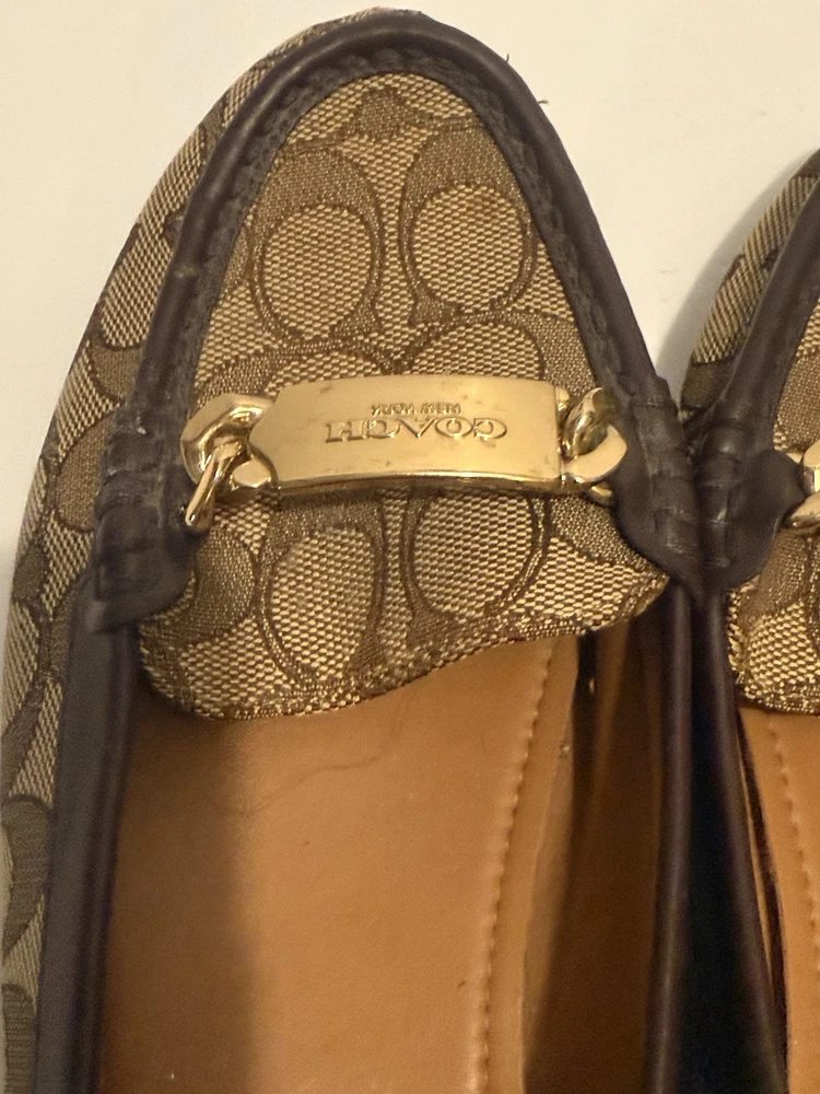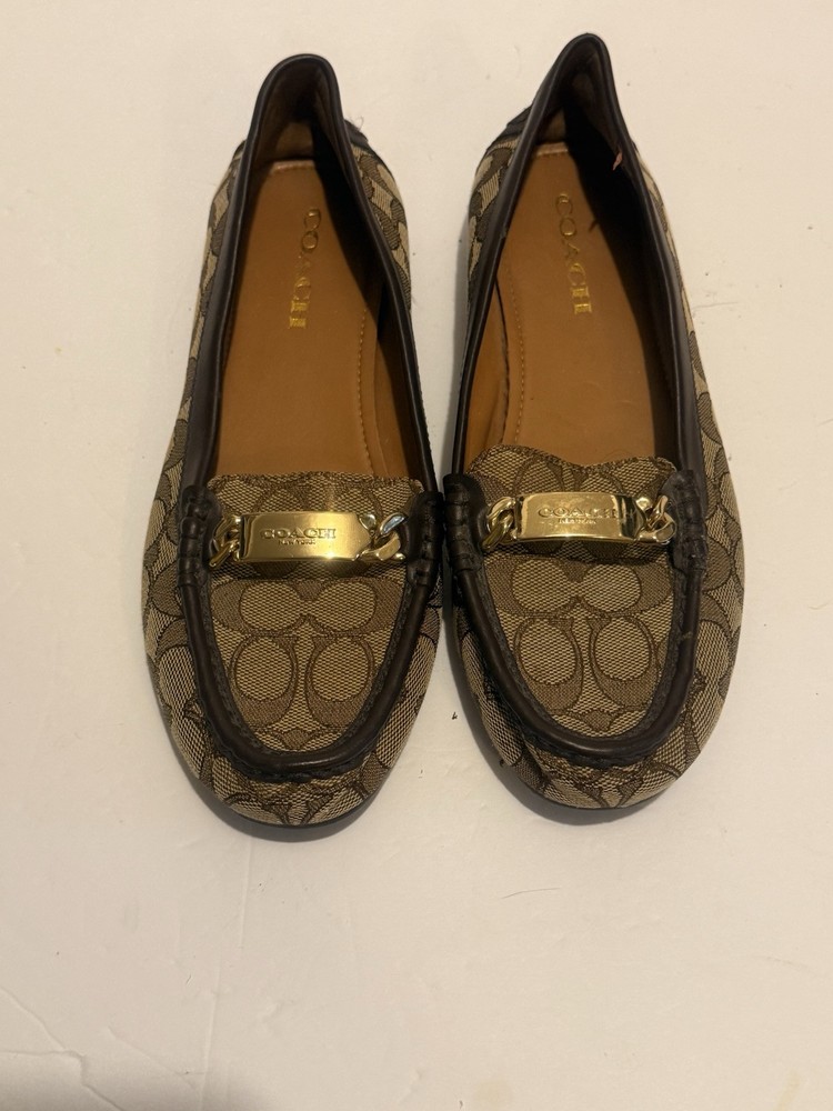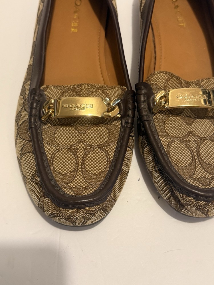 These are Coach Fortunata loafers for women in size 8B. They feature a khaki/chestnut signature C design on patent leather uppers with a round toe shape. The slip-on style and rubber outsole provide comfort and non-slip traction. Ideal for travel, casual wear, work, or business attire. Made with leather lining and a leather insole for added quality. Gently used very good clean inside please see photos.