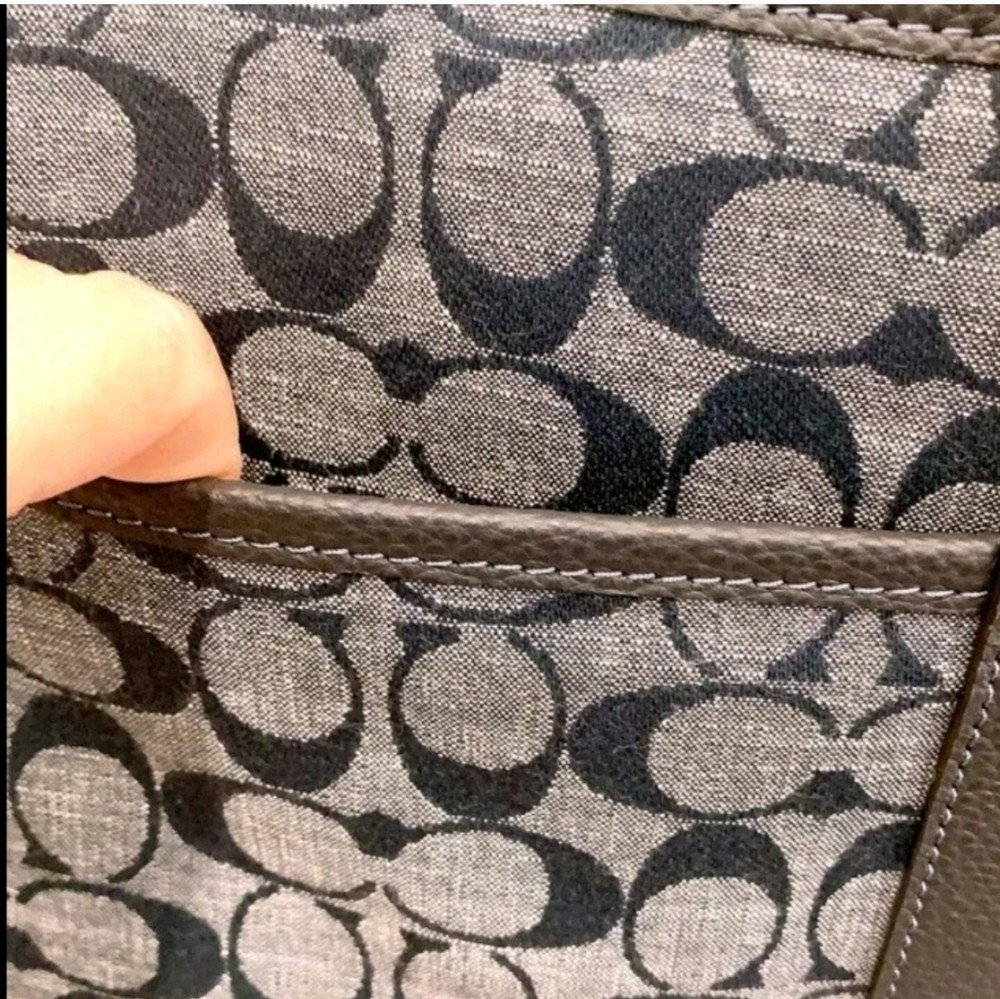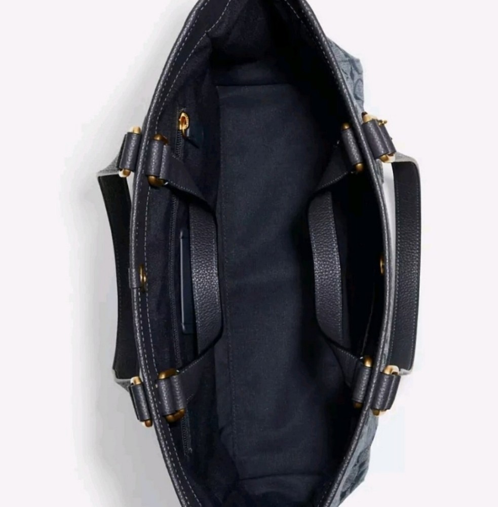 Crafted with the modern woman in mind, the Coach Hudson Signature Chambray Denim Blue Tote marries functionality with designer flair. Its spacious large interior, lined with a coordinating blue fabric, provides ample room for daily essentials, while the brass hardware adds a touch of elegance to the durable denim exterior. The tote features a convenient snap closure and is adorned with a signature Coach logo pattern, rendered in a stylish chambray denim blue. Double leather handles ensure comfortable carrying, making this tote a practical choice for those with a penchant for high-quality designer accessories. A charming brass bag charm accompanies the tote, elevating its look and adding a hint of sophistication to your ensemble.