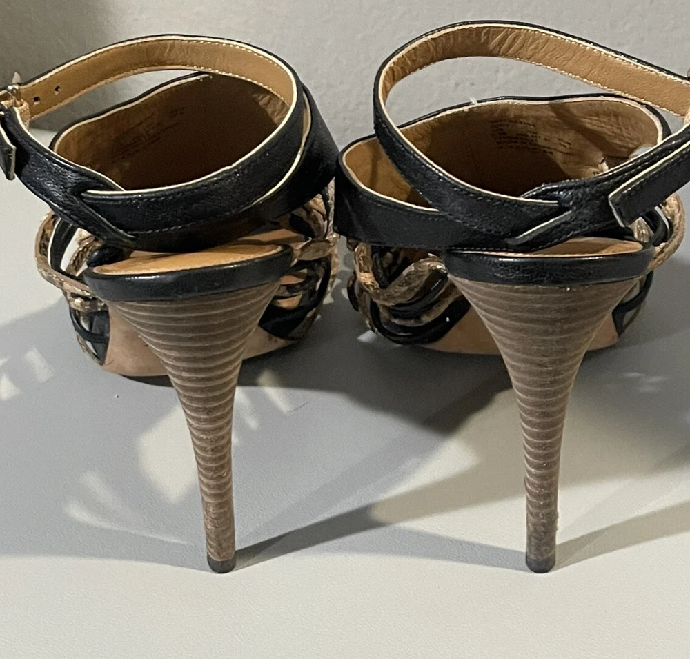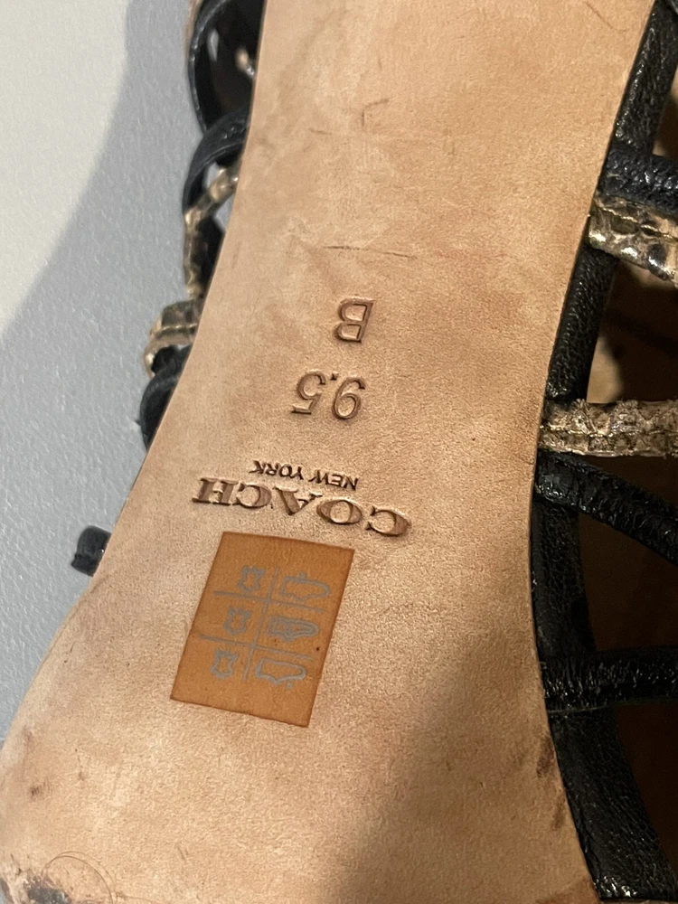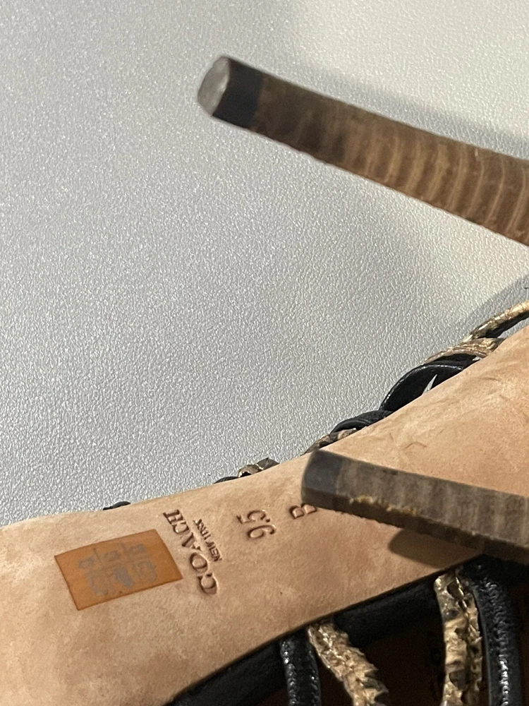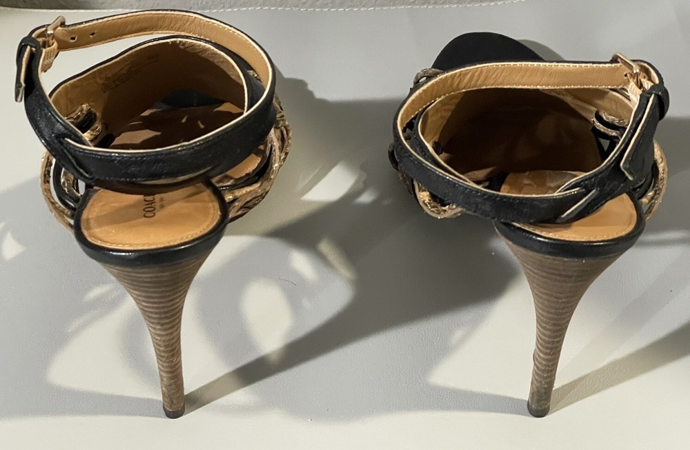 *** there are some sign of imperfection pls refer to pictures, there is sticker left on the right shoes, already removed some and stain at the bottom of the shoes pls refer to pictures** sold as is*** The Coach Jody Python Print Ankle Stiletto is a stylish heel featuring a striking animal print design in black and sand colors. With an open toe and strappy style, these heels are perfect for various occasions like parties, casual outings, and even business events. The ankle strap and adjustable strap provide added comfort and security while the stiletto heel adds a touch of sophistication. Crafted from leather and designed with a unique animal theme, these heels are a fashionable choice for women who want to make a statement with their footwear.
