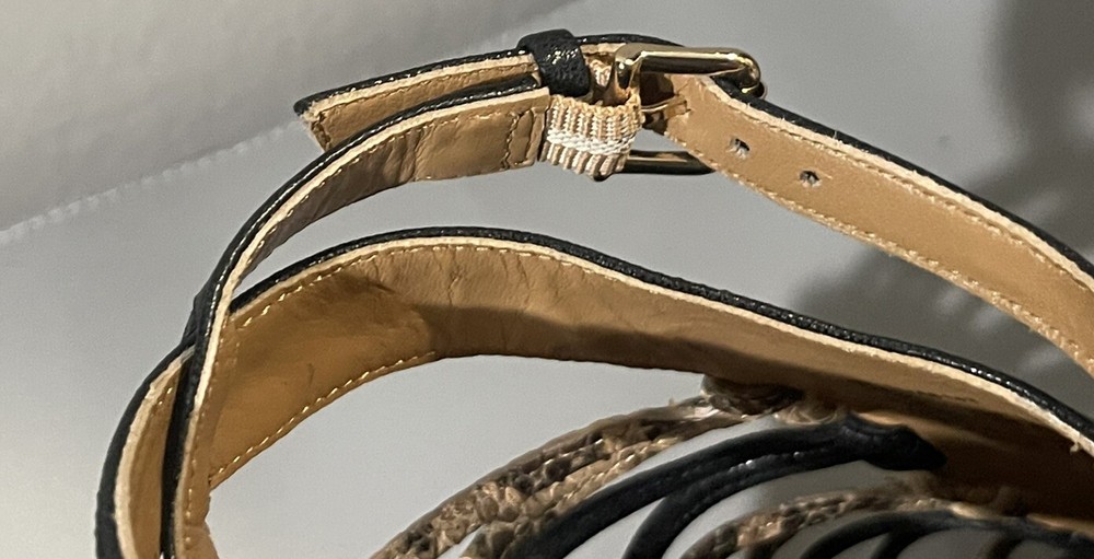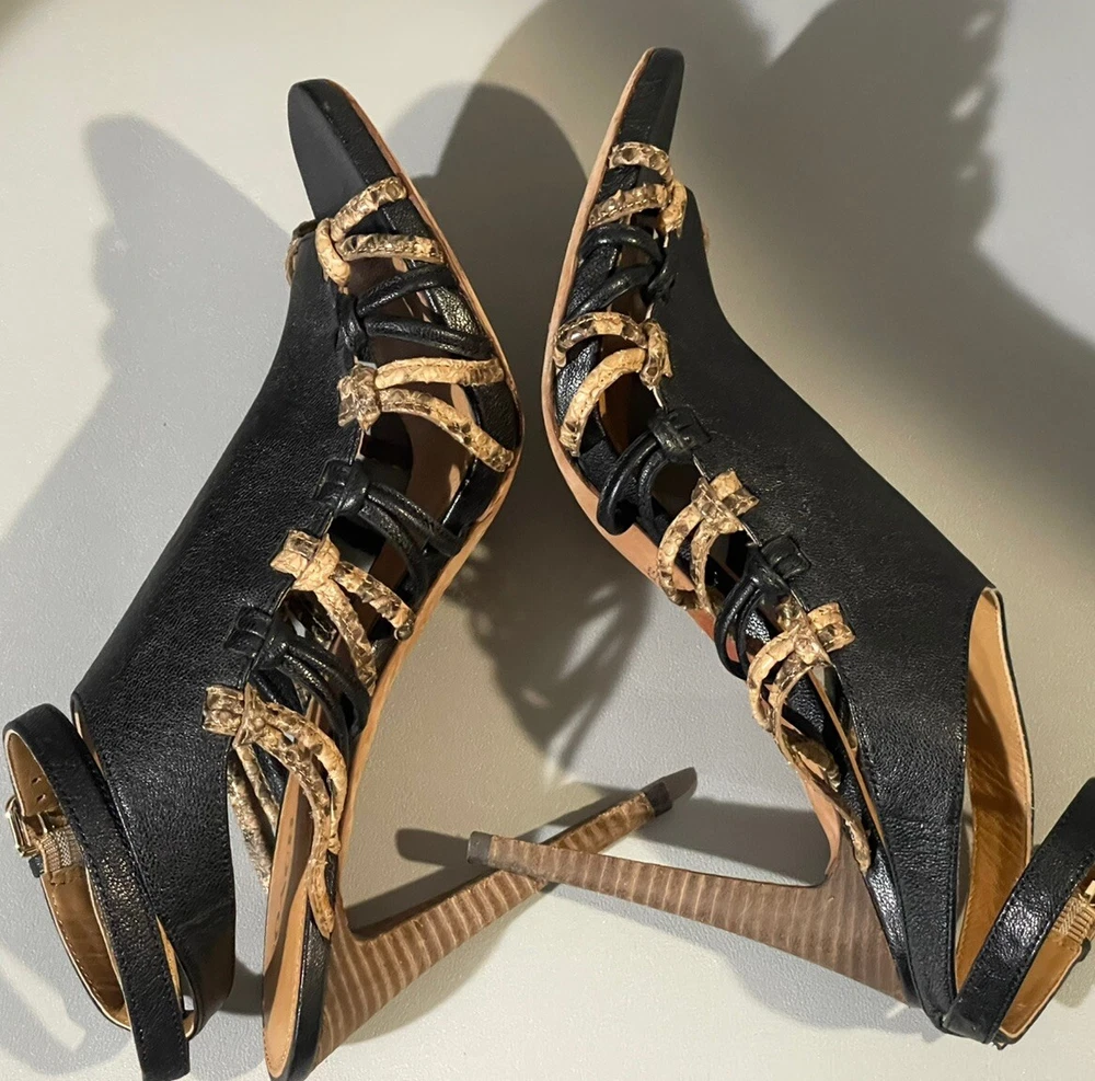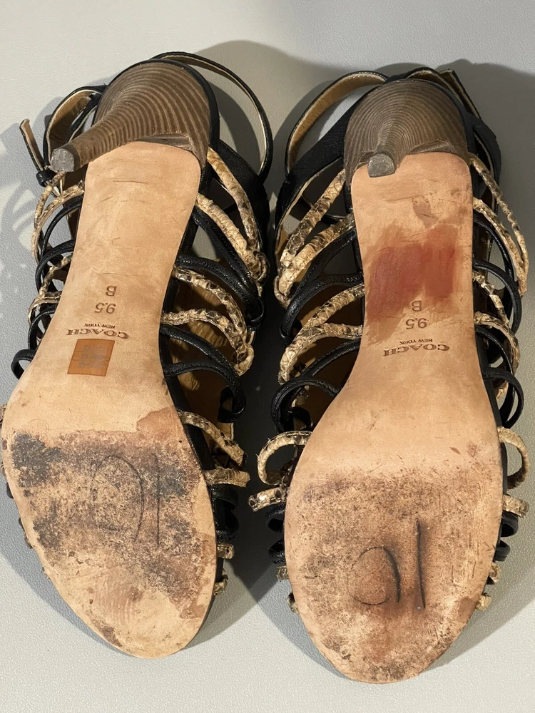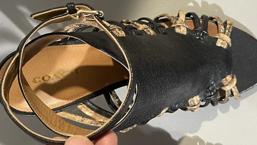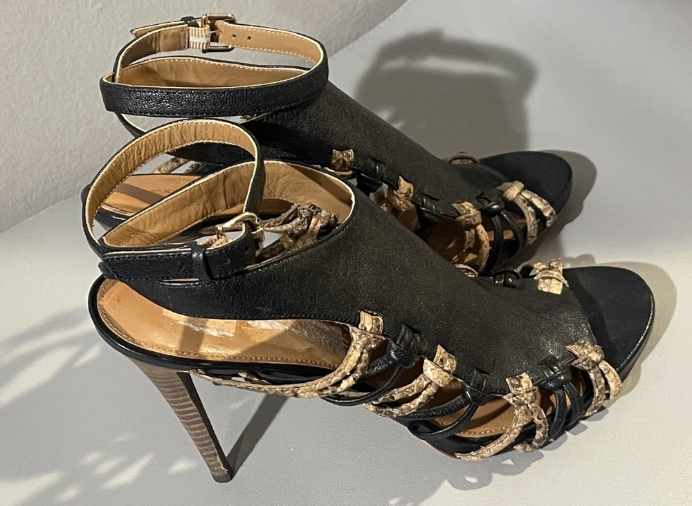 *** there are some sign of imperfection pls refer to pictures, there is sticker left on the right shoes, already removed some and stain at the bottom of the shoes pls refer to pictures** sold as is*** The Coach Jody Python Print Ankle Stiletto is a stylish heel featuring a striking animal print design in black and sand colors. With an open toe and strappy style, these heels are perfect for various occasions like parties, casual outings, and even business events. The ankle strap and adjustable strap provide added comfort and security while the stiletto heel adds a touch of sophistication. Crafted from leather and designed with a unique animal theme, these heels are a fashionable choice for women who want to make a statement with their footwear.