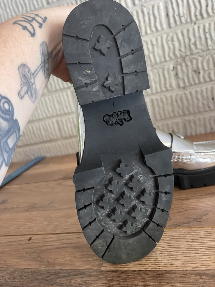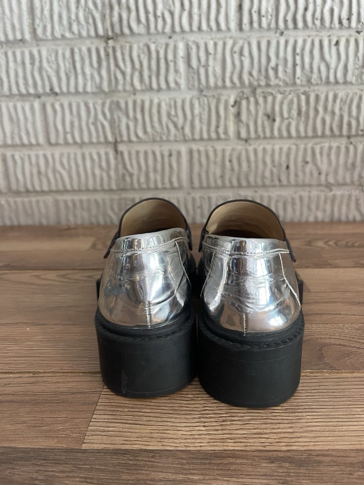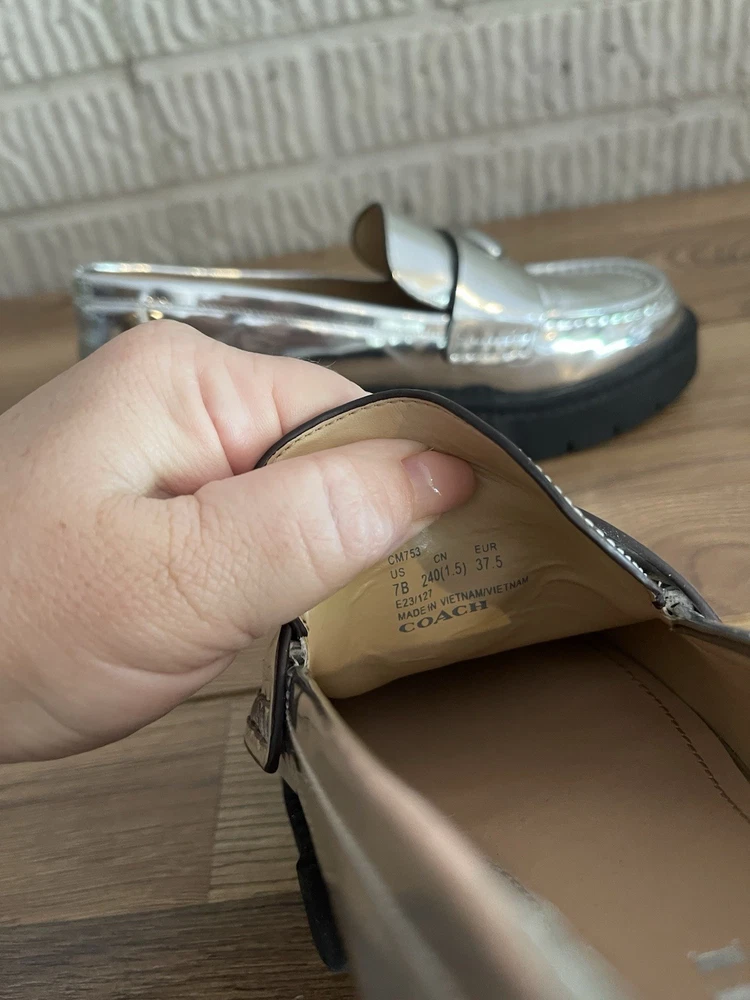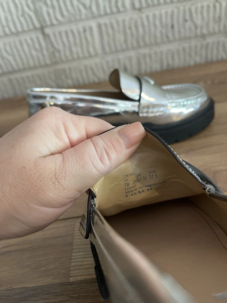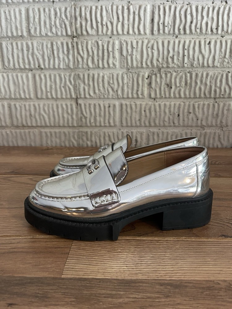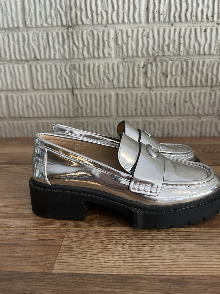 Elevate your style with these stunning Coach LEAH loafers. The metallic silver color and chunky platform make them perfect for any fashion-forward woman. Crafted from high-quality leather, these flats are both comfortable and stylish. The loafers feature a sleek design with a metal theme that adds a touch of sophistication to any outfit. They are available in women's size 7 and are perfect for any occasion. Don't miss out on the chance to add these gorgeous Coach loafers to your shoe collection.