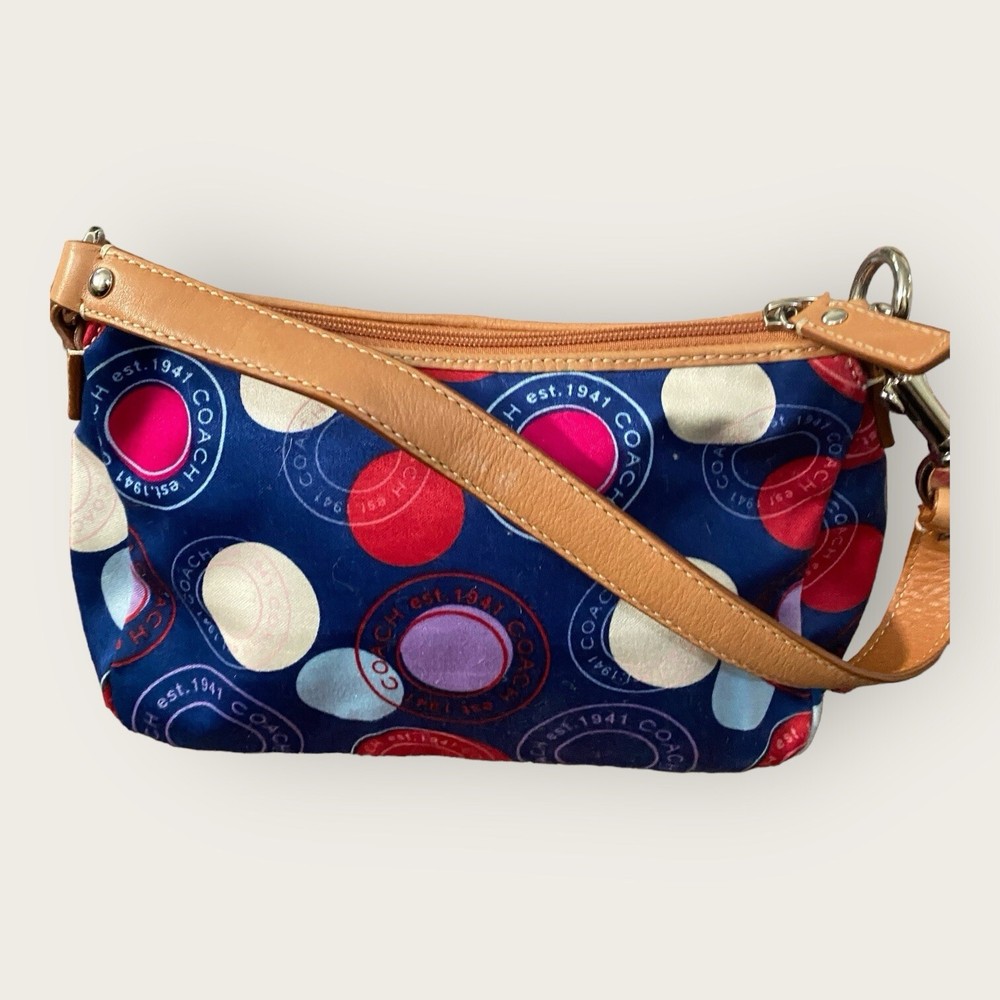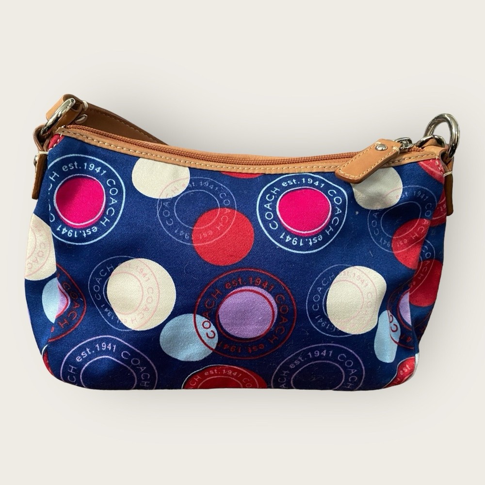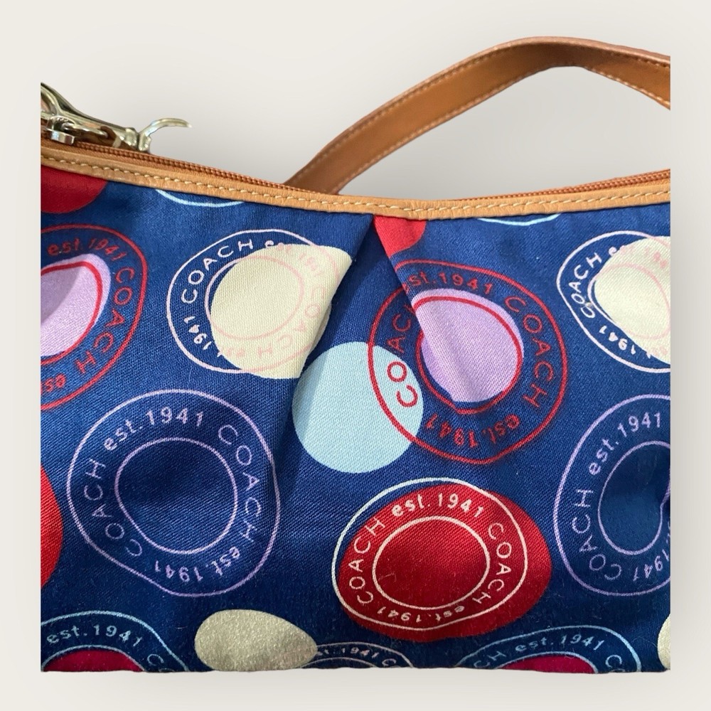 Preowned. Great Condition Coach Leah Polka Dot Tote Purse Navy Blue with Red White Circles Y2K Bag Coach Logo Multicolor Coach Handbag. Light tan Leather arm straps with silver chrome strap links. Multicolor fabric on the outside. Baby Blue fabric on inside of handbag. Don't like the price? Make me an offer! Questions? Ask before purchasing! Our merchandise is carefully selected by myself, but please understand that not all items are new. Most are preowned and preloved and will be described as such in the description. See photos for rough measurements; Due to light & screen variations, colors may vary slightly from the images. Items have been cleaned according to ebay’s guidelines and ship from a smoke free home. Return Policy A purchased item is eligible for a free return for up to 30 days from the date of purchase. Items must be in the same condition as shipped. Original condition means the item is not washed, worn (aside from trying it on), damaged or altered and returned with all hangtags and original packaging(Box). Any item not meeting the condition standards of this policy will be returned at the customers expense. Additional terms: Customers are held responsible for safe return of the item. Thank you! Well Favored Threads!
