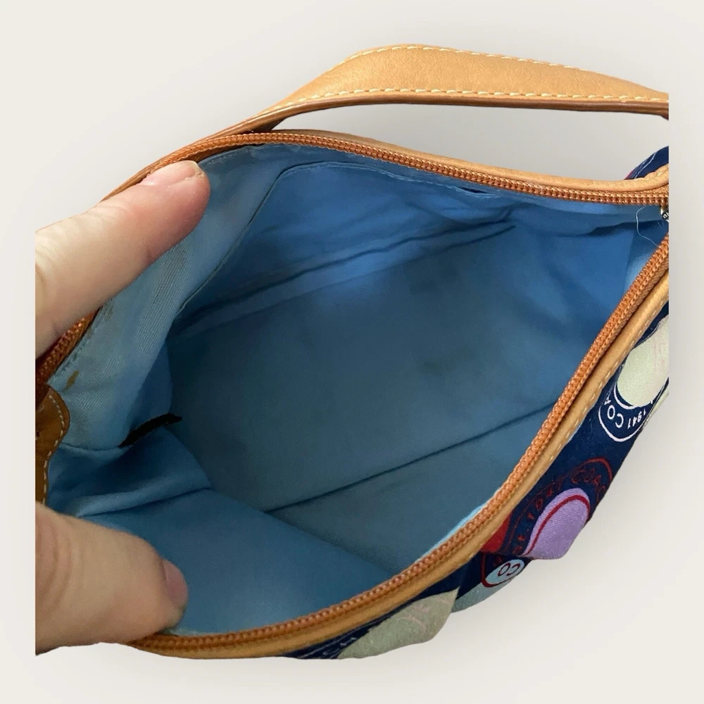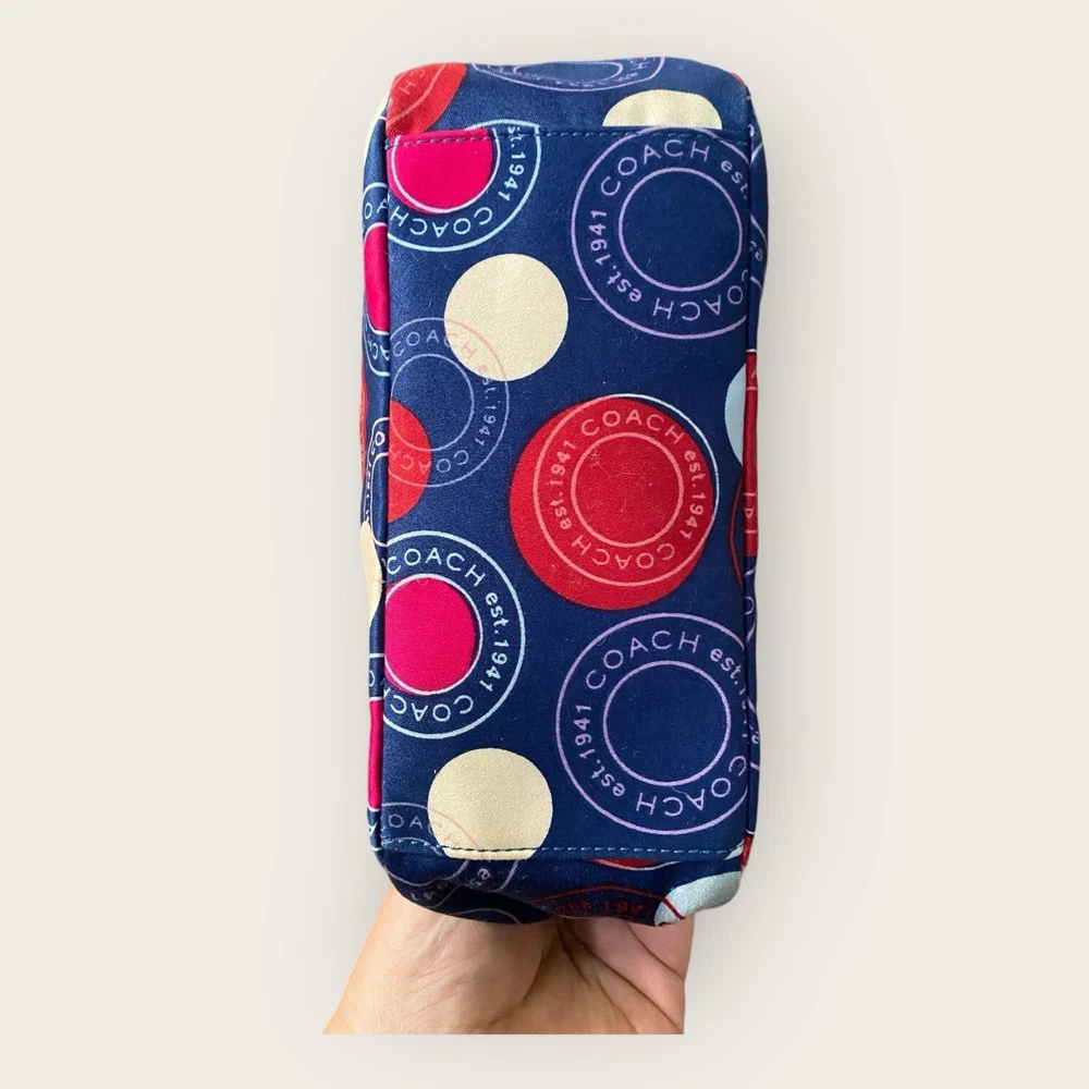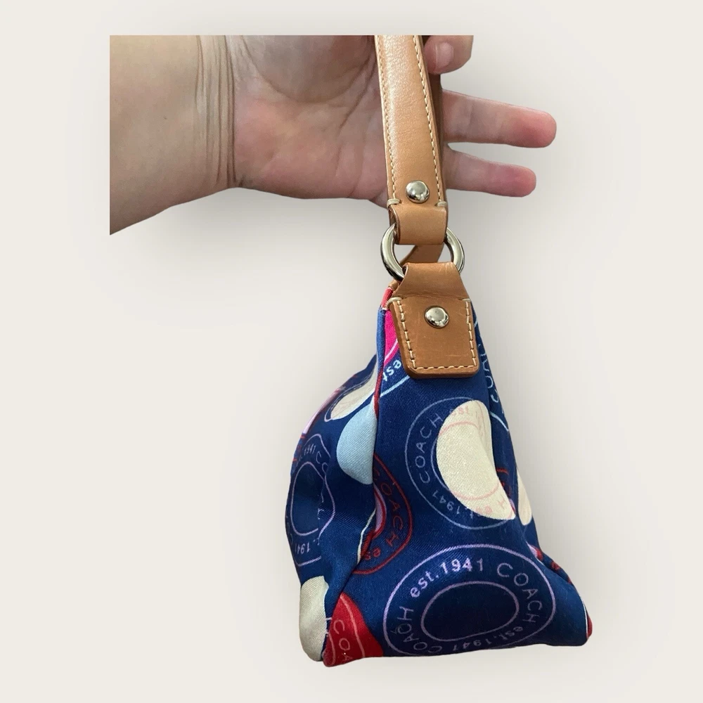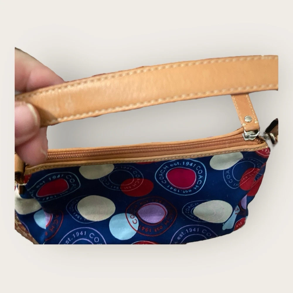Preowned. Great Condition Coach Leah Polka Dot Tote Purse Navy Blue with Red White Circles Y2K Bag Coach Logo Multicolor Coach Handbag. Light tan Leather arm straps with silver chrome strap links. Multicolor fabric on the outside. Baby Blue fabric on inside of handbag. Don't like the price? Make me an offer! Questions? Ask before purchasing! Our merchandise is carefully selected by myself, but please understand that not all items are new. Most are preowned and preloved and will be described as such in the description. See photos for rough measurements; Due to light & screen variations, colors may vary slightly from the images. Items have been cleaned according to ebay’s guidelines and ship from a smoke free home. Return Policy A purchased item is eligible for a free return for up to 30 days from the date of purchase. Items must be in the same condition as shipped. Original condition means the item is not washed, worn (aside from trying it on), damaged or altered and returned with all hangtags and original packaging(Box). Any item not meeting the condition standards of this policy will be returned at the customers expense. Additional terms: Customers are held responsible for safe return of the item. Thank you! Well Favored Threads!