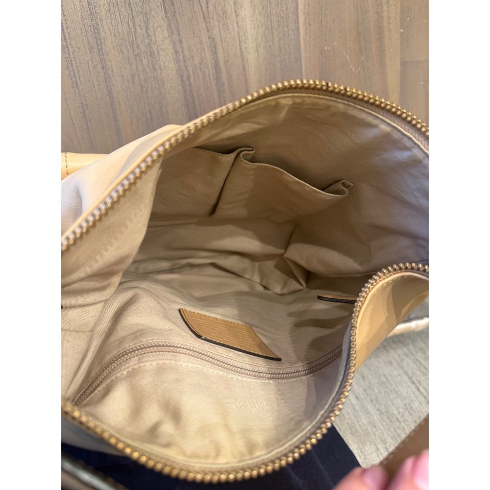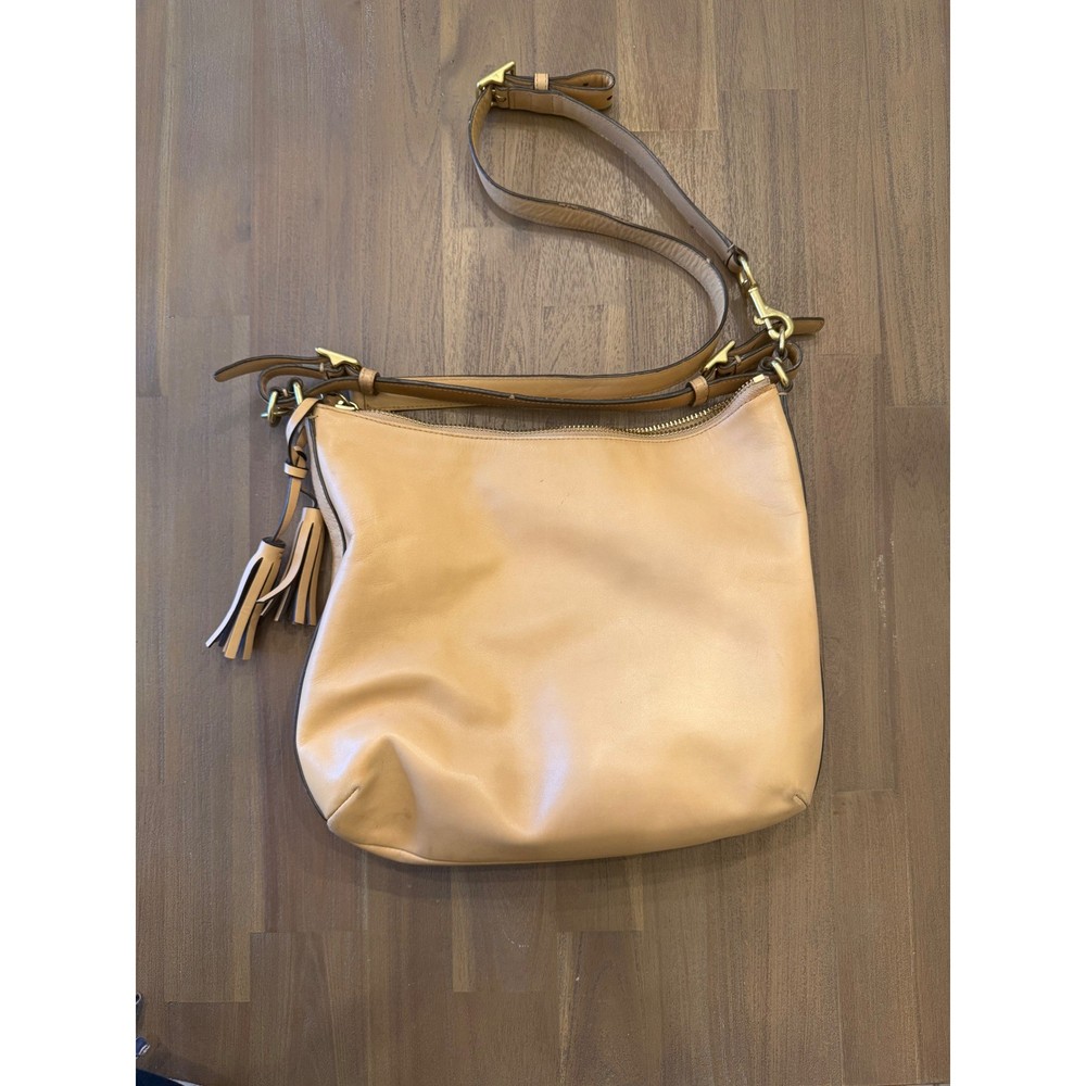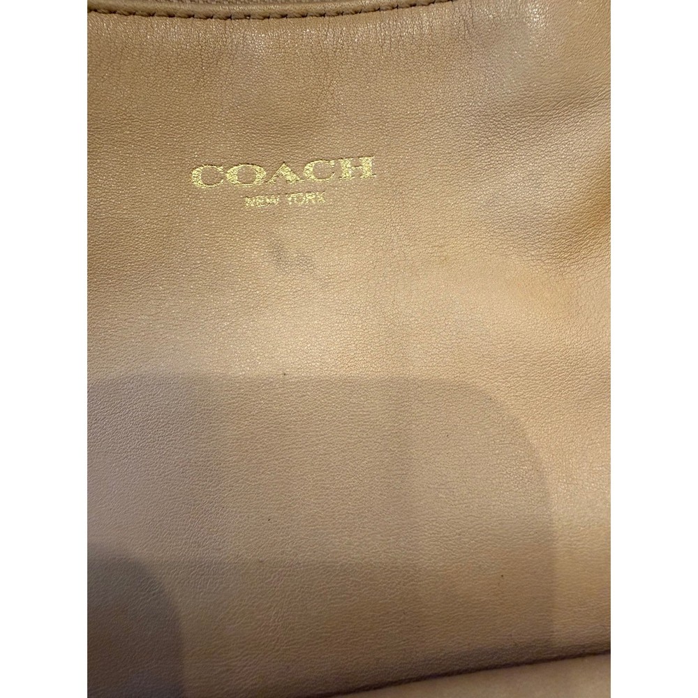 Discover effortless elegance with this beautiful Coach leather shoulder bag. The rich tan pebbled leather offers a luxurious feel and timeless appeal, while the signature Coach New York logo adds a touch of classic sophistication. Designed for the modern woman, its spacious interior and convenient front flap pocket keep your essentials organized and accessible. The playful tassel detail adds a chic flair, making this hobo purse a perfect companion for everyday errands or a stylish weekend getaway. Exterior Material: Leather Style: Shoulder Bag Exterior Color: Beige Department: Women Lining Color: Beige Handle/Strap Material: Leather Handle/Strap Color: Brown Lining Material: Fabric Hardware Color: Gold Closure: Zip, Turn Lock Bag Height: 13 in Bag Depth: 5 in Accents: Tassel, Zipper Keywords: hobo, crossbody, designer, luxury, pebbled, tassel, gold hardware, everyday, chic, sophisticated, versatile, tan, new york