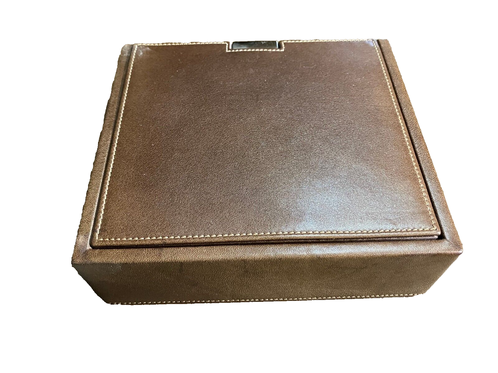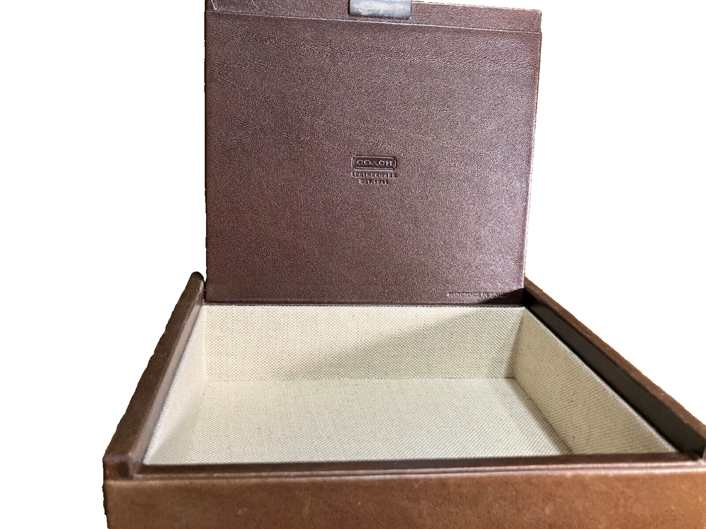 Elevate your jewelry storage with the Genuine Coach Leather Jewelry/Valet Box, handmade in Spain with meticulous craftsmanship. The rich brown leather exterior exudes elegance, while the interior is lined with textured microfiber to safeguard your precious items. This rectangular jewelry box (7" x 6.5" x 2") is a perfect blend of form and function, designed to keep your accessories organized and within reach. A sophisticated addition to any dressing table or dresser, it embodies the timeless appeal of Coach, making it not just a holder of your treasures, but a treasure in itself. Truly a beauty.