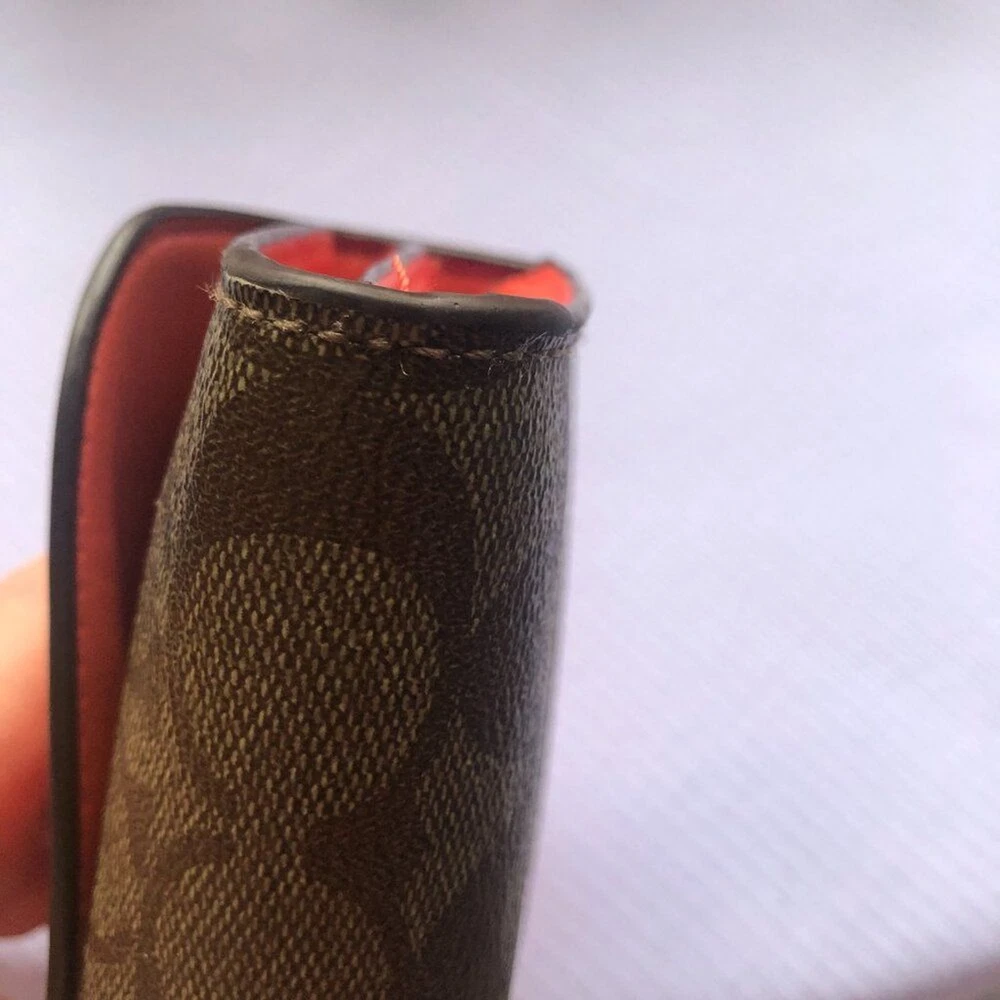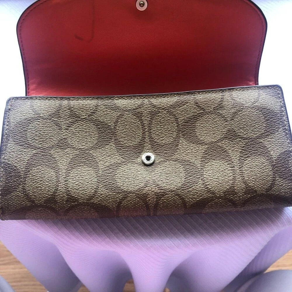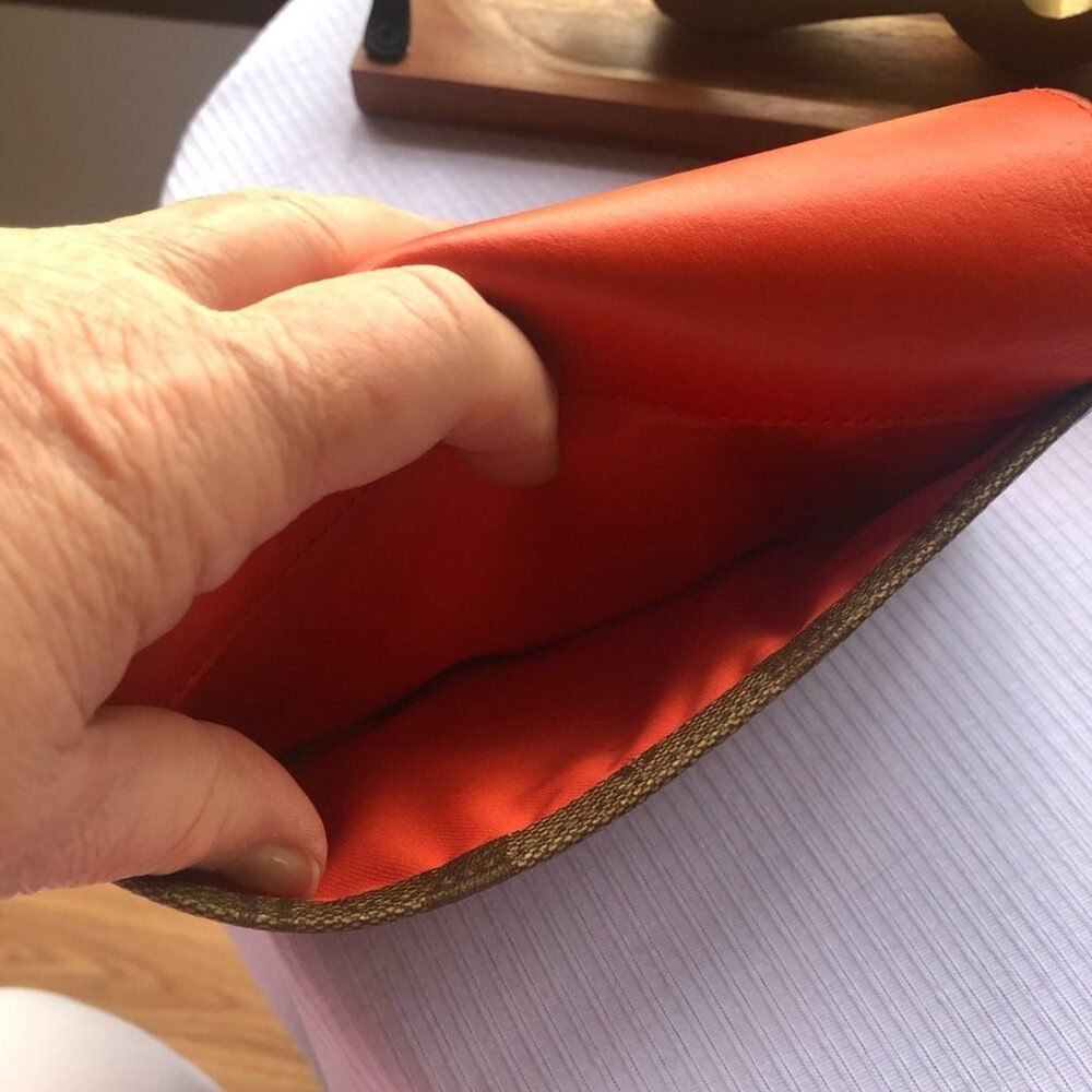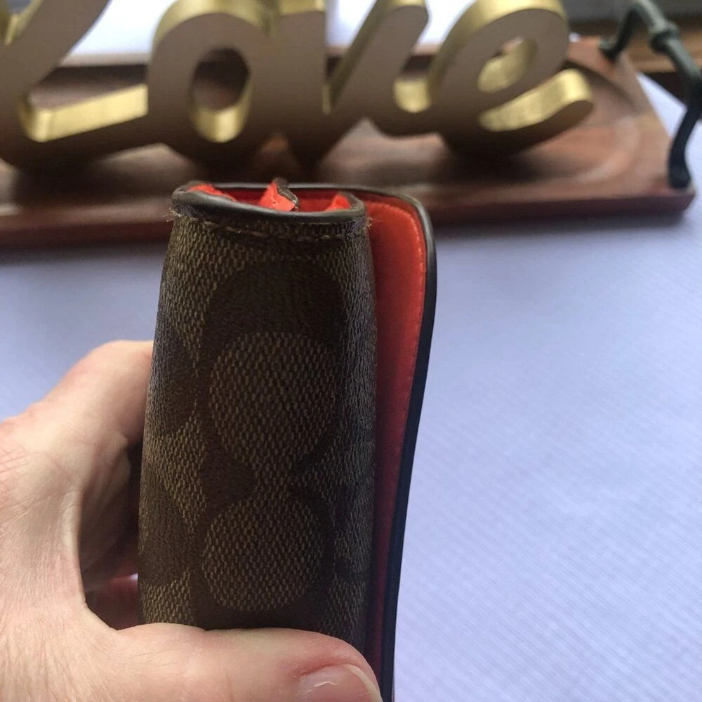 Coach Signture PVC Slim Envelope Wallet in Khaki/Red Orange with Silvertone hardware. Features: -Signature PVC with crossgrain Leather -12 bank /store card slots -Full-length bill compartment -Zip pocket -Snap closure -Outside open pocket See pictures on callouts: ink mark inside of flap, one torn card slot but slot is still functional, small ink mark on another card slot, bill slot needs cleaning. Zipper and snap are in good working order. No callouts noted on the outside of wallet. Measurements are: 8" length & 4" wide and approx. 1" diameter Coach number is E1792/F54022 Inventory Item #24-105