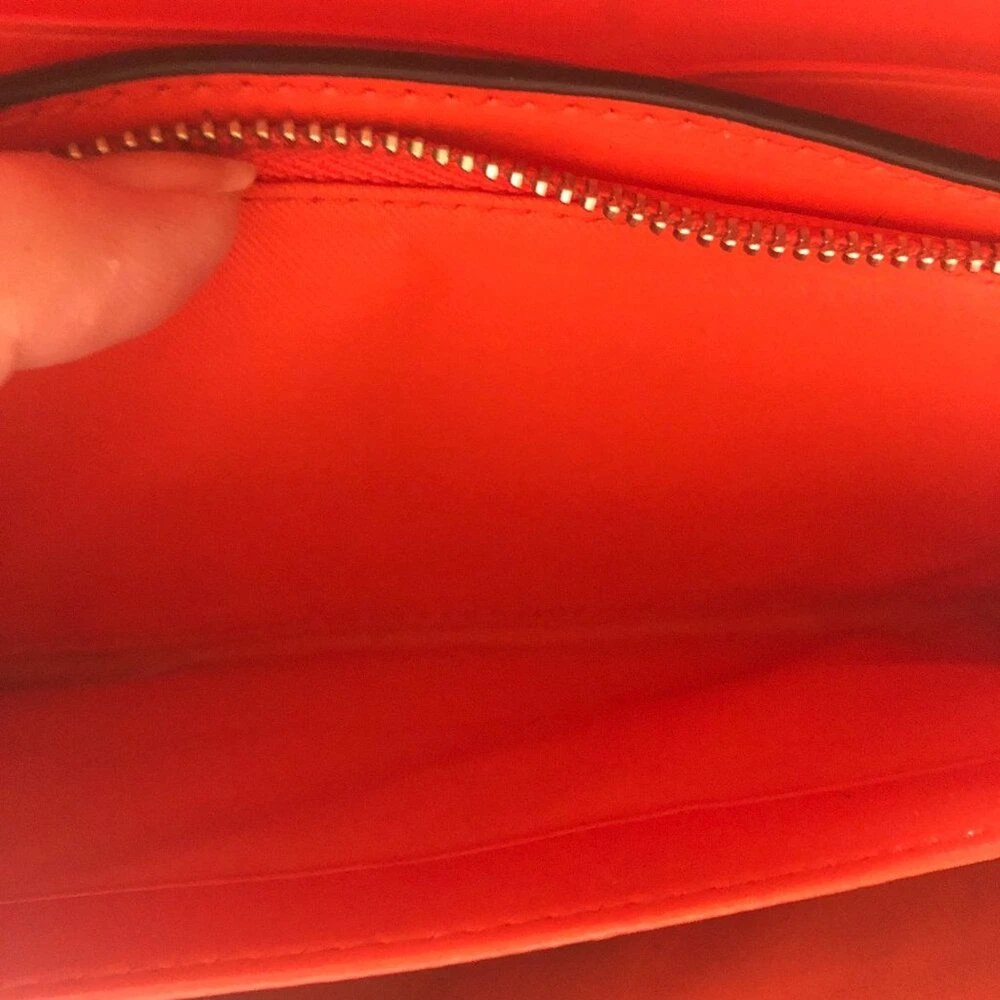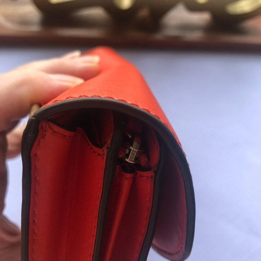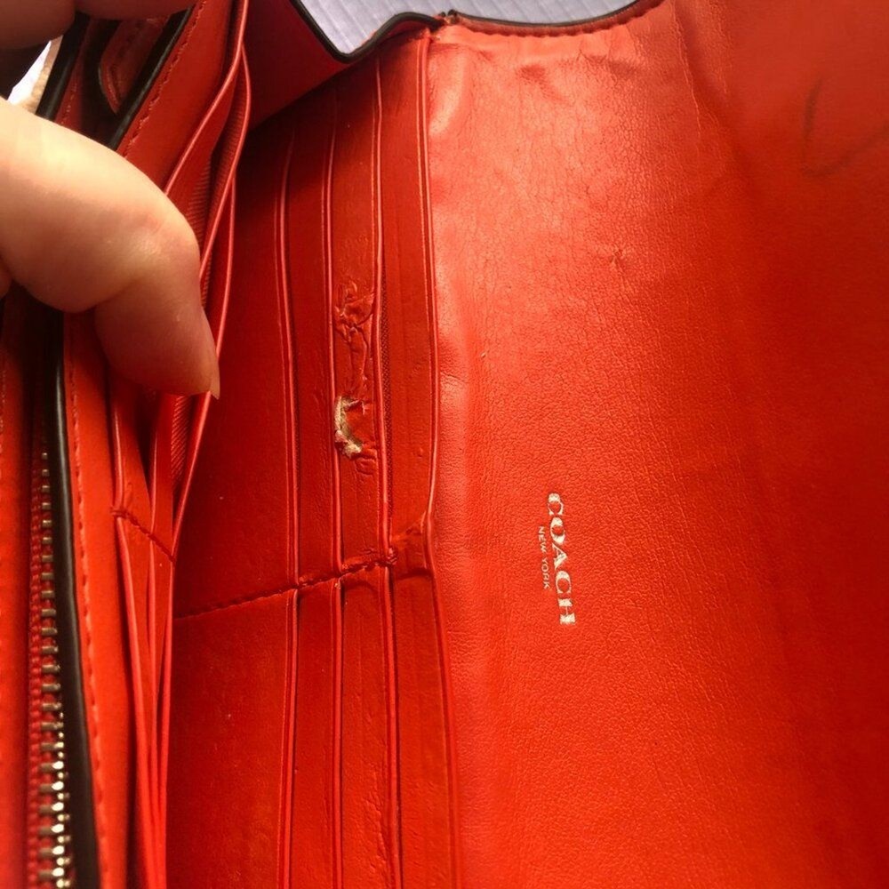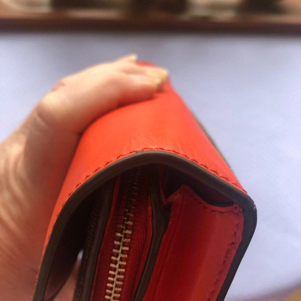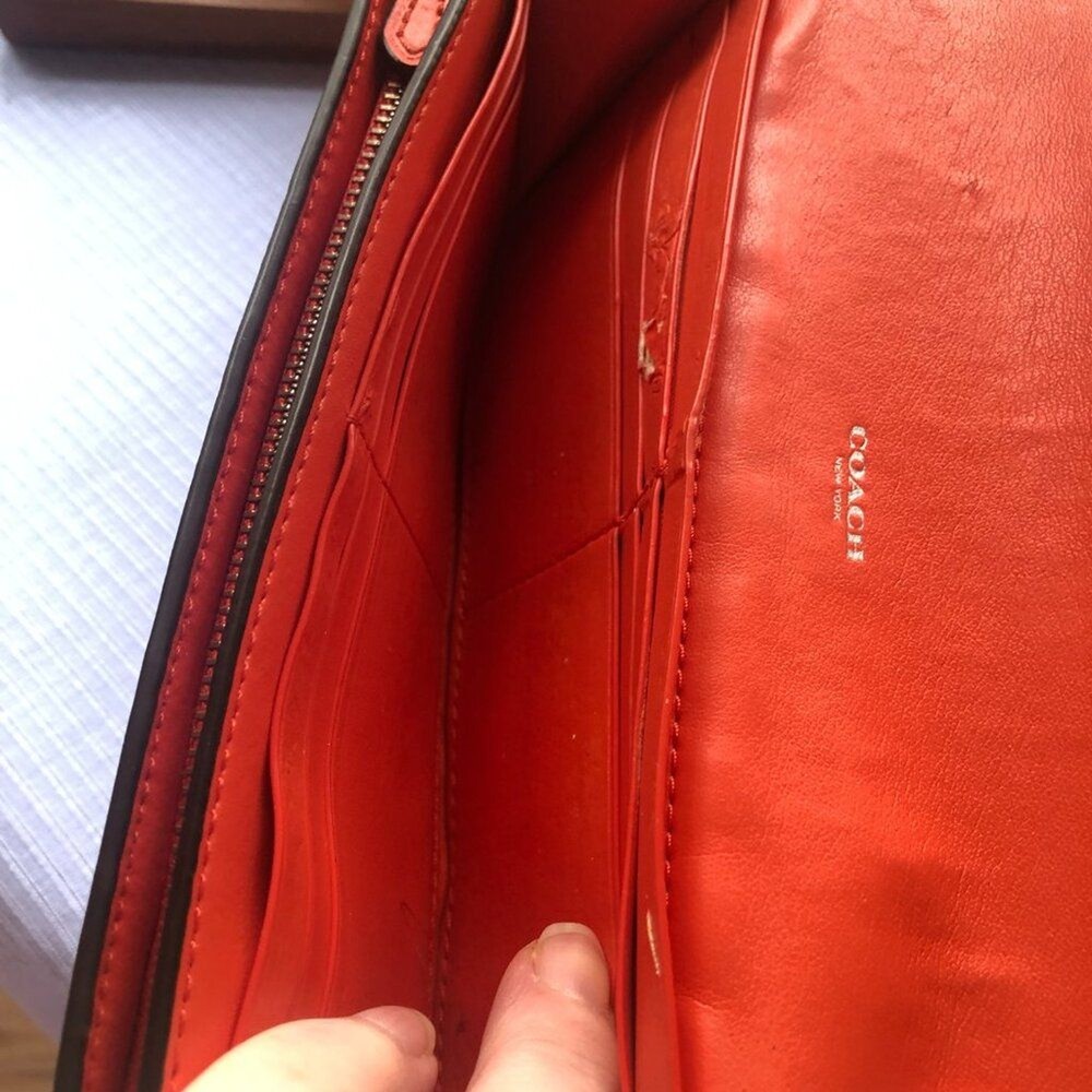 Coach Signture PVC Slim Envelope Wallet in Khaki/Red Orange with Silvertone hardware. Features: -Signature PVC with crossgrain Leather -12 bank /store card slots -Full-length bill compartment -Zip pocket -Snap closure -Outside open pocket See pictures on callouts: ink mark inside of flap, one torn card slot but slot is still functional, small ink mark on another card slot, bill slot needs cleaning. Zipper and snap are in good working order. No callouts noted on the outside of wallet. Measurements are: 8" length & 4" wide and approx. 1" diameter Coach number is E1792/F54022 Inventory Item #24-105