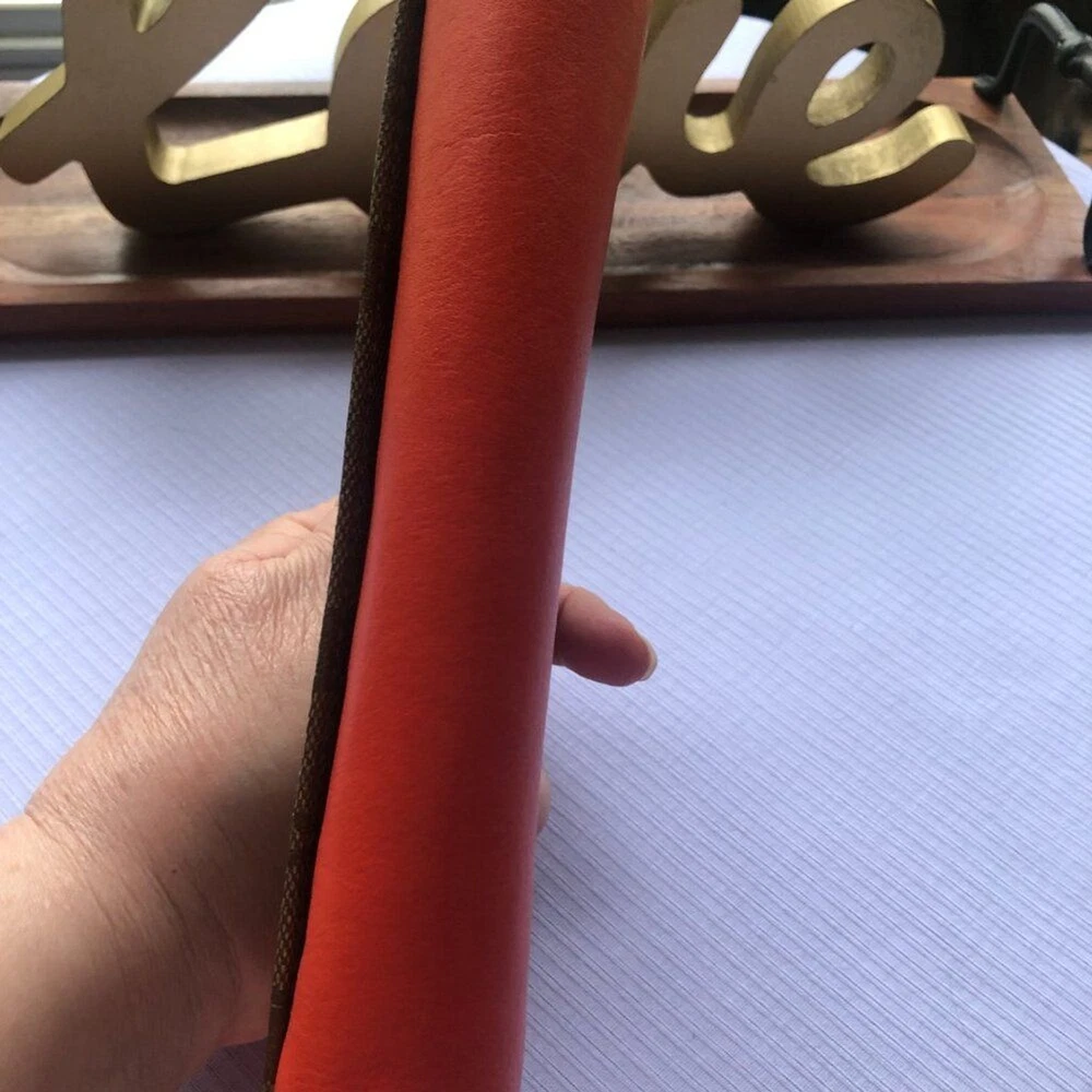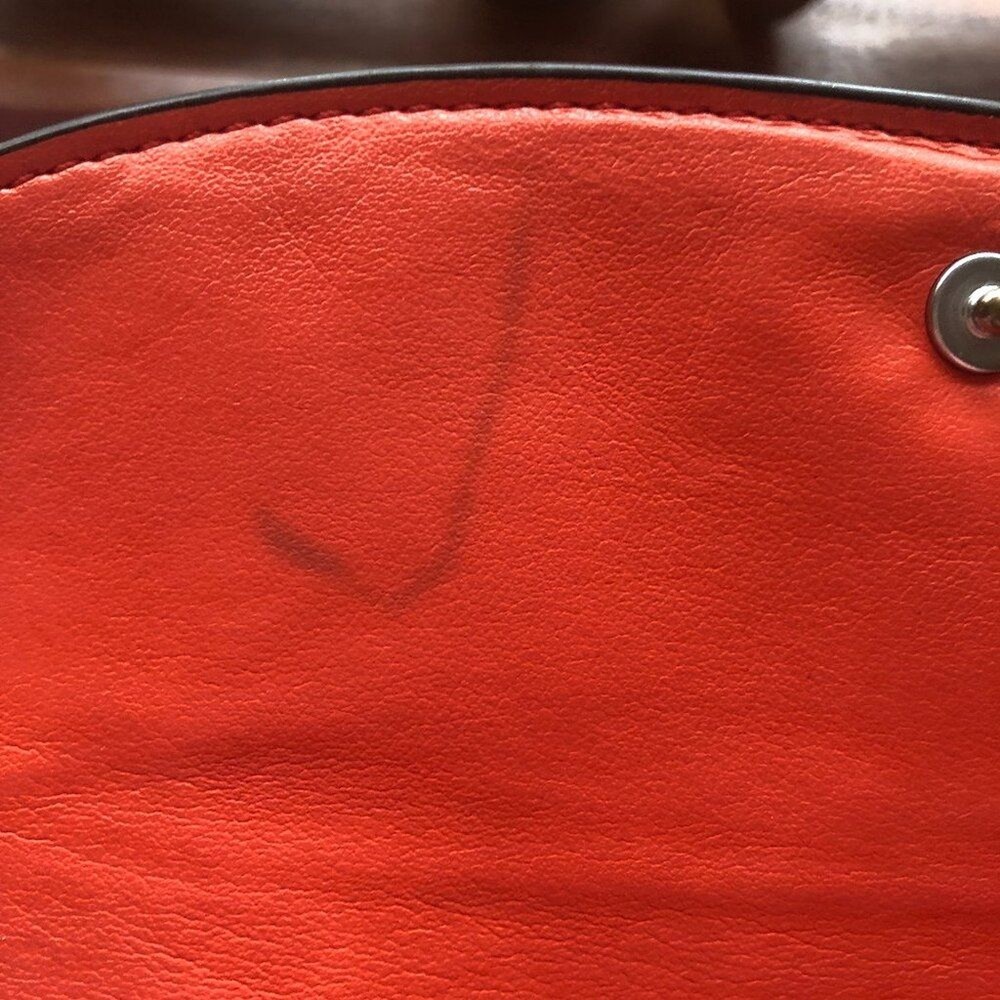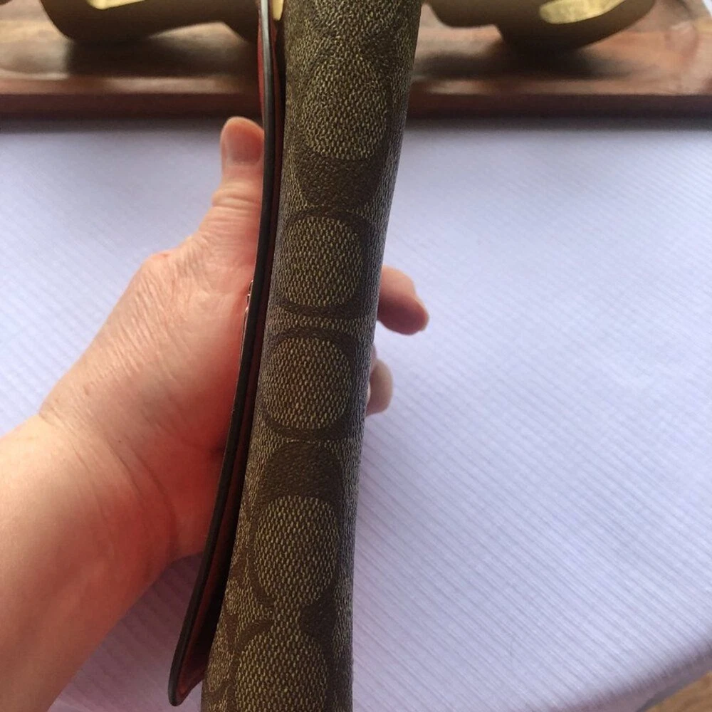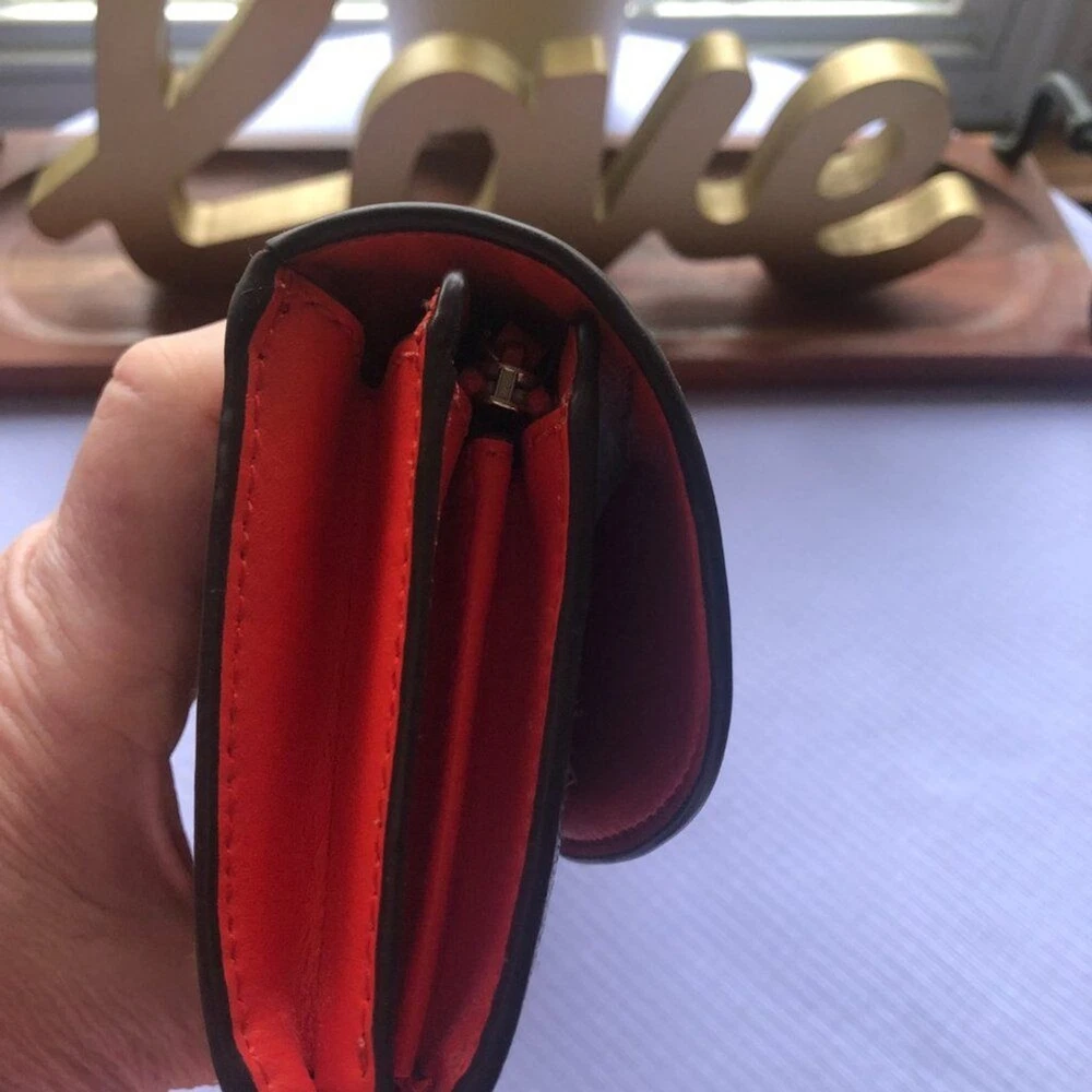 Coach Signture PVC Slim Envelope Wallet in Khaki/Red Orange with Silvertone hardware. Features: -Signature PVC with crossgrain Leather -12 bank /store card slots -Full-length bill compartment -Zip pocket -Snap closure -Outside open pocket See pictures on callouts: ink mark inside of flap, one torn card slot but slot is still functional, small ink mark on another card slot, bill slot needs cleaning. Zipper and snap are in good working order. No callouts noted on the outside of wallet. Measurements are: 8" length & 4" wide and approx. 1" diameter Coach number is E1792/F54022 Inventory Item #24-105