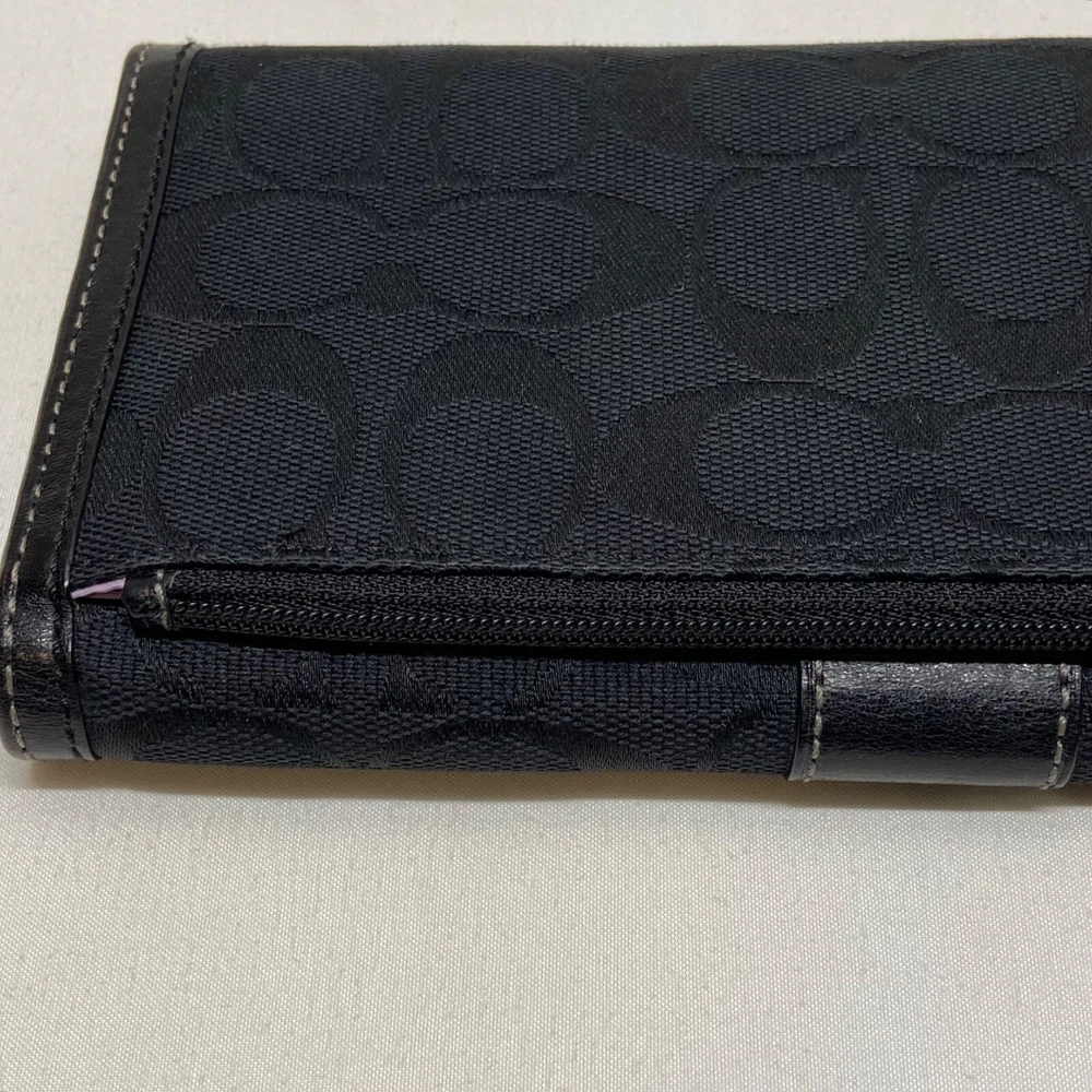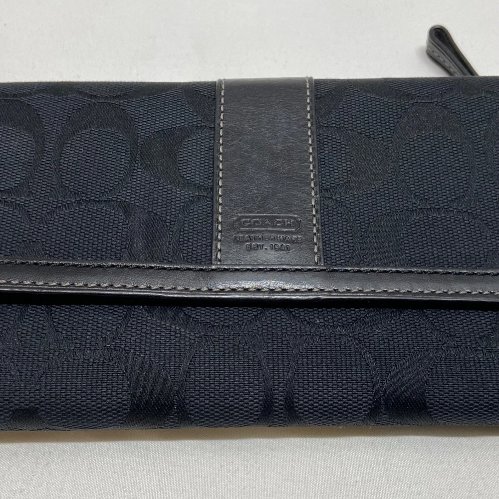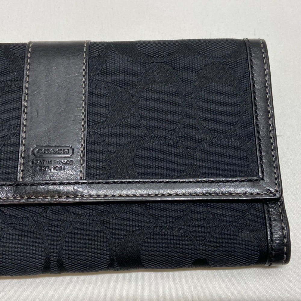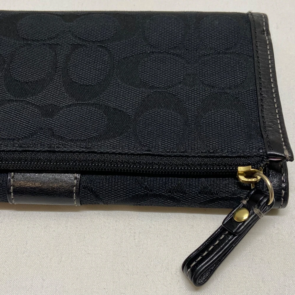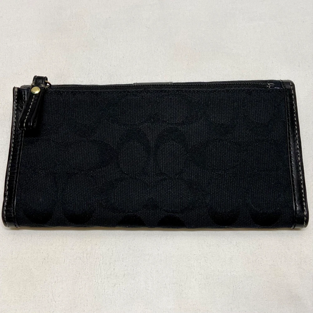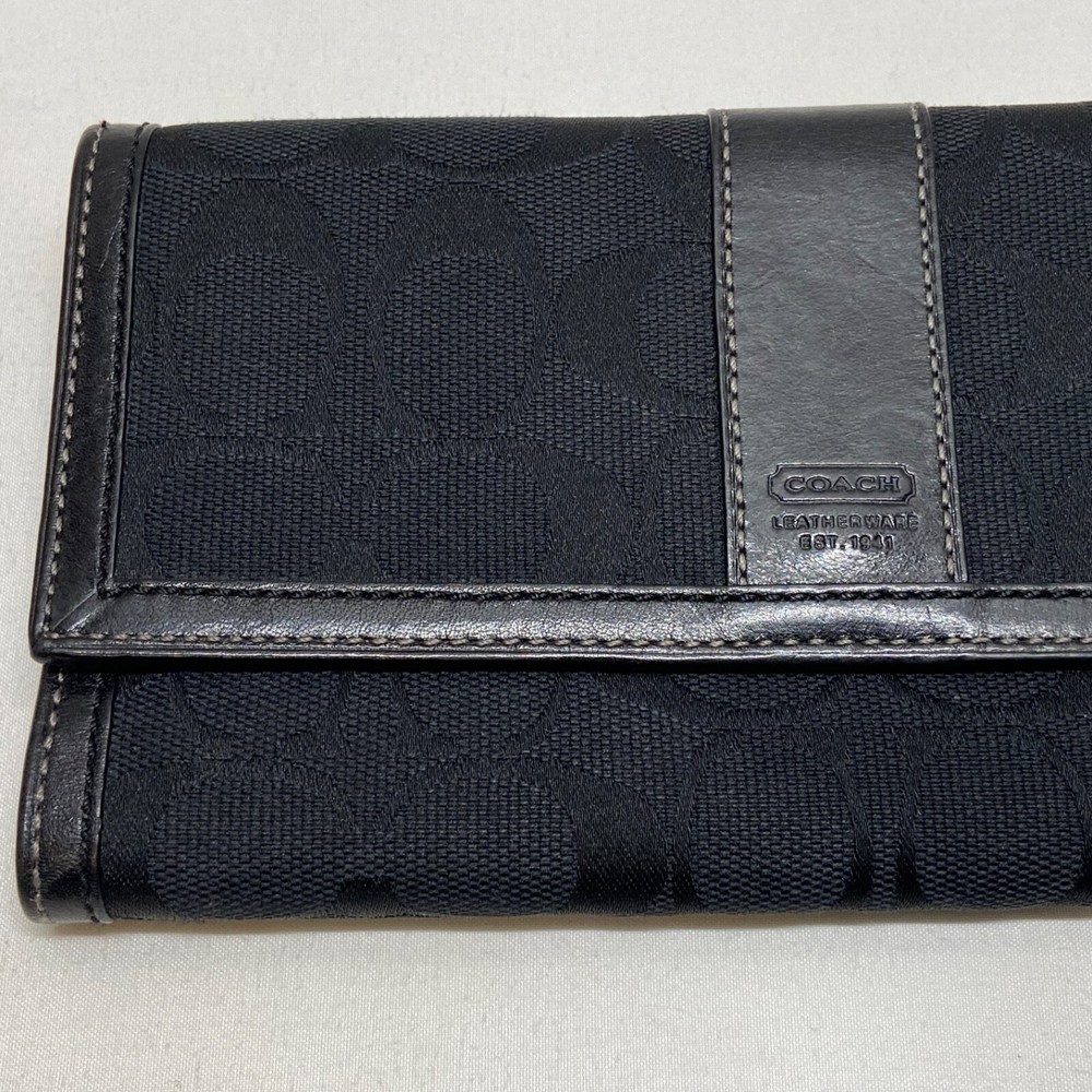 Coach Legacy Slim Trifold Wallet Signature Logo Black Canvas Leather Trim EUC This ladies wallet is in excellent pre-owned condition with minimal signs of use. Please see all photos as this is the exact item you will receive. Snap Front closure, inside features 6 card slots, ID slot and bill holder. There is also a zippered coin pocket on the back. Dimensions are 7.5" w, 4.5" h and .5" deep. Thanks for looking!