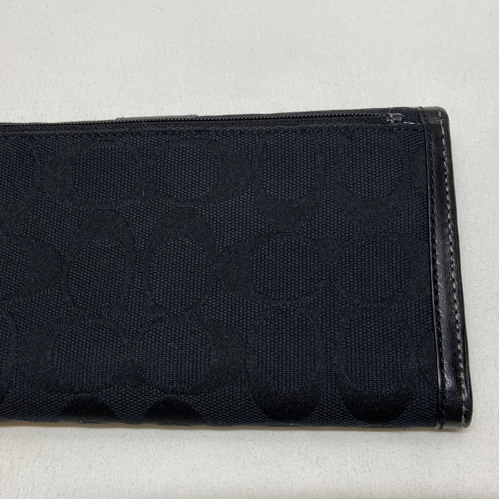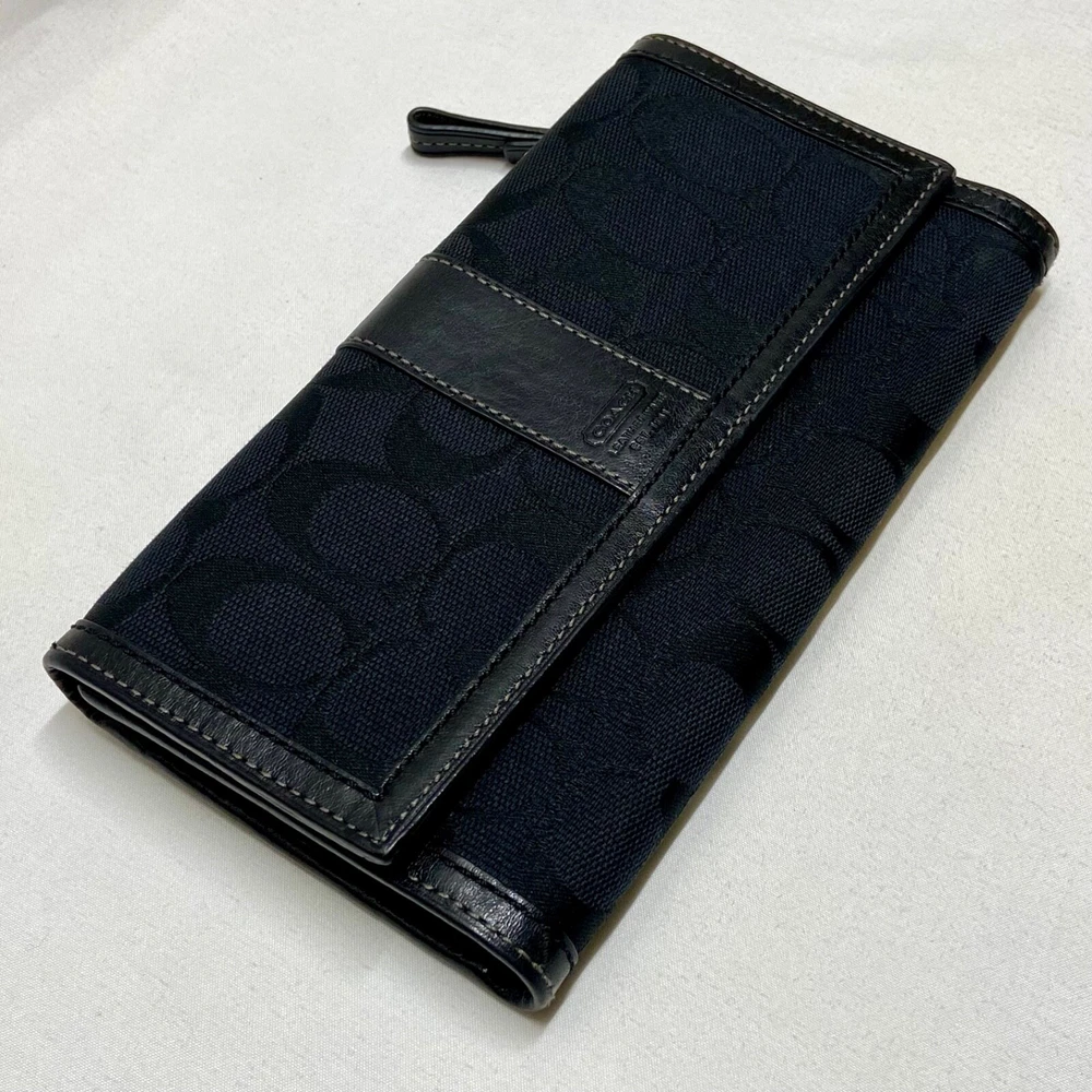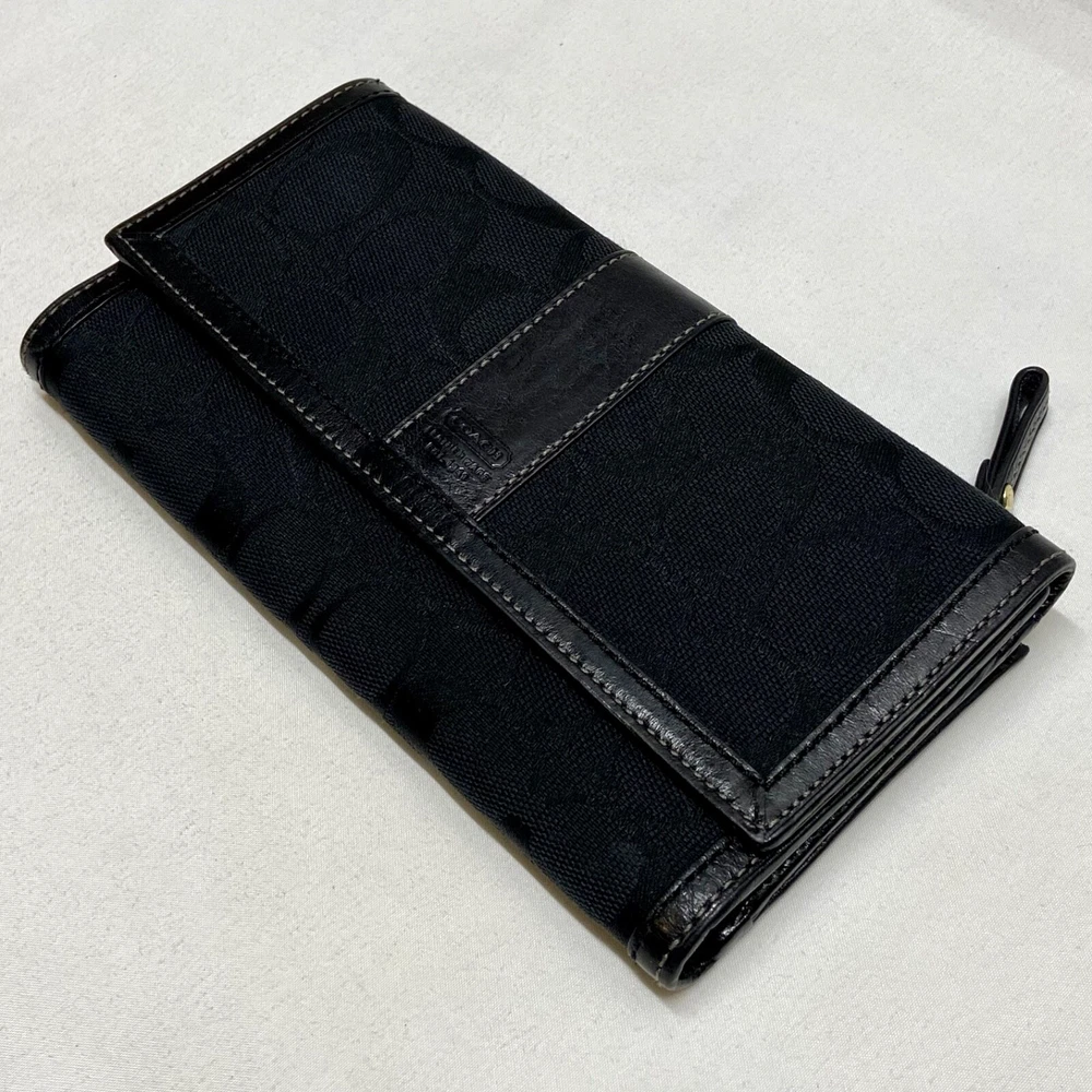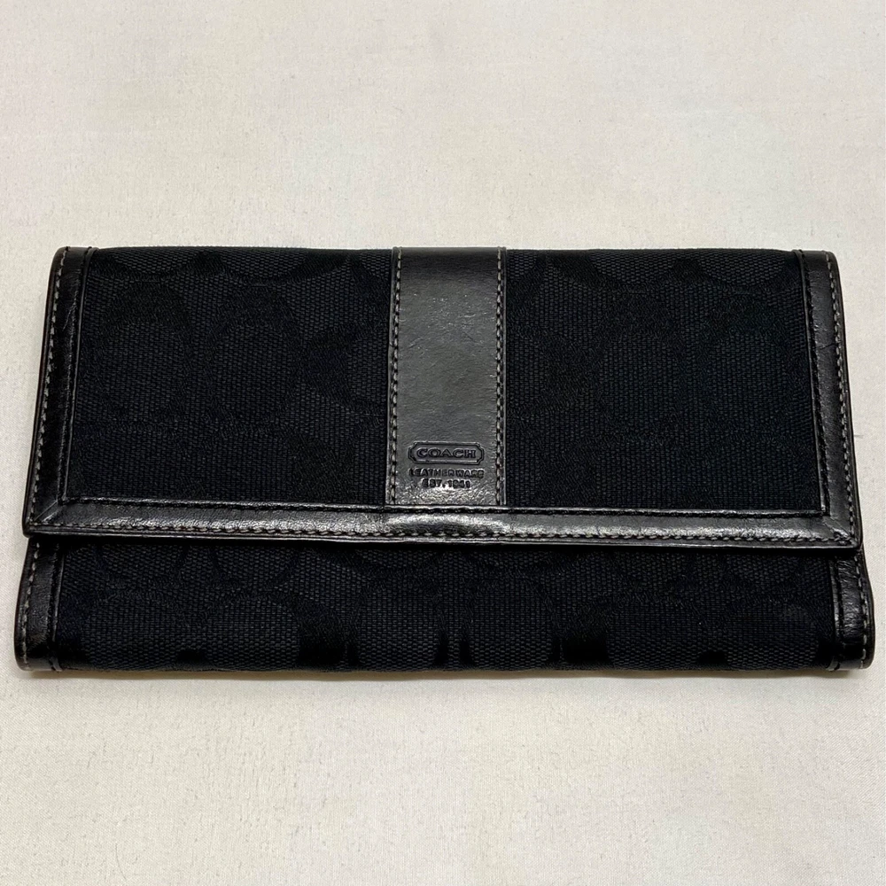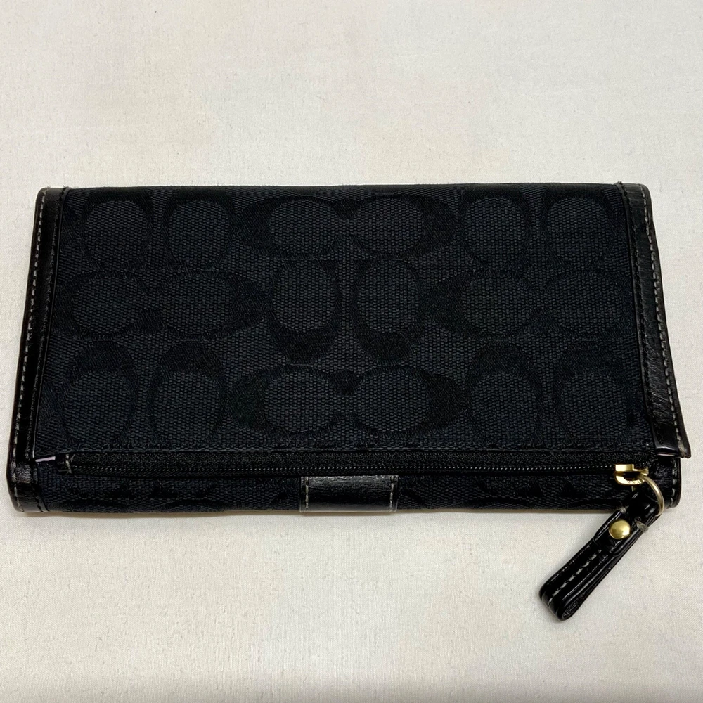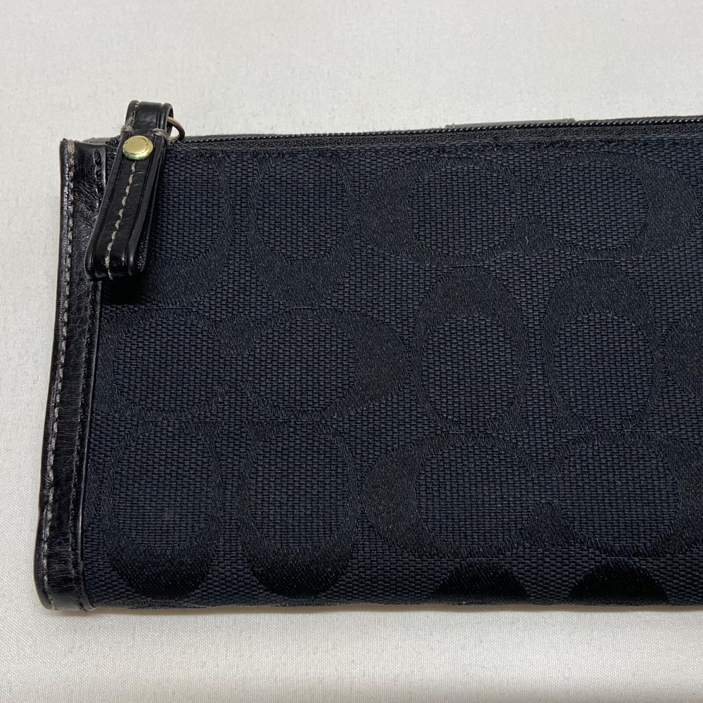 Coach Legacy Slim Trifold Wallet Signature Logo Black Canvas Leather Trim EUC This ladies wallet is in excellent pre-owned condition with minimal signs of use. Please see all photos as this is the exact item you will receive. Snap Front closure, inside features 6 card slots, ID slot and bill holder. There is also a zippered coin pocket on the back. Dimensions are 7.5" w, 4.5" h and .5" deep. Thanks for looking!