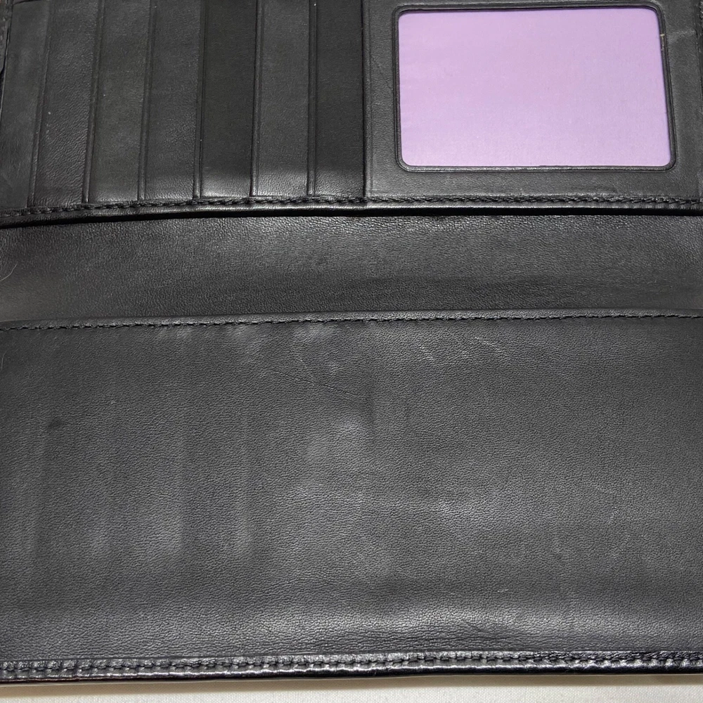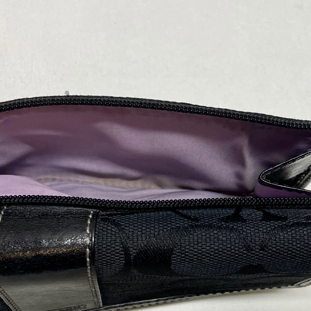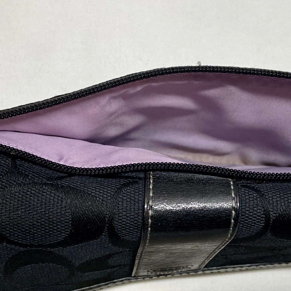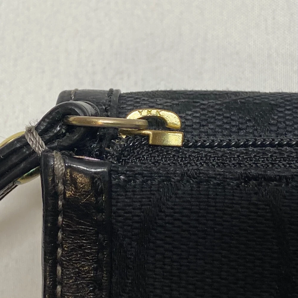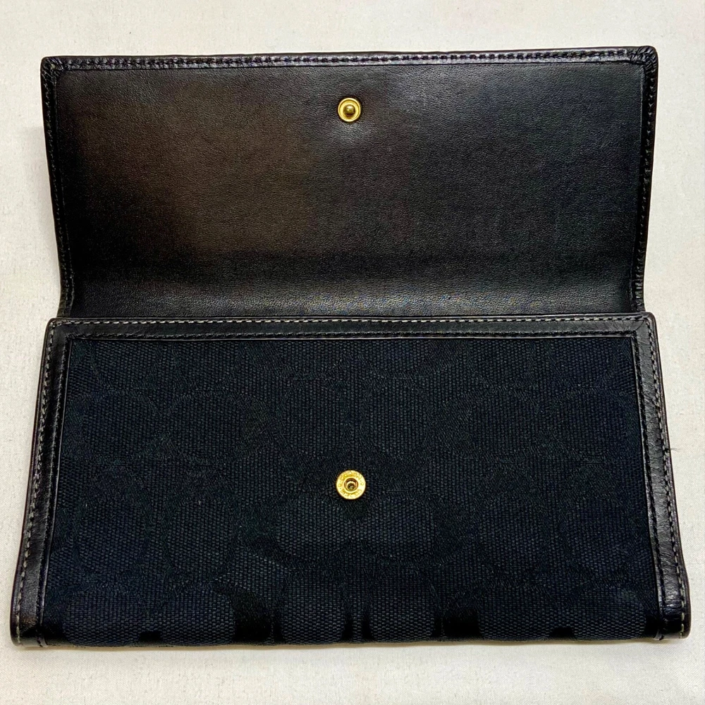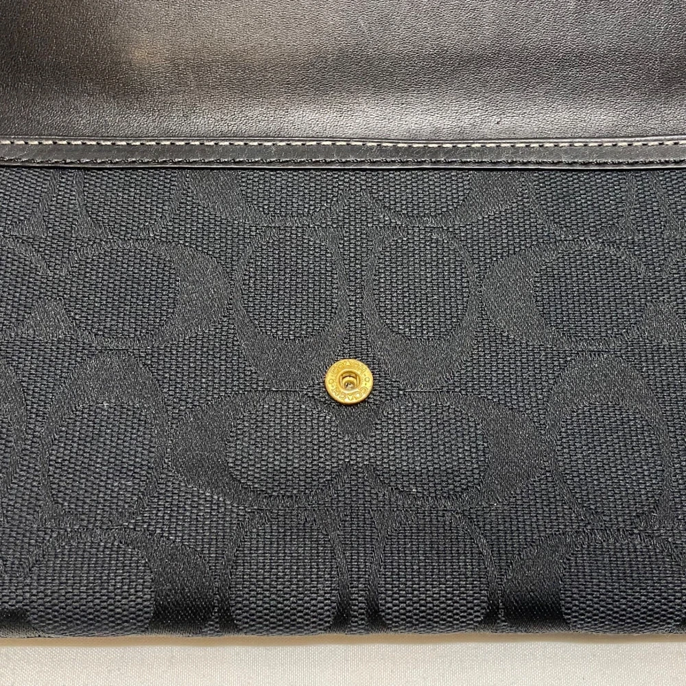 Coach Legacy Slim Trifold Wallet Signature Logo Black Canvas Leather Trim EUC This ladies wallet is in excellent pre-owned condition with minimal signs of use. Please see all photos as this is the exact item you will receive. Snap Front closure, inside features 6 card slots, ID slot and bill holder. There is also a zippered coin pocket on the back. Dimensions are 7.5" w, 4.5" h and .5" deep. Thanks for looking!