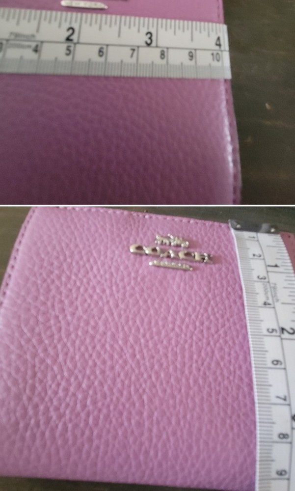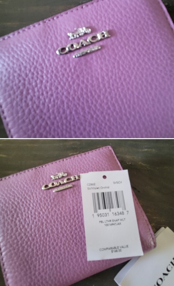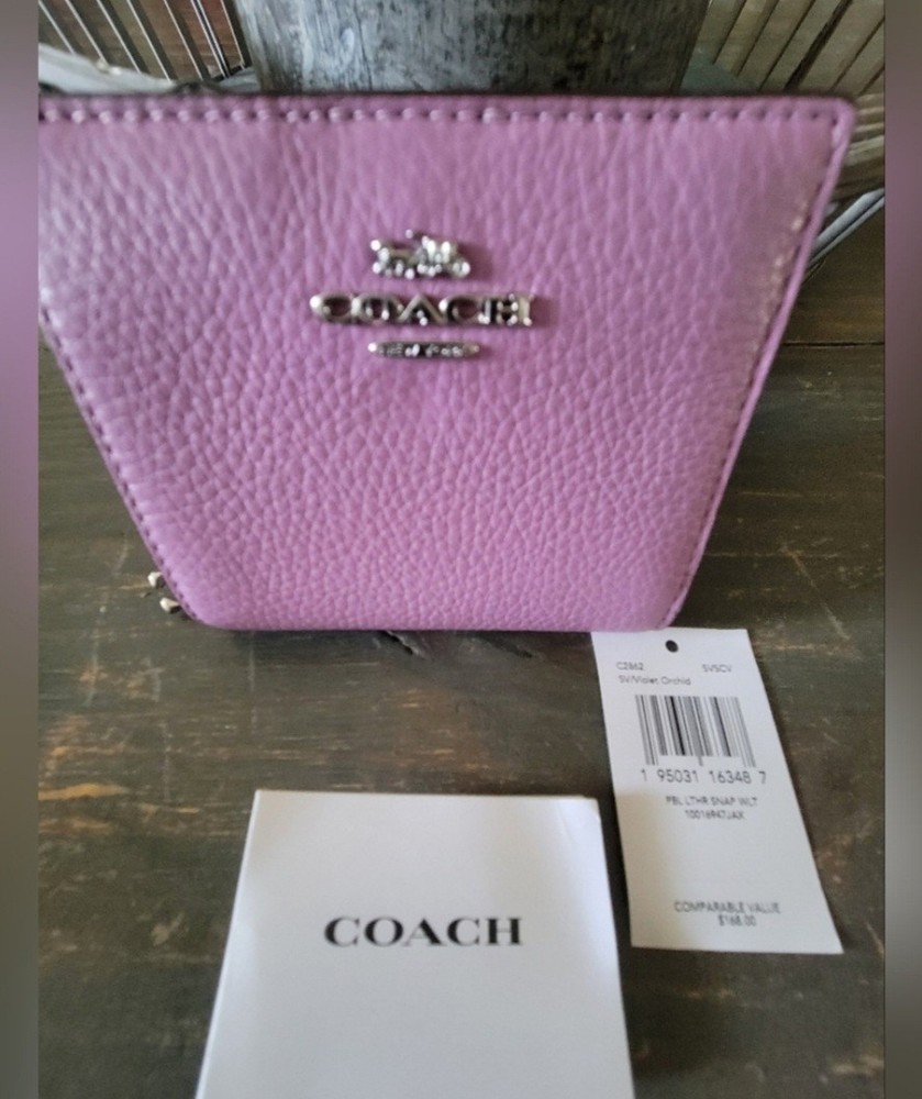 This Coach Women's Leather Wallet in unique lilac is a stylish accessory perfect for any woman. The wallet features a solid purple color with credit card accents and a zip-around style. It is made of high-quality leather and bears the iconic Coach logo, making it a chic and practical choice for organizing your essentials. The wallet is new with tags, adding to its appeal for those looking for a designer piece.