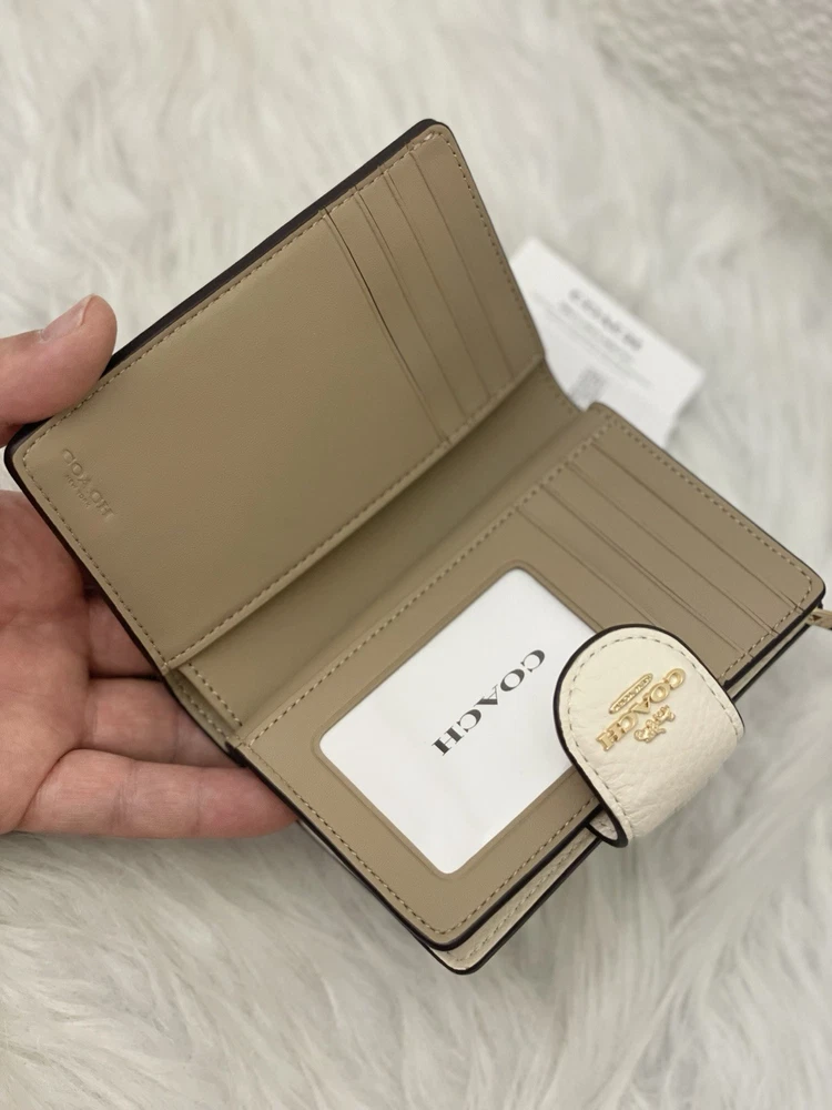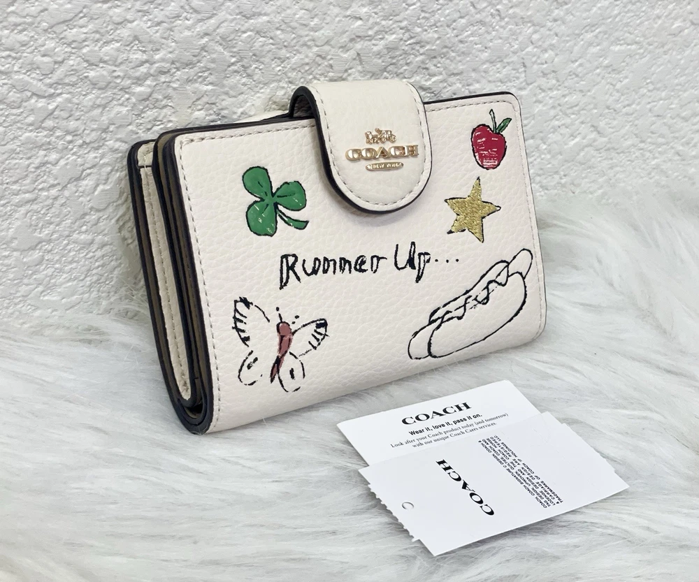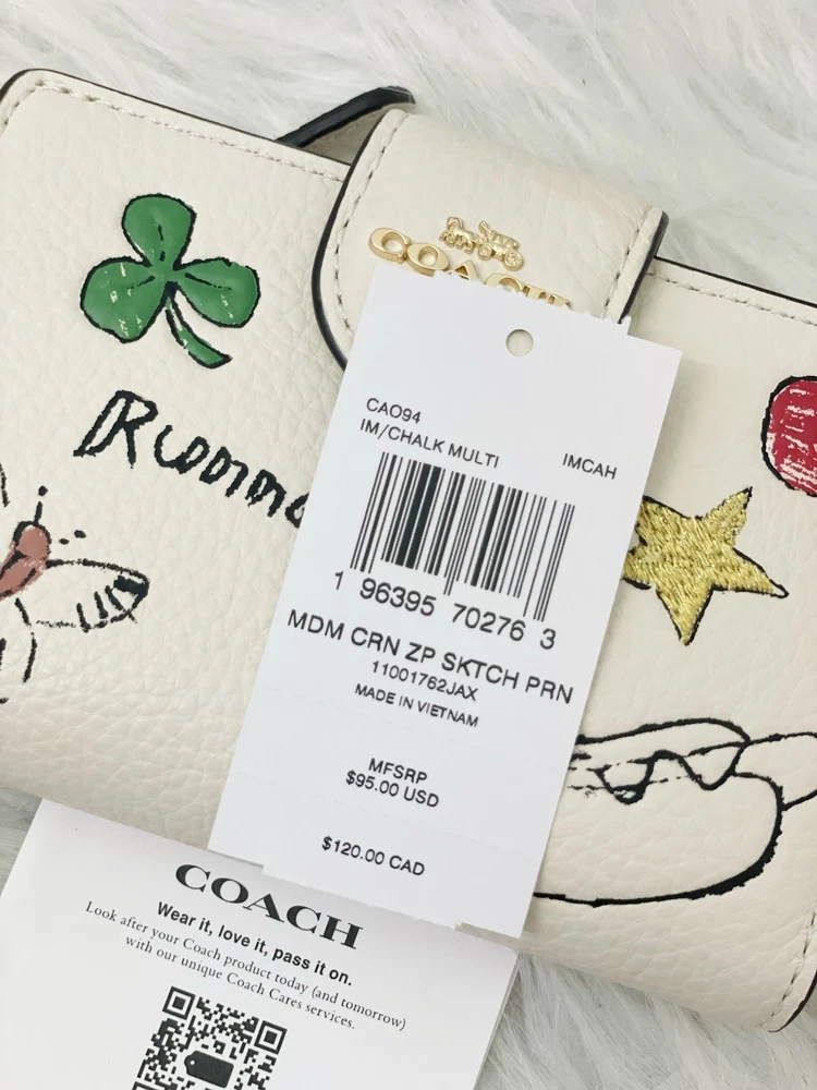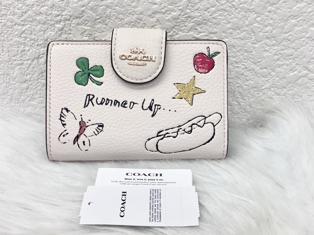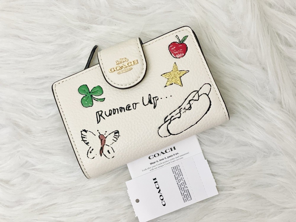 Coach Medium Corner Zip Wallet With Sketch Print Color: Gold/Chalk Multi From smoke and pet free environment. 100% Authentic Guaranteed Product Details: STYLE NUMBER: CAO94 MEASUREMENTS Length: 5.0" Height: 3.5" Width: 0.5" MATERIALS Refined pebble leather FEATURES Seven credit card slots Snap closure Bill compartment ADDITIONAL DETAILS ID window Shipping is within 24 Hours with USPS Price is firm