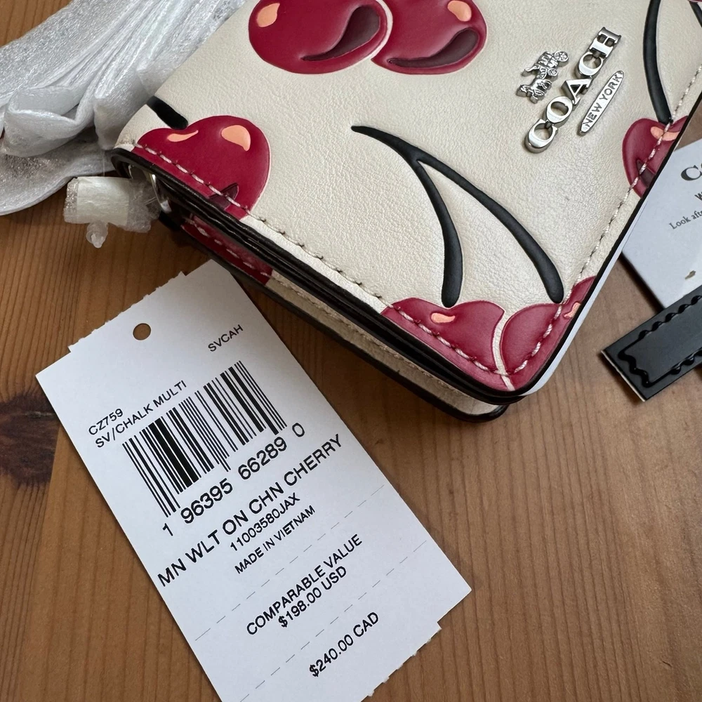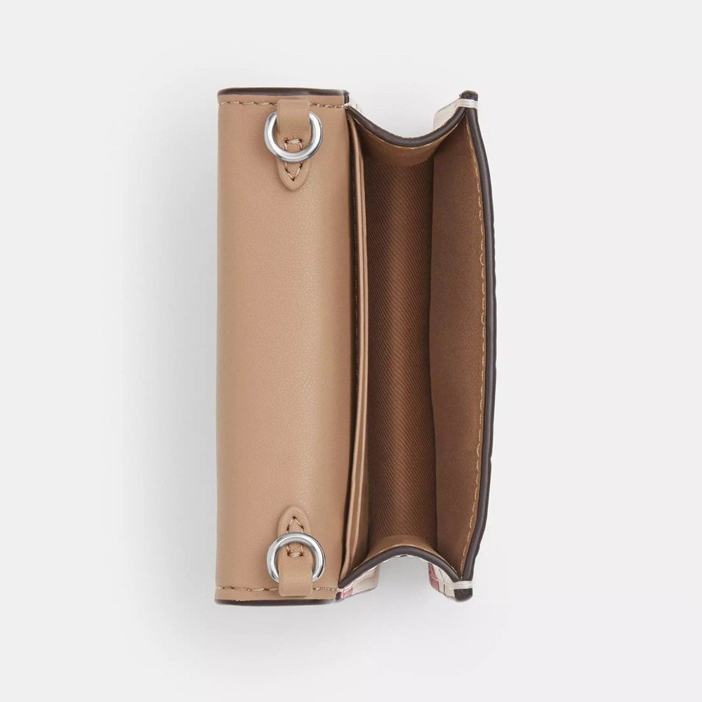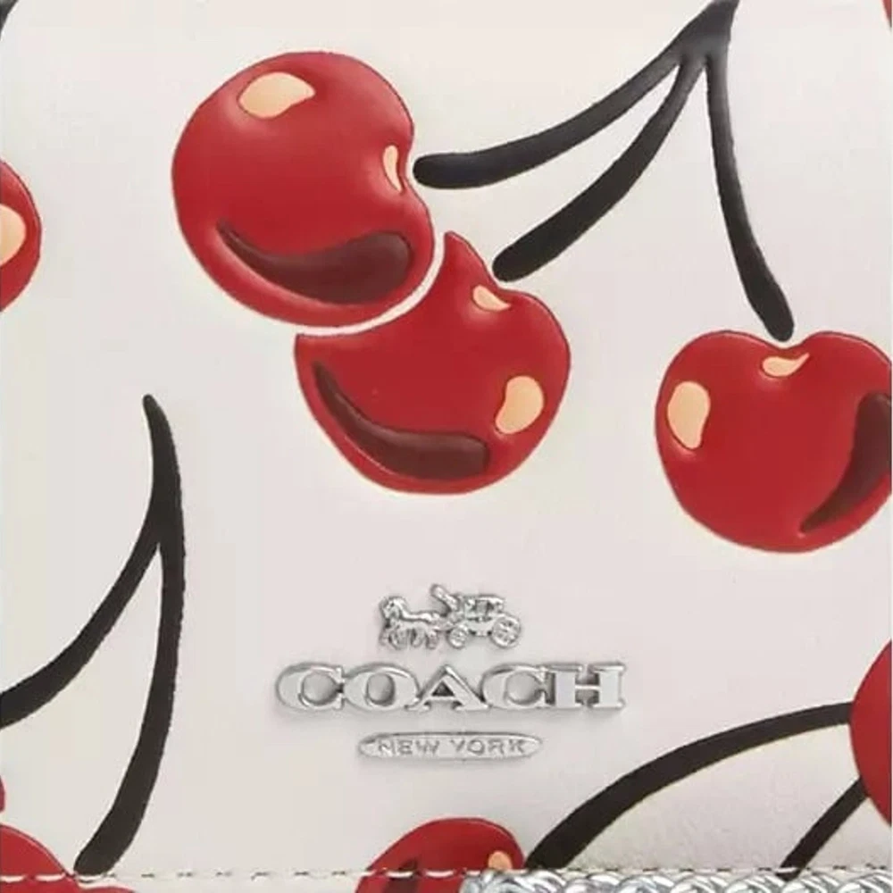Silver/Chalk Multi CZ759 Measurements Length: 8.0" Height: 4.75" Width: 1.0" Materials Signature coated canvas and refined pebble leather Fabric lining Strap Detachable chain strap with 23.25" drop for shoulder or crossbody wear Features Outside open pocket Two credit card slots Snap closure The Mini Wallet on a Chain is an elevated essential for every day. Crafted of Signature coated canvas and refined pebble leather, this cherry mini wallet is stylish yet compact for on the go. Lightweight to carry, it features an outside open pocket, two credit card slots, and enough space for your keys, card case and other small essentials. The detachable chain strap allows for versatile shoulder or crossbody wear, making it a functional accessory that completes your look. Perfect for a day out or a night on the town, this cherry wallet on a chain adds a playful touch to any outfit.