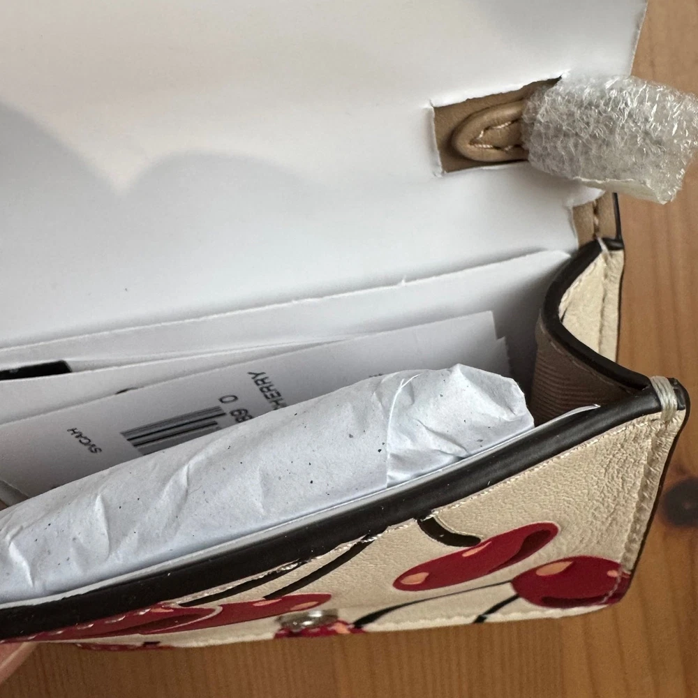 Bag came brand new. It's so cute! I was disappointed that it wasn't exactly like in the picture. The one I got had the cherries upside down which isn't what I was expecting. That's my bad though for not just asking the seller first. I still love it though. My first coach bag! Good price and amazing seller. Thank you!