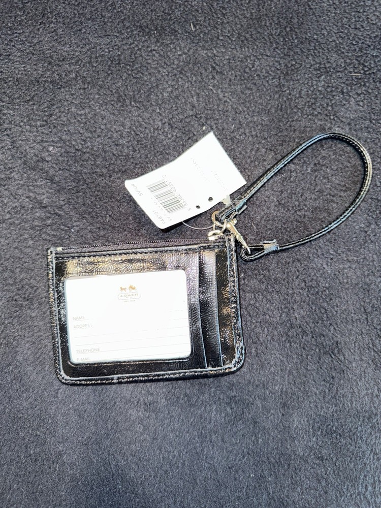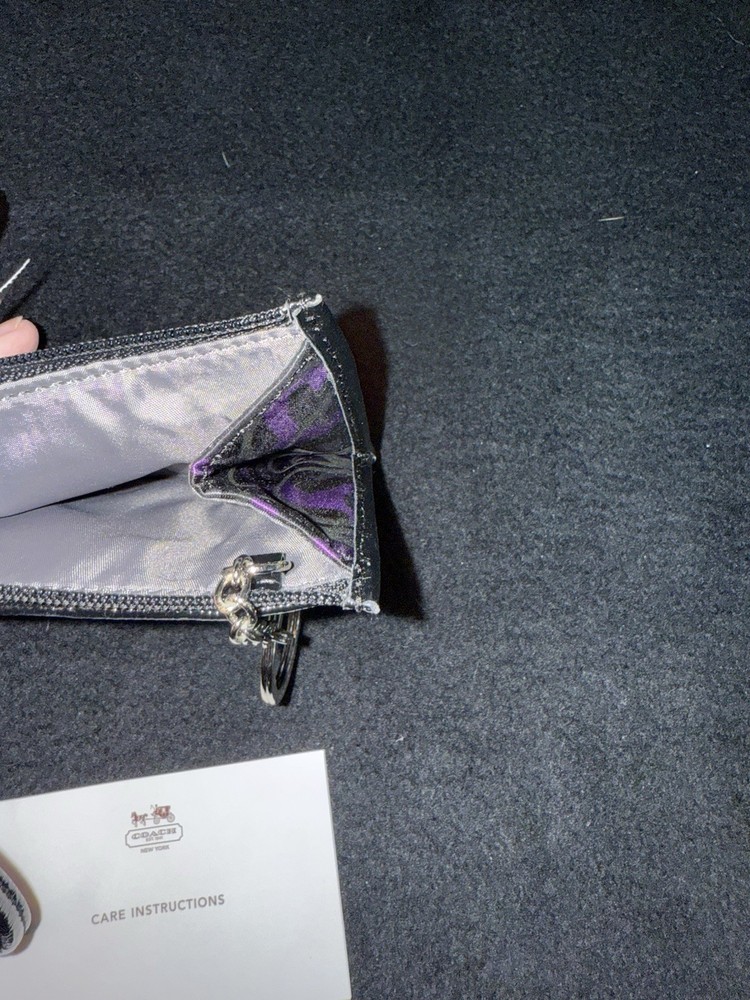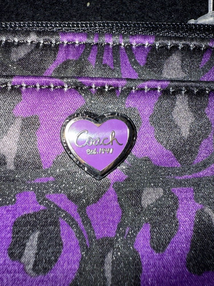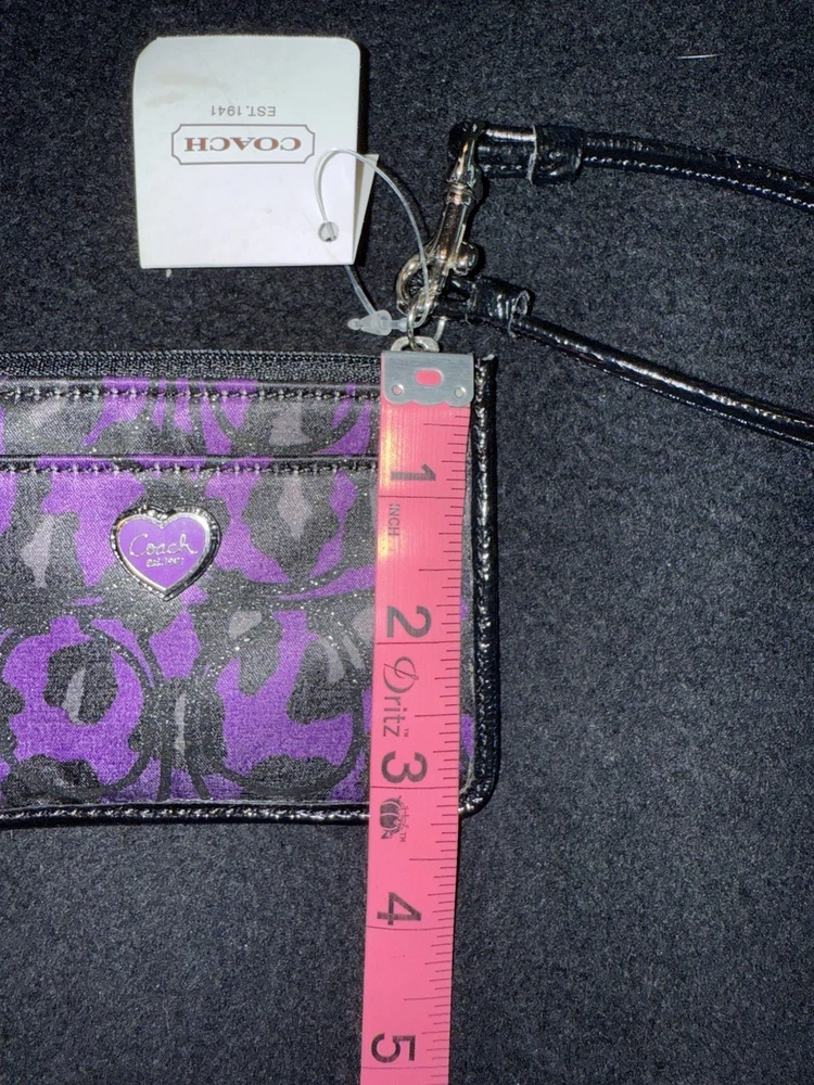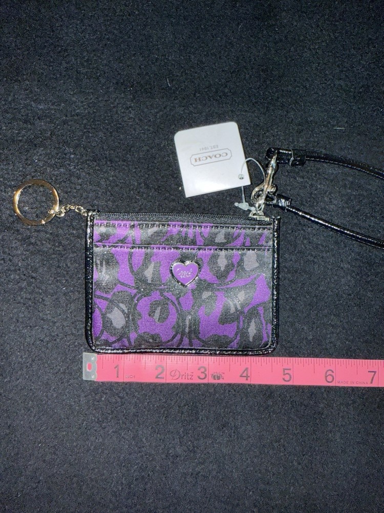 The Coach NWT Purple Black Wristlet Wallet is a stylish and functional accessory for women, featuring black leather accents that add a touch of sophistication. This small-sized wallet includes credit card slots for organization and a wristlet strap for convenient carrying. The purple color adds a vibrant pop to the classic design, making it a fashionable choice for everyday use. Made with quality materials and expert craftsmanship, this Coach wallet is both practical and chic, perfect for any fashion-forward woman.