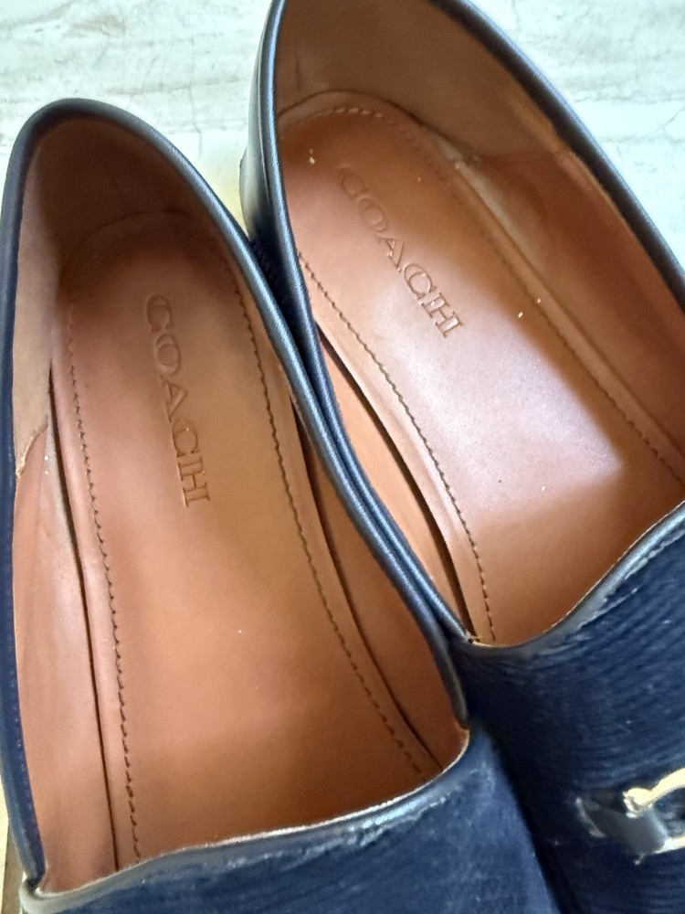 The Coach Haley Loafers in Navy Corduroy are a stylish and versatile pair of women's shoes in size 11. Featuring an almond toe shape and slip-on closure, these loafers are perfect for casual, formal, workwear, or business occasions. The navy blue corduroy fabric with a horsebit buckle accent adds a touch of sophistication to the design. Made with man-made leather lining and a rubber outsole, these loafers are durable and comfortable for year-round wear. The classic Coach brand and loafer style make them a timeless addition to any wardrobe.
