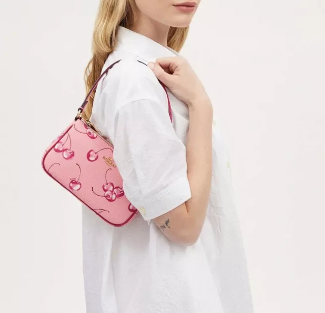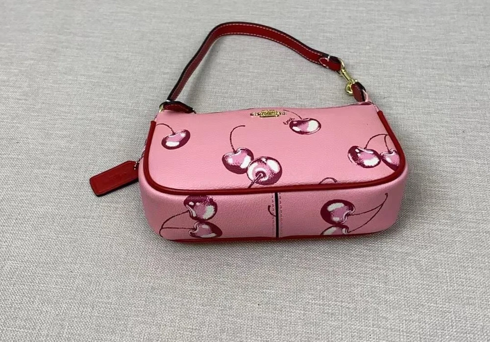 NWT Coach Nolita Women's Shoulder Leather Bag Purse with Cherry Print This Coach Nolita shoulder bag is a stylish addition to any wardrobe. With a beautiful cherry print and made from high-quality leather, this bag is perfect for any woman looking for a fashionable and functional accessory. The bag has a spacious interior and features multiple compartments for storing your essentials. It also comes with a comfortable shoulder strap for easy carrying. Whether you're going to work or out for a night on the town, this bag is sure to complement any outfit.