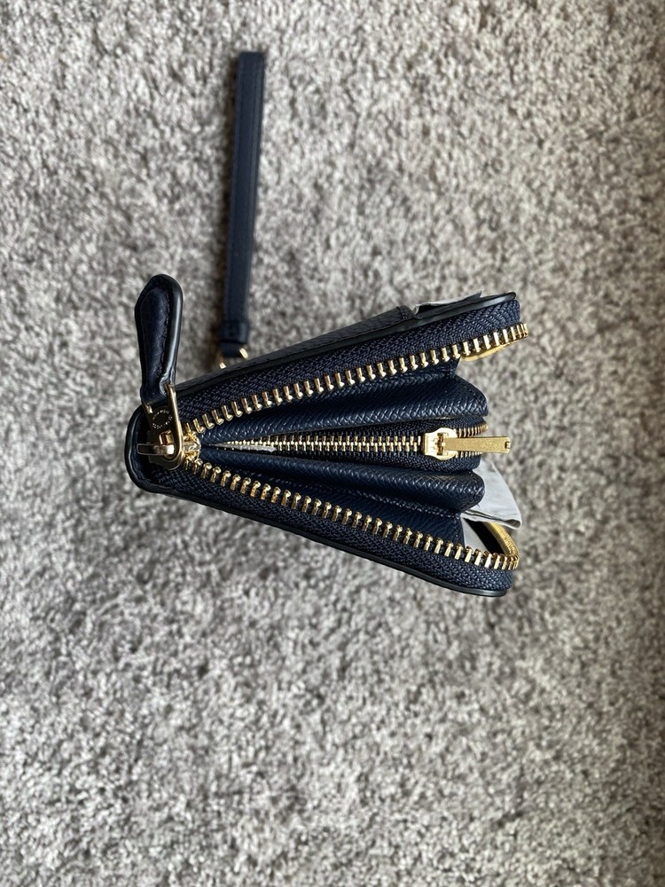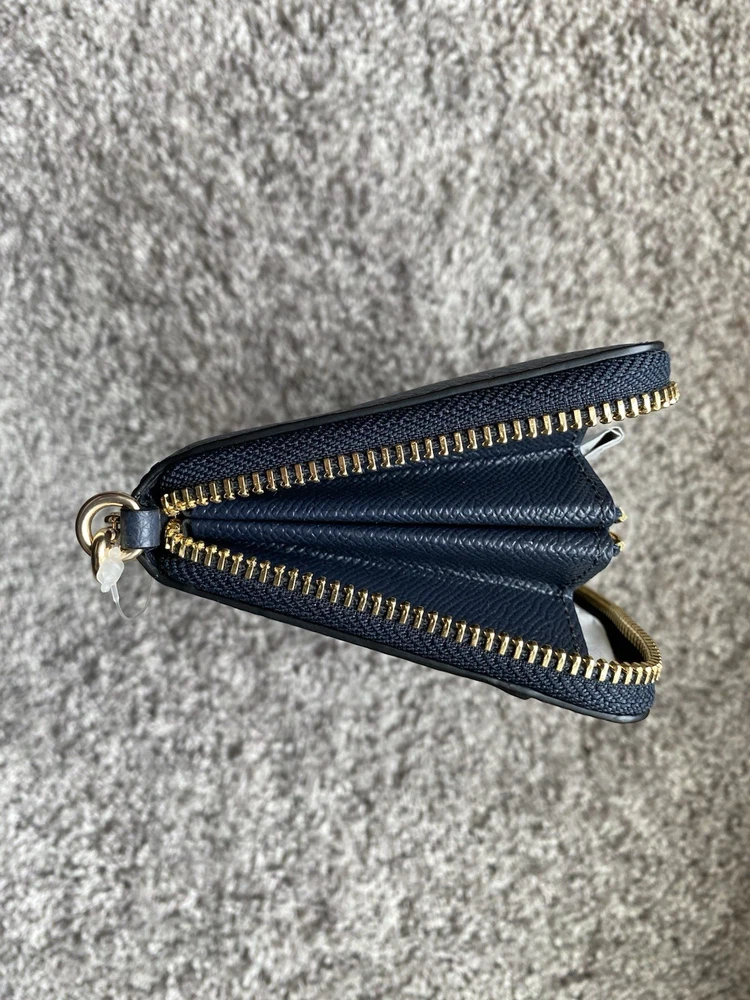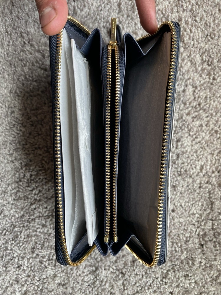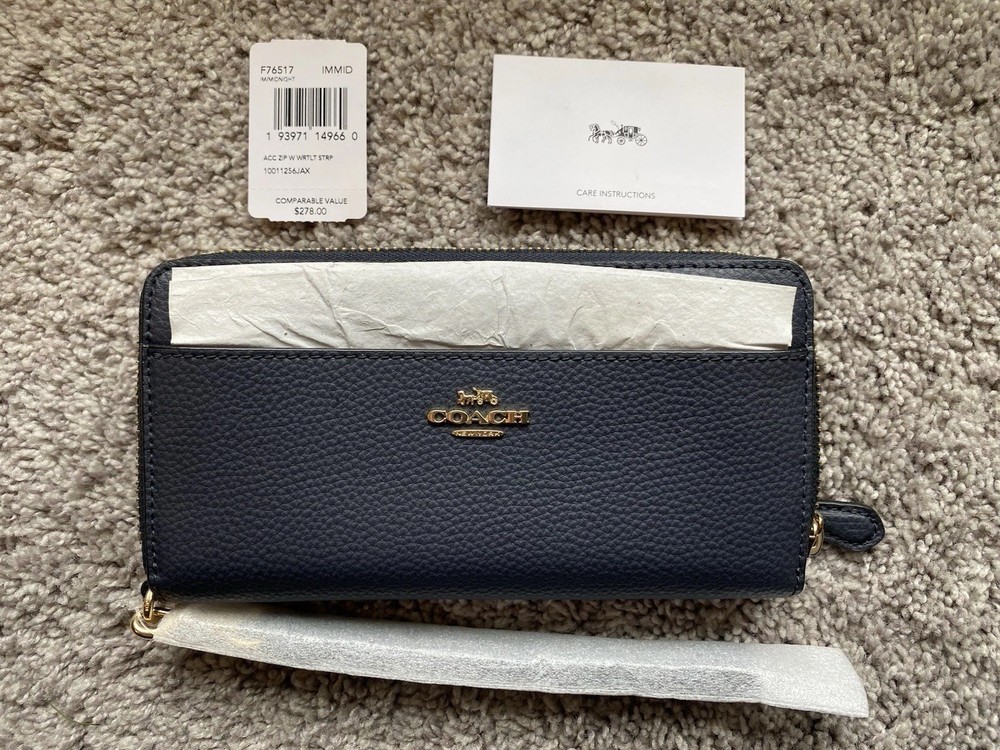 The Coach F76517 Pebbled Leather Wallet Accordion Zip Around in Midnight Blue is a stylish and practical accessory for women. Made from high-quality leather with a pebbled texture, this wallet features a zip-around closure for added security, as well as a wristlet strap for ease. The solid midnight blue color adds a touch of sophistication, while the interior includes credit card slots and an organizer for keeping essentials in order. The metal accents give the wallet a sleek and modern look, making it a versatile and on-trend addition to any handbag collection.