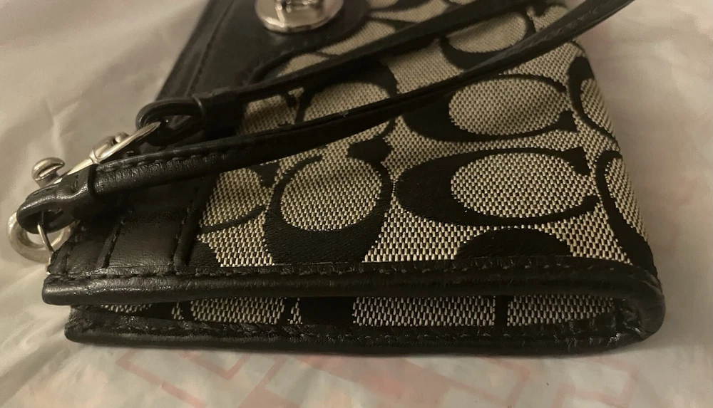 This Coach Penelope Zippy Turnlock Signature Wristlet Wallet is a stylish and functional accessory for women. Made of black leather with a solid pattern and signature character, this wallet features a strap and zipper accents. It is a large size, measuring 8 inches in width and 4 inches in length, and has credit card and folding features. The wallet is in great shape, looking like new. It is perfect for those who want a sophisticated and practical wallet to keep their essentials organized. Whether you're running errands or going out for a night on the town, this Coach wristlet wallet is a must-have accessory.