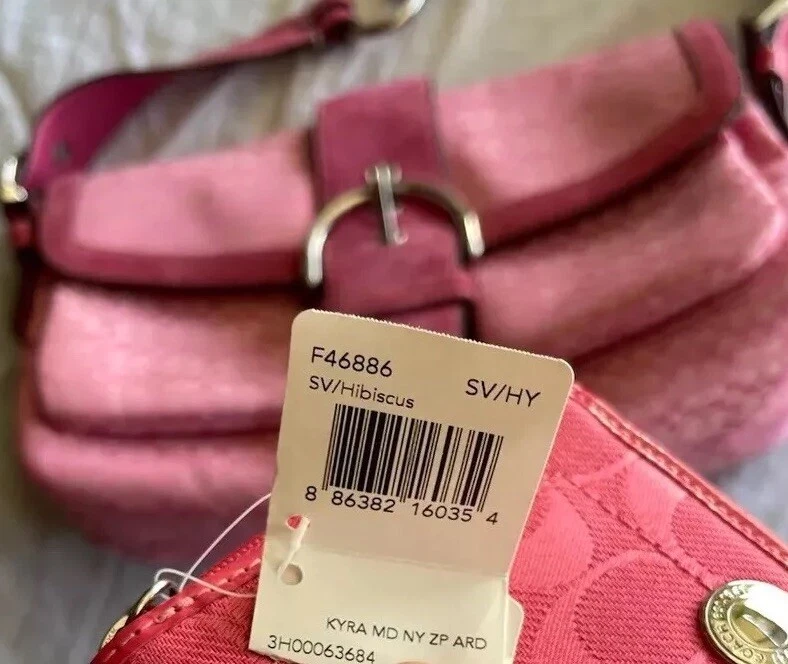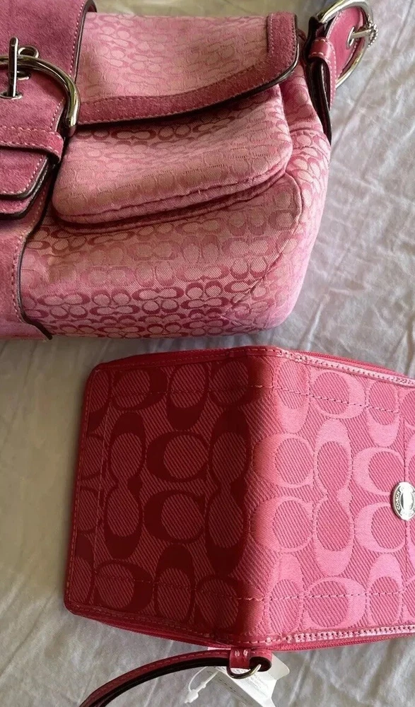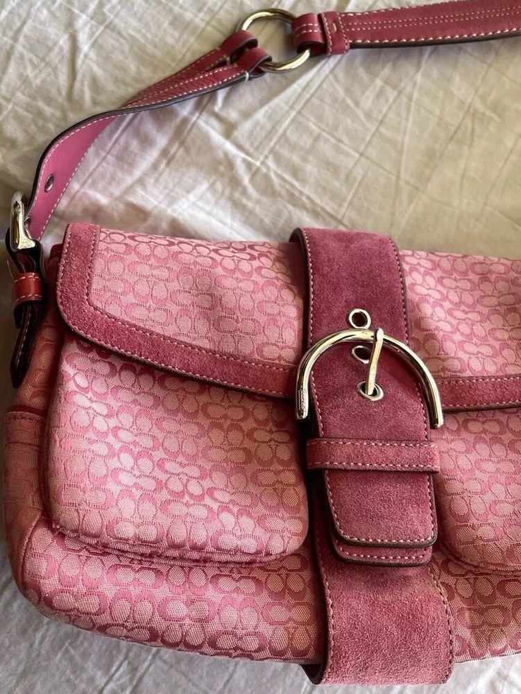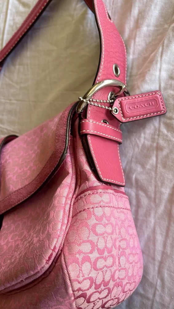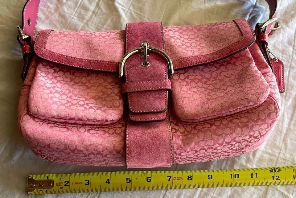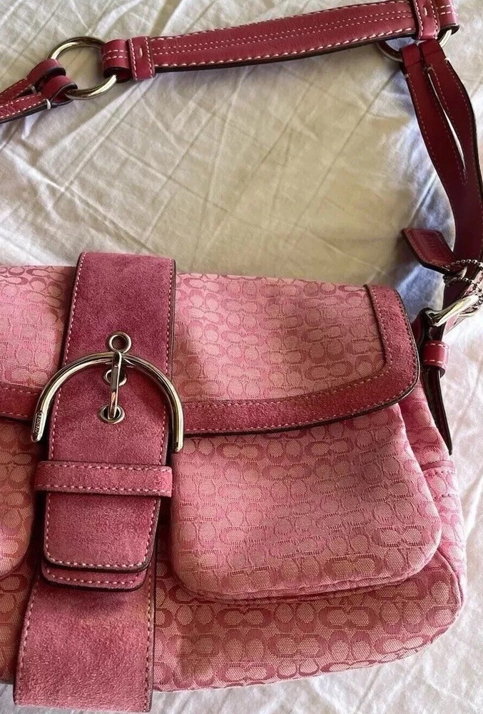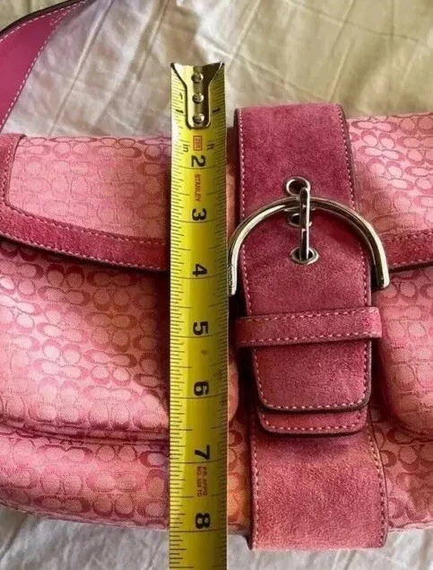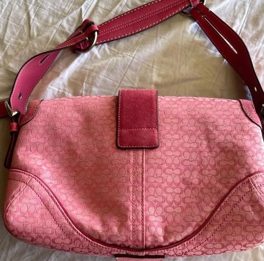 This Coach Women's Pink Signature Canvas Flap & Snap Soho Shoulder Bag Handbag Wallet is the perfect accessory for any casual or workwear outfit. With a medium size and a solid pattern, this bag is made of leather and canvas exterior material in a beautiful pink and baby pink and brown color combination. The flap and snap closure ensures the security of your belongings while the 8-inch handle drop provides a comfortable shoulder bag carrying experience. The vintage model F10926 has a brown lining color and is designed for women. It is a stylish and functional shoulder bag with a variety of compartments to store your essentials. This bag is perfect for any occasion and is sure to elevate your outfit.