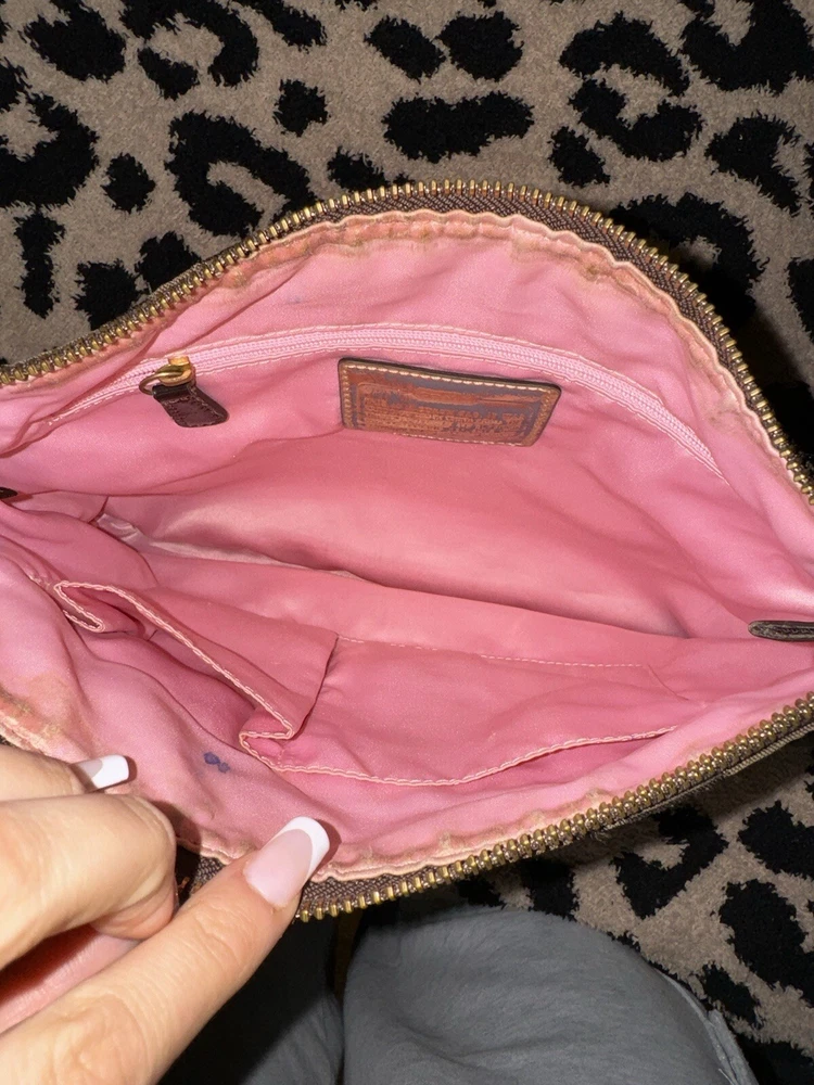 This Coach Poppy crossbody/handbag is a must-have for any fashion-forward woman. The metallic exterior material gives the bag a unique and stylish look, while the black and brown color combination adds a touch of classic elegance. The bag features a zip closure and a thin design, making it perfect for everyday use. With a size of 12 inches in width and 10 inches in height, this medium-sized bag is spacious enough to carry all your essentials. The bag also has a black lining color and features the Coach Poppy logo pattern, adding a designer, Y2K, and punk vibe to the overall look. The strap drop measures 7 and 23 inches, making it convenient to carry on your shoulder or across your body. This Coach Poppy crossbody/handbag is a perfect addition to any collection and is sure to make a statement wherever you go.