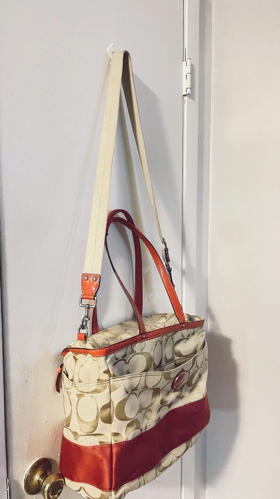 Like New and Excellent Condition! Coach Sateen shoulder bag is a stylish and versatile accessory for any woman. With a bright pink exterior and ivory lining, it features a zip closure and double handles with an 8-inch drop. The bag has a large size of 18 inches in width, 12 inches in height, and 6 inches in depth, making it perfect for travel, casual outings, or business meetings. Very clean inside and out. Used one time. No stains rips or tears. The bag also has a vintage feel with a logo pattern and silver and gold hardware. It includes several features such as a bottle pocket, inner pockets, and an adjustable strap. The nylon lining material and satin exterior material ensure durability and elegance. This Coach Sateen shoulder bag is a must-have for any fashion-conscious woman.