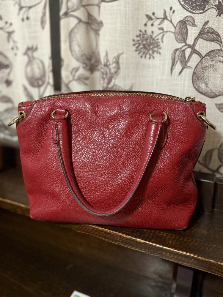 Authentic Coach pebbled leather satchel in a beautiful deep red/oxblood color. This bag features Coach’s signature high-quality leather, gold-tone hardware, and classic “C” charm. Structured yet soft. The leather is in great condition with light natural wear. Zipper closure keeps everything secure, and the roomy interior easily fits daily essentials. • Authentic Coach handbag • Pebbled leather • Deep red / oxblood color • Gold-tone hardware with “C” charm • Top zipper closure • Dual top handles good pre-owned condition. No major flaws.