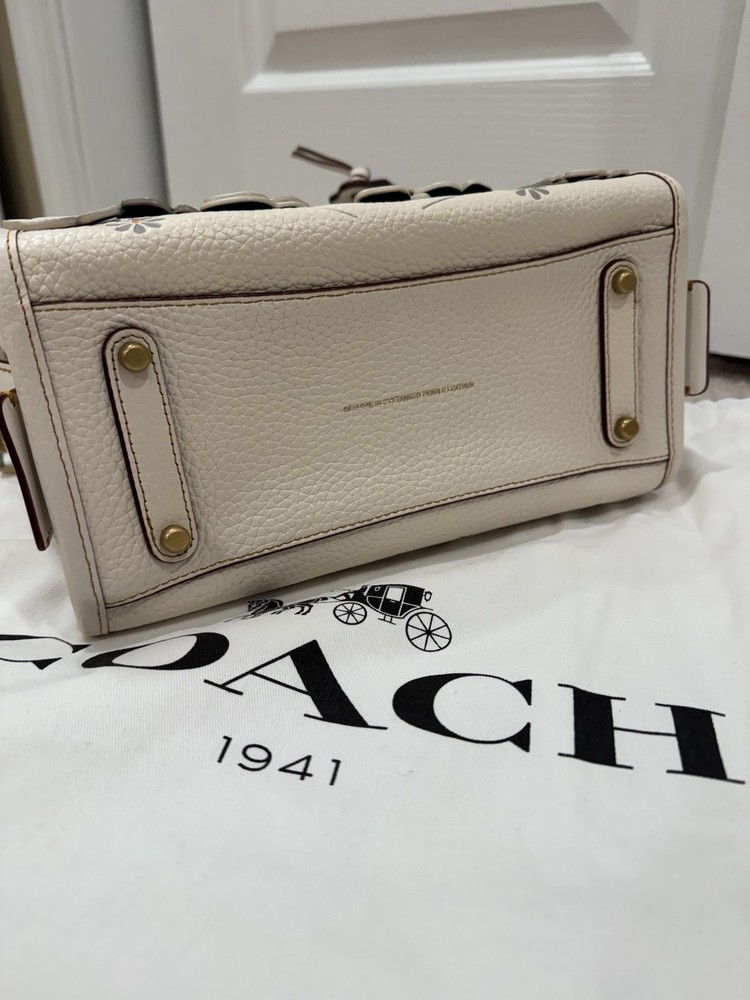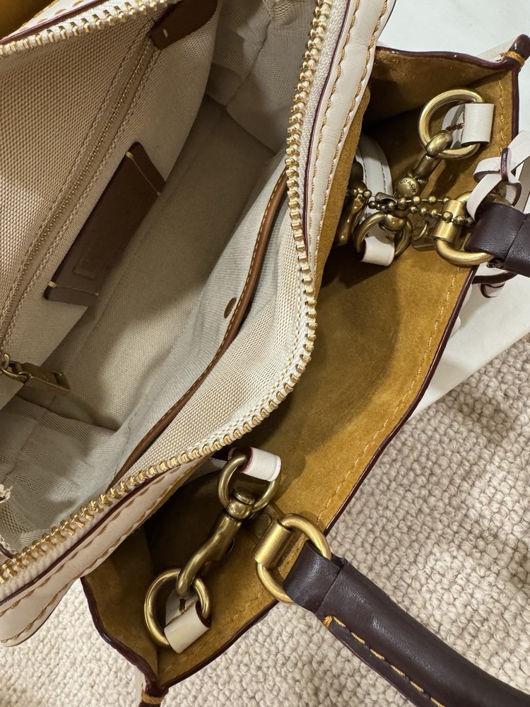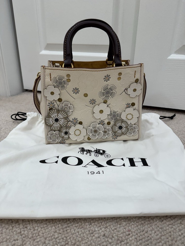 The Coach Rogue 25 58840 Tea Rose 2way Leather Tote Shoulder Handbag is a luxurious and stylish accessory designed for women. Made with high-quality white leather, this shoulder bag features the iconic Coach Rogue model with a beautiful rose theme, adding a touch of elegance to any outfit. The versatile design allows it to be carried as a shoulder bag or a tote, making it a practical yet chic choice for any occasion. Perfect for adding a feminine and sophisticated touch to your wardrobe. New without tags - never used. Original price $850.