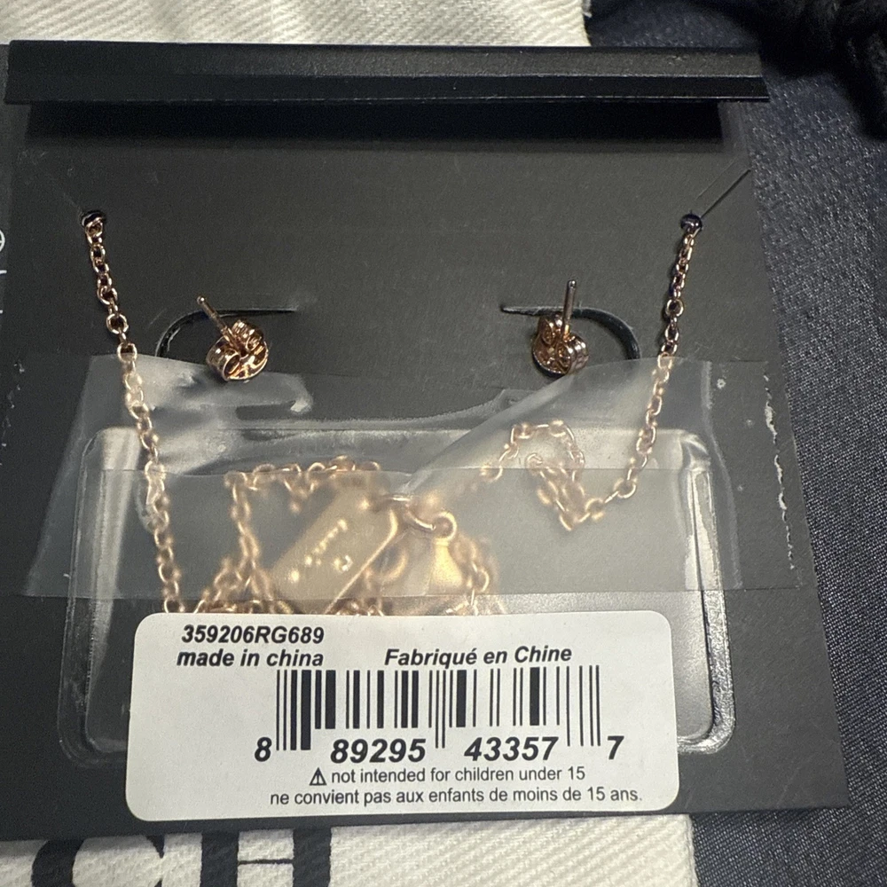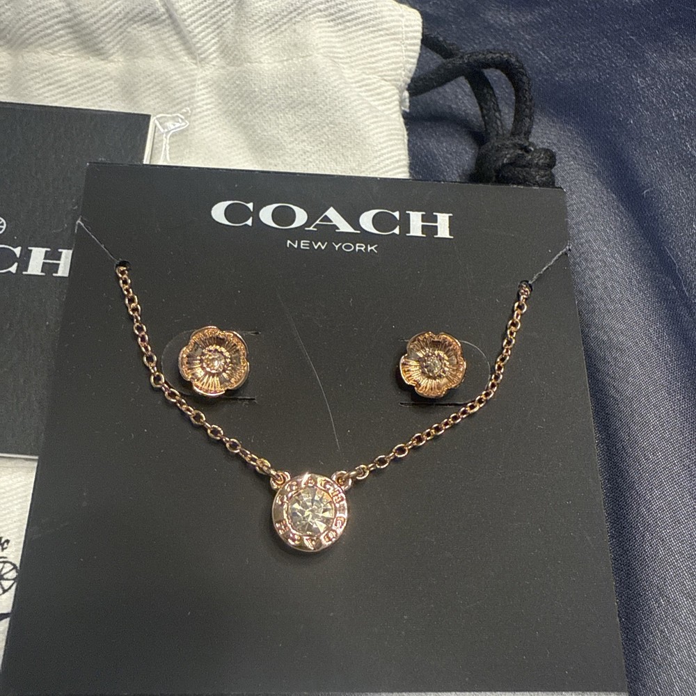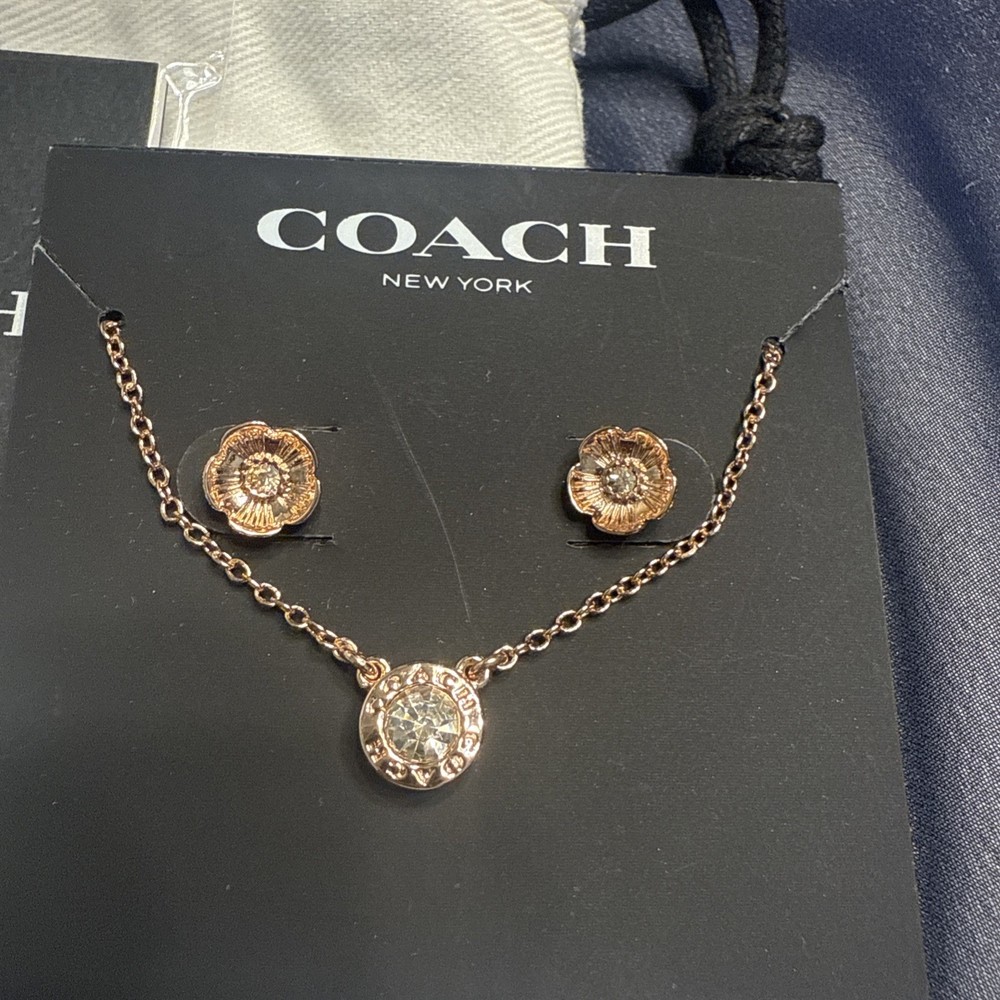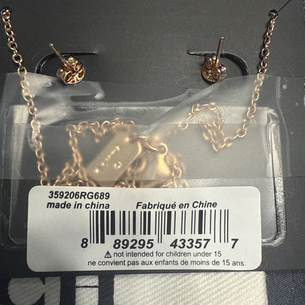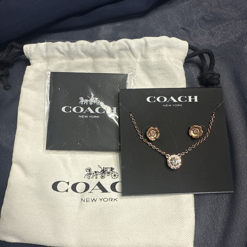 This Coach jewelry set includes an open circle necklace and tea rose stud earrings, all made of beautiful rose gold. The set also comes with a bag for easy storage and transportation. The necklace features an adjustable chain for a perfect fit, and both pieces are signed by Coach. The set is brand new with tags and was made in China.