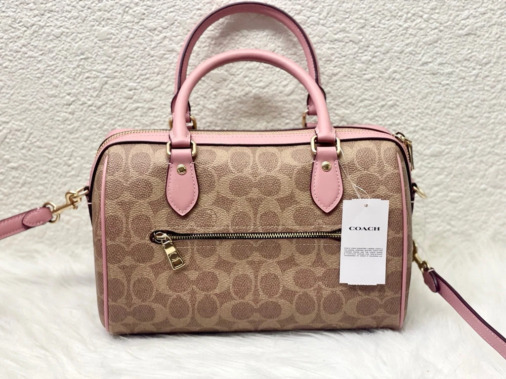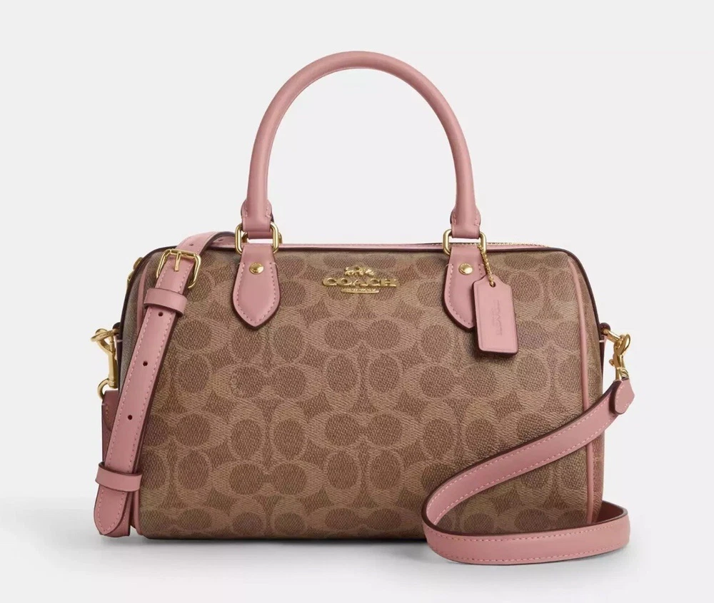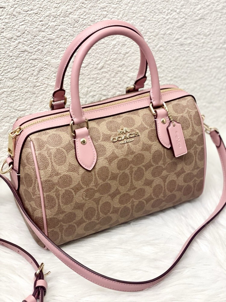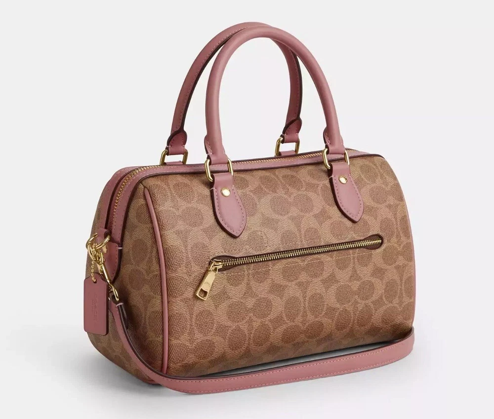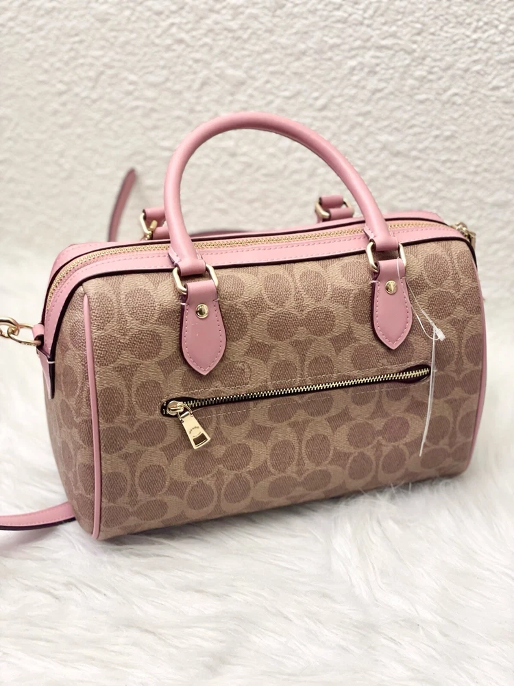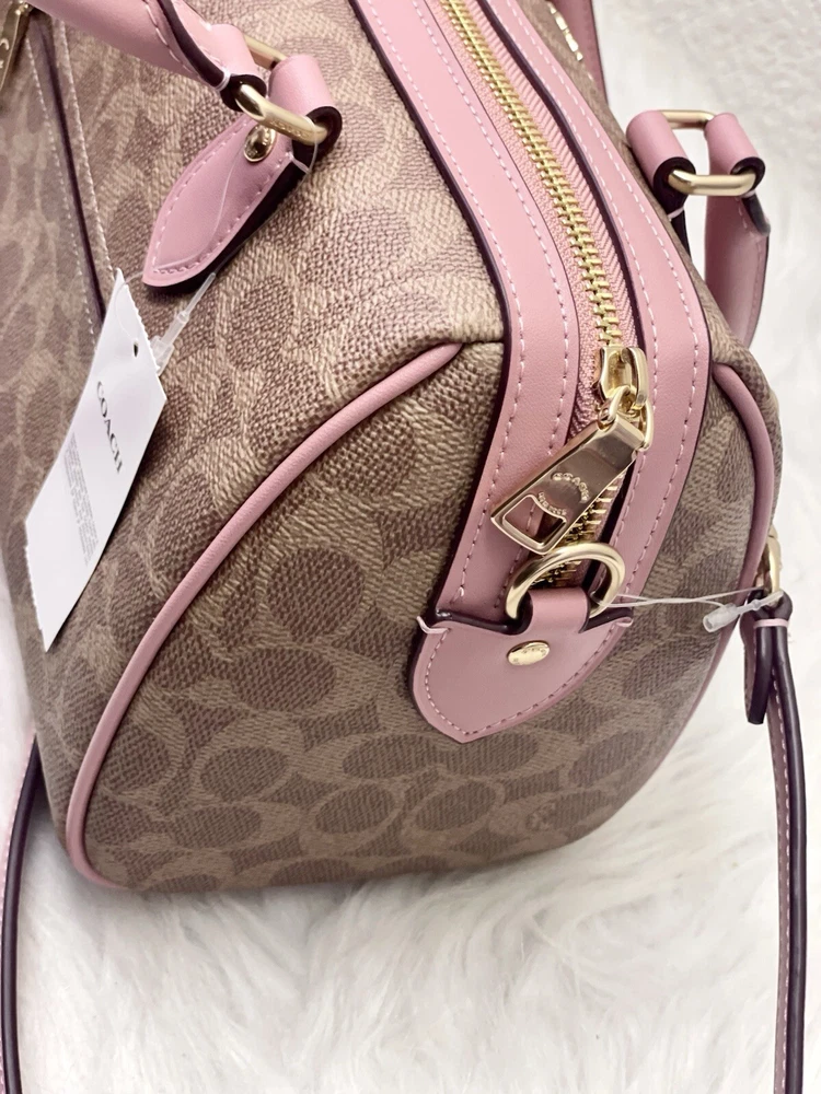 Coach Rowan Satchel Bag In Signature Canvas Brand new with tags 100% Authentic Limited Edition Color: Tan/ Pink petal Style Number CV961 Measurements Length: 10.0" Height: 6.5" Width: 5.5" Materials Signature coated canvas Fabric lining Handle Handles with 4.25" drop Strap Detachable strap with 23" drop for shoulder or crossbody wear Features Outside zip pocket Zip and multifunction pockets Zip closure Price is firm
