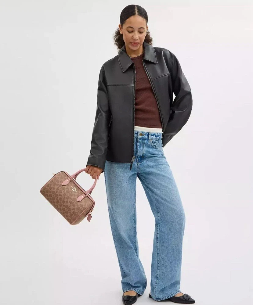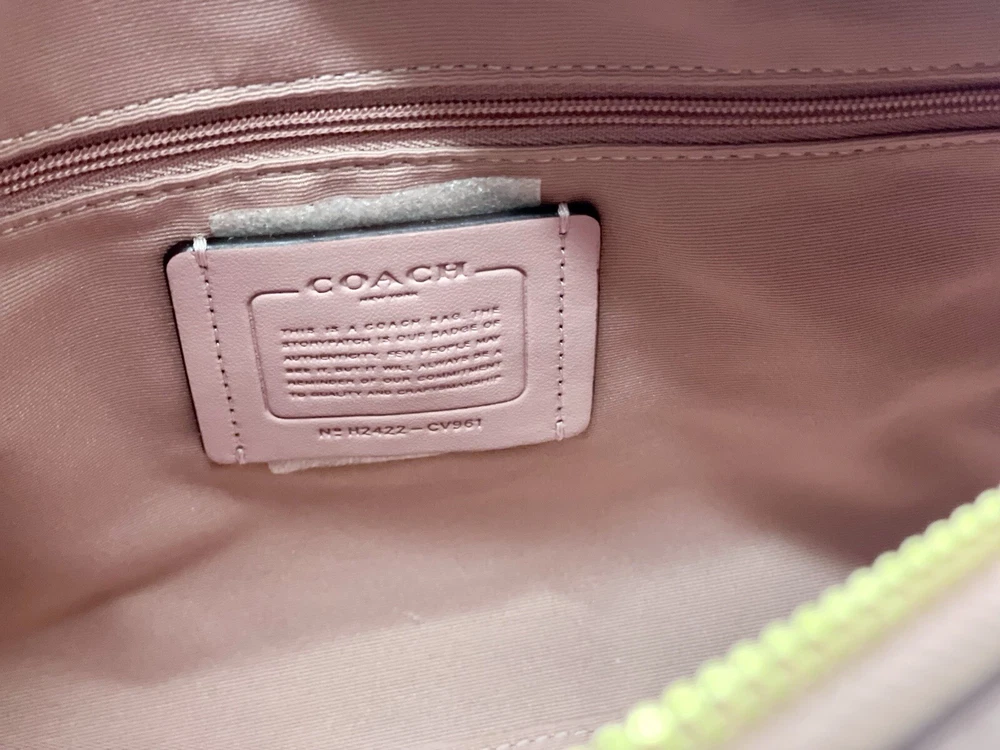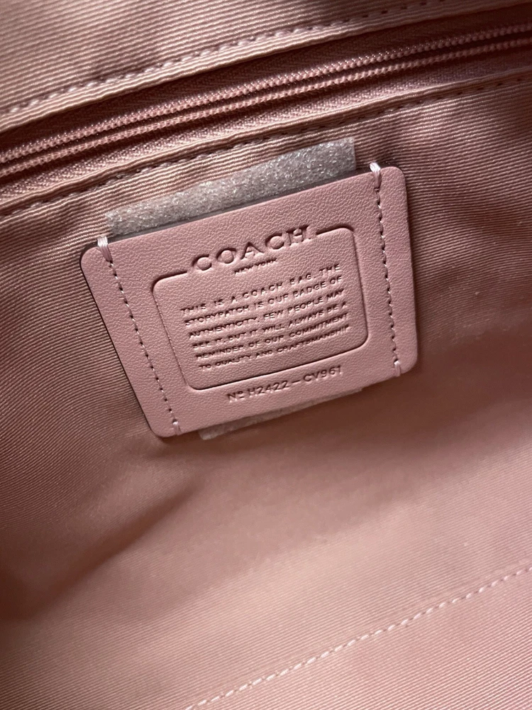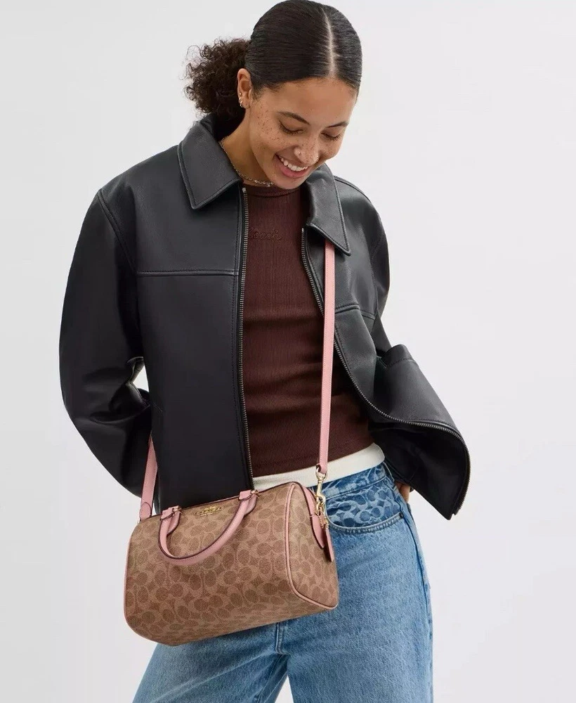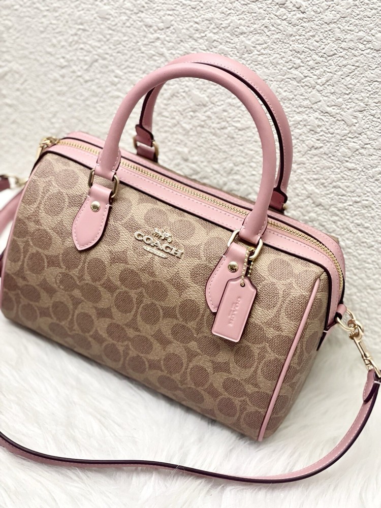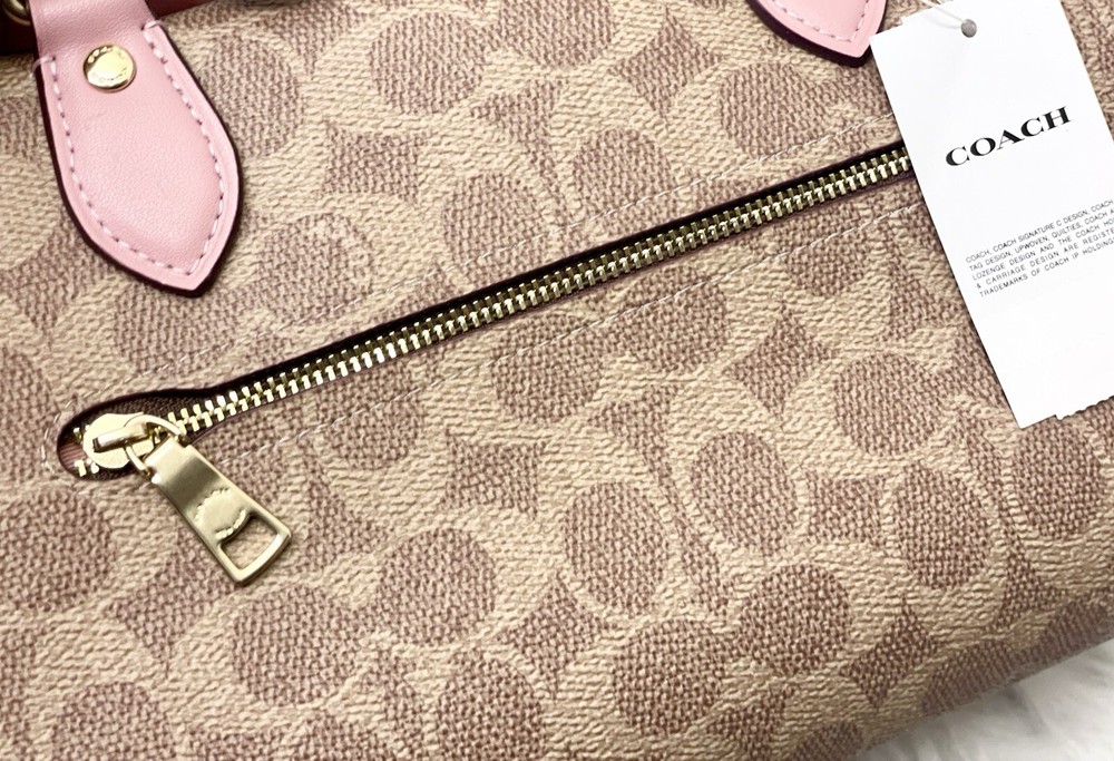 Coach Rowan Satchel Bag In Signature Canvas Brand new with tags 100% Authentic Limited Edition Color: Tan/ Pink petal Style Number CV961 Measurements Length: 10.0" Height: 6.5" Width: 5.5" Materials Signature coated canvas Fabric lining Handle Handles with 4.25" drop Strap Detachable strap with 23" drop for shoulder or crossbody wear Features Outside zip pocket Zip and multifunction pockets Zip closure Price is firm